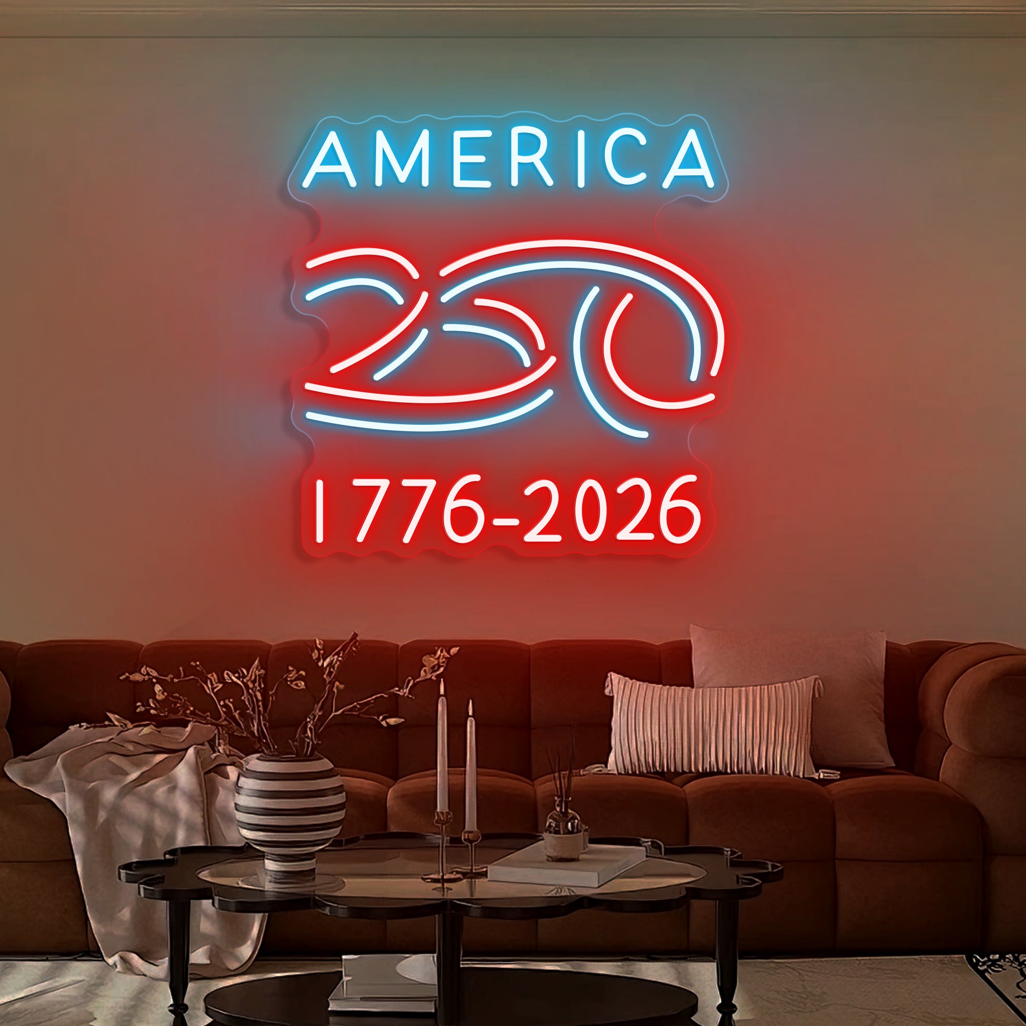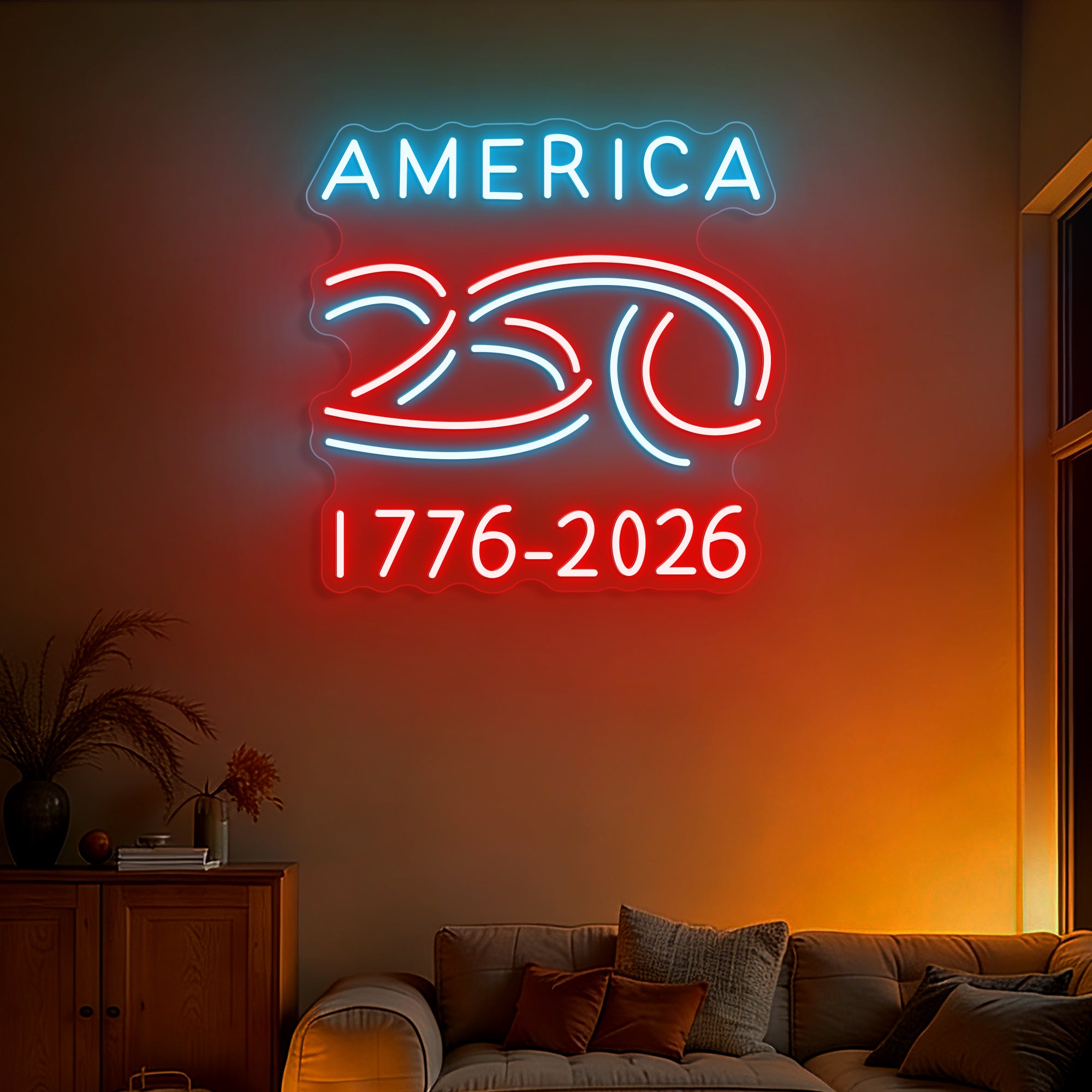 The America 1776-2026 250th Celebration Neon Sign is a luminous tribute to a nation's quarter-millennium legacy. This meticulously designed piece captures the essence of a historic milestone, blending national identity with symbolic celebration. The ribbon-shaped “250” symbolizes the continuity and unity of the American story, elegantly framed by the nation's name and its defining timeline. Perfect for government buildings, community centers, historical societies, schools, businesses, and the homes of proud patriots, it is more than a sign—it is a statement of heritage, resilience, and optimism for the future. It is designed to be the centerpiece of 250th-anniversary celebrations, sparking conversation and commemorating a shared history.