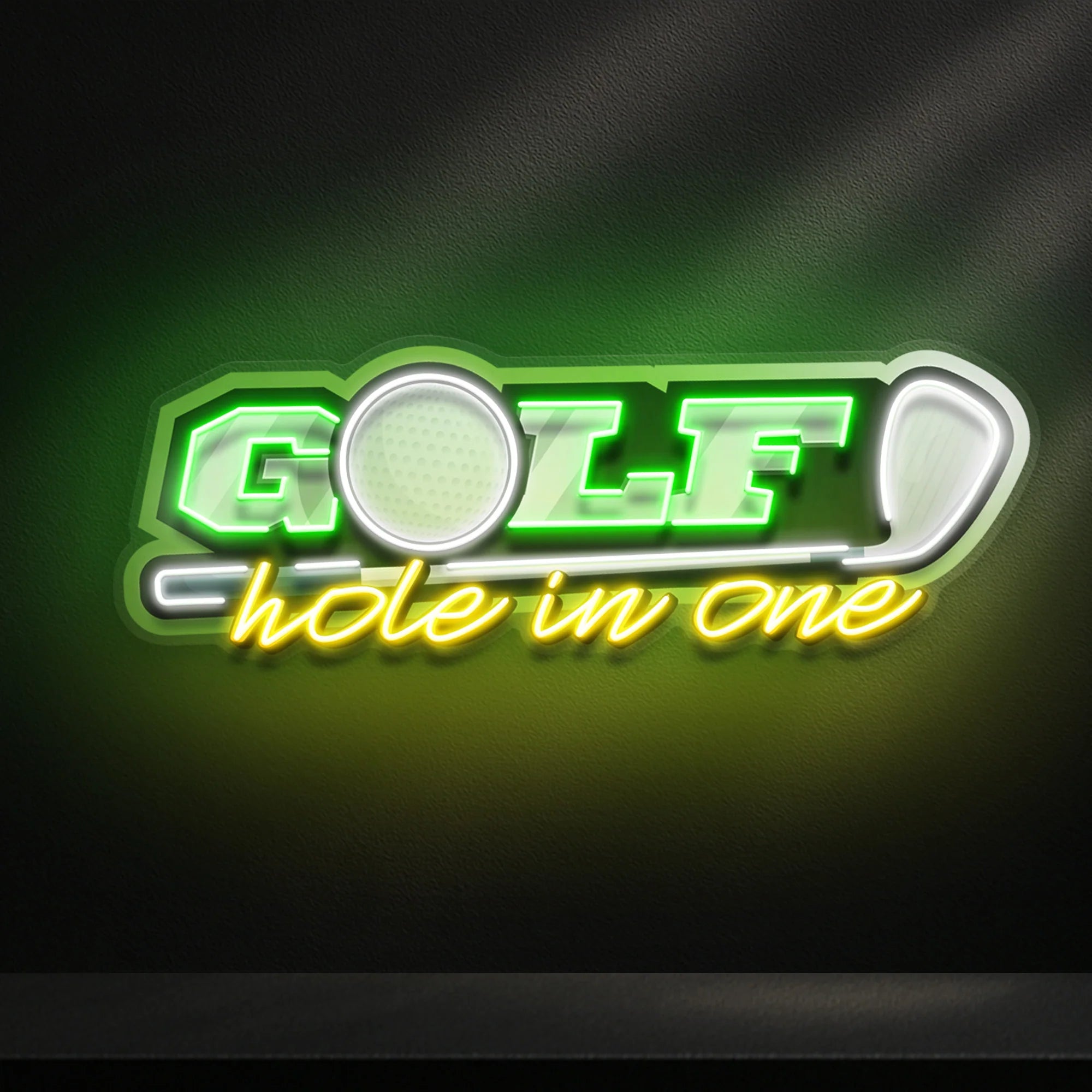 Clever & Iconic Typography and Graphic Design: This sign is a hole-in-one when it comes to clever sports decor. It features the word “Golf” rendered in a bold, confident font, but with a brilliant design twist: the letter “O” is artfully replaced by a stunning, high-fidelity UV-printed golf ball—dimpled, glossy, and ready to be struck. Complementing this clever wordplay is a beautifully detailed golf club, poised as if just executed the perfect swing. Below, the triumphant phrase “Hole in one” appears in an elegant, celebratory font, capturing the magic of that rarest and most thrilling shot in the game. This intentional fusion of typography and imagery transforms a simple sport name into a luminous celebration of golf's greatest achievement. Expertly crafted on premium acrylic with smooth, radiant LED neon outlining the entire composition, it turns every golfer's dream into a permanent, glowing work of art.