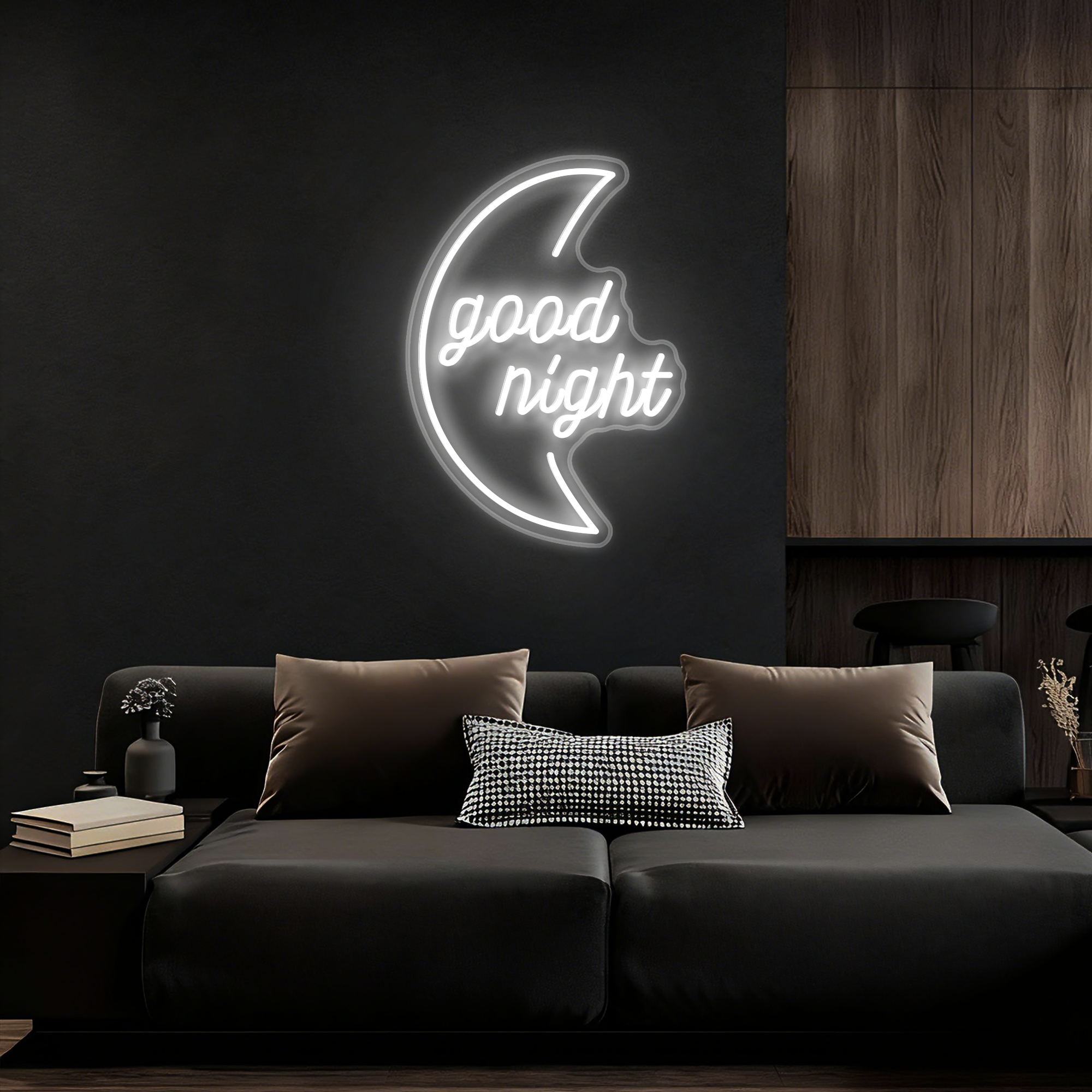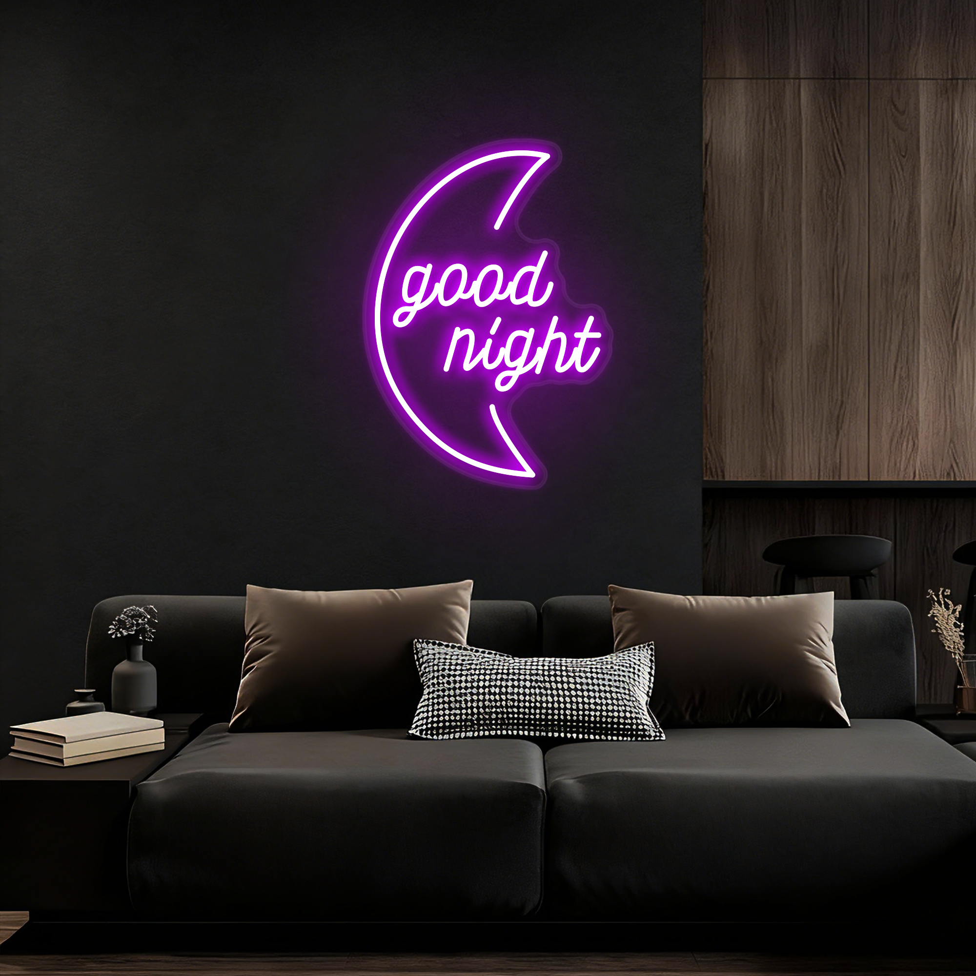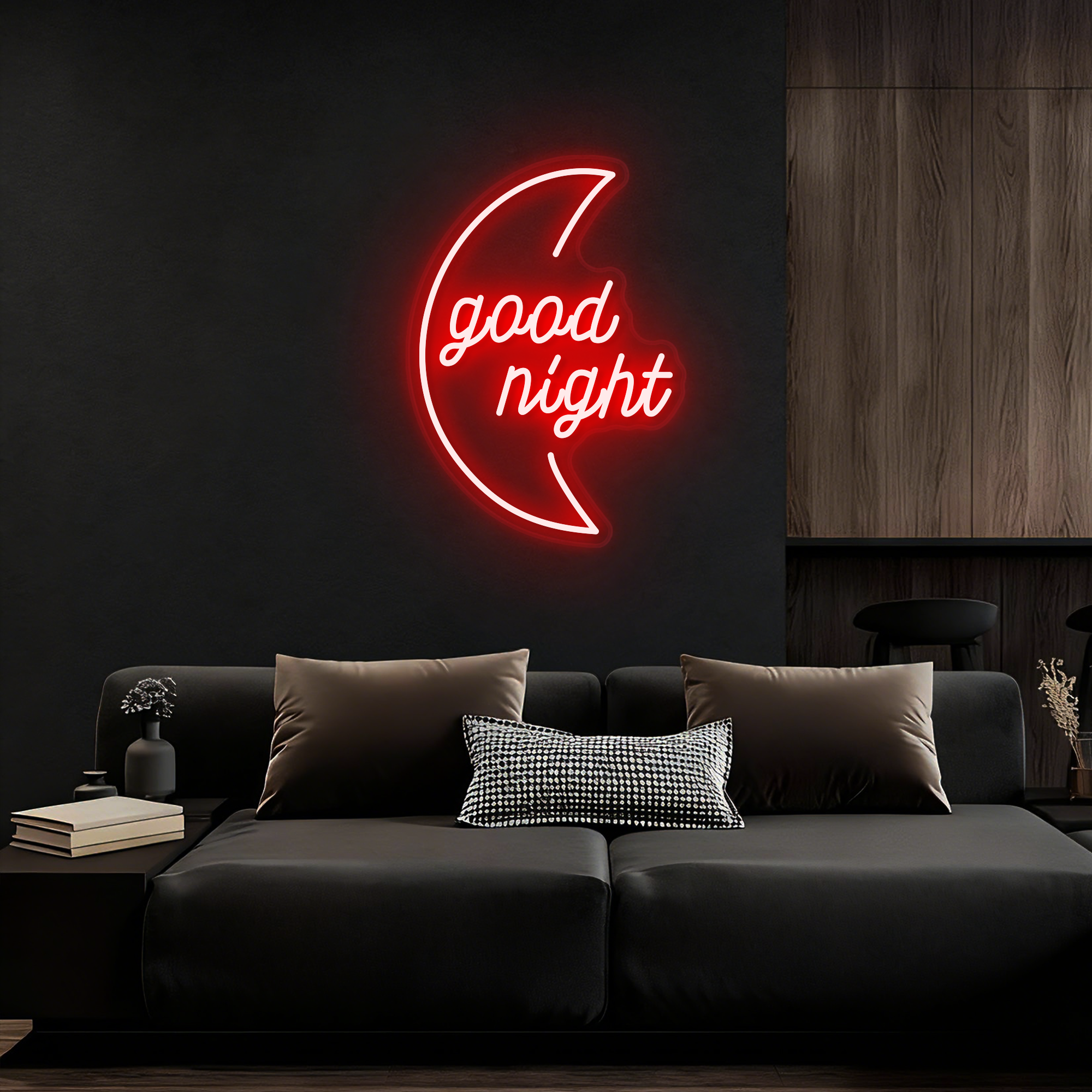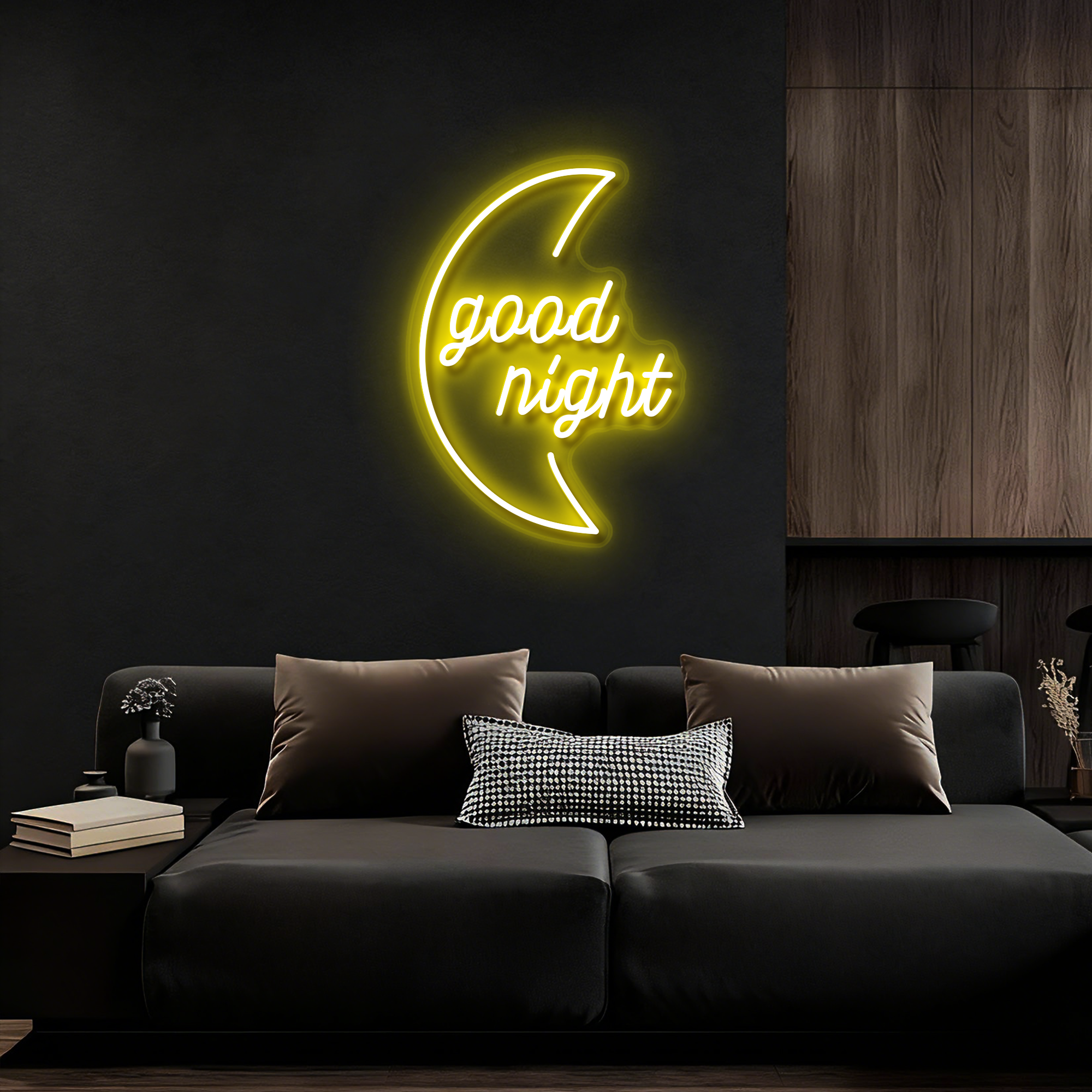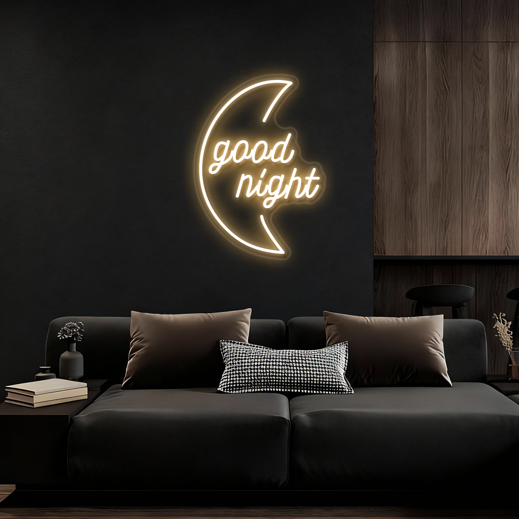 Serene Celestial Design: This calming sign features a gentle crescent or full moon silhouette, with the soothing phrase “Good Night” gracefully integrated at its center. Crafted from smooth, soft-glow LED neon lines, it creates a peaceful and dreamy visual perfect for winding down.