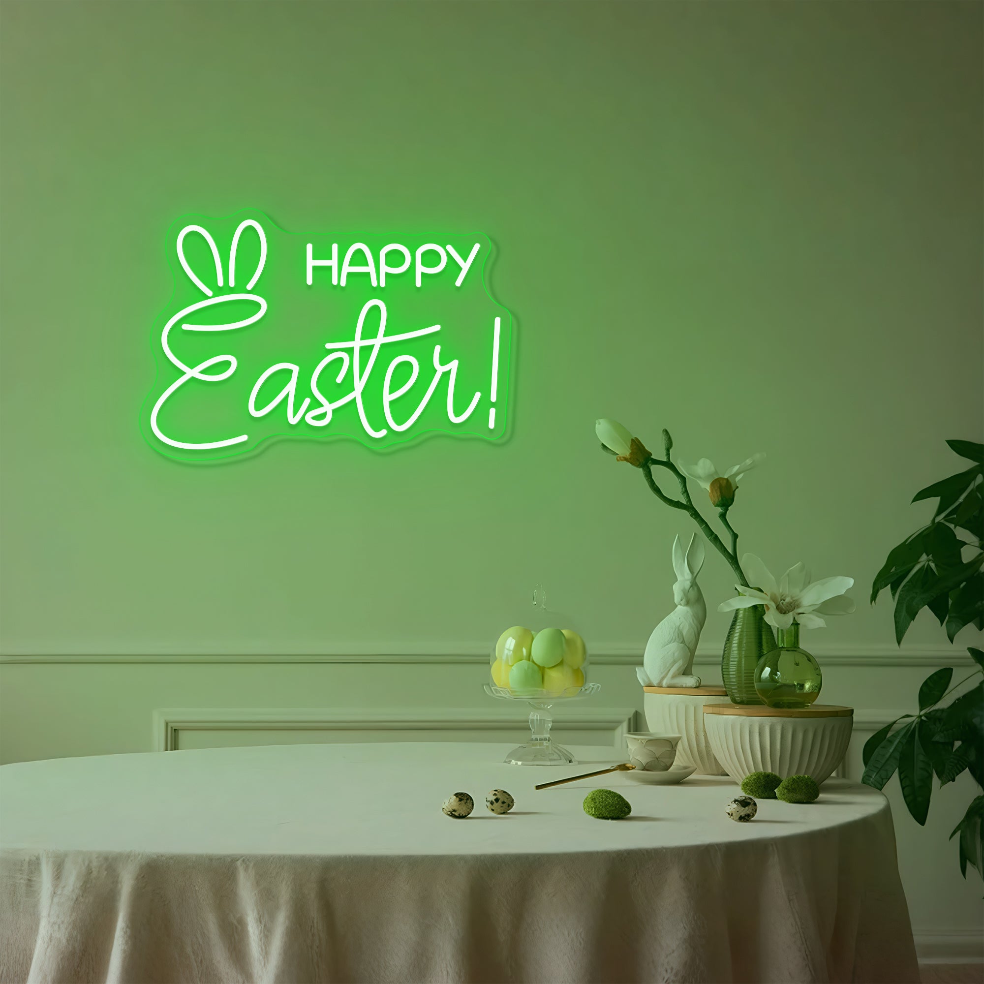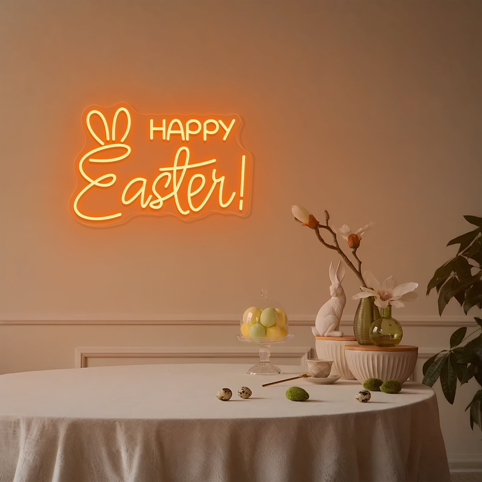 Soft & Magical Glow: Emits a gentle, enchanting light that captures the wonder of Easter morning. The “Happy Easter” lettering glows in classic holiday pastels such as soft pink, buttercream yellow, gentle lavender, or warm white, while the bunny ears above add a playful touch with their own warm, inviting glow in complementary shades. This even, cheerful illumination makes every element—the joyful greeting, the perky ears—appear to glow with life, casting a light that is both sweetly nostalgic and irresistibly fun. Perfect for creating a magical atmosphere that makes every child believe the Easter Bunny is real.
