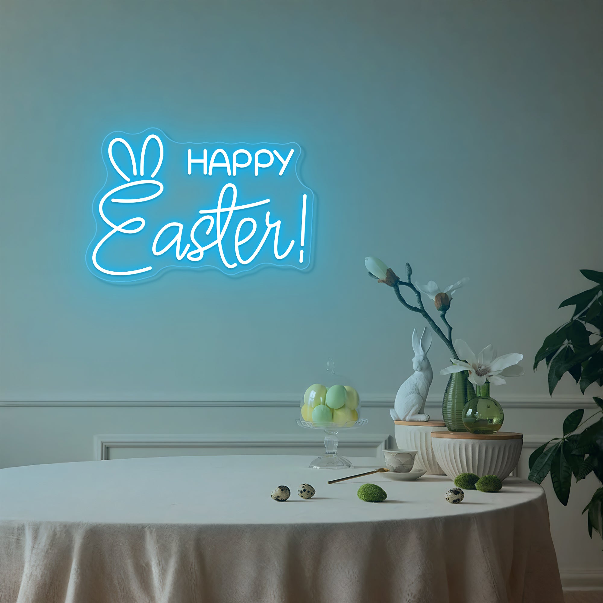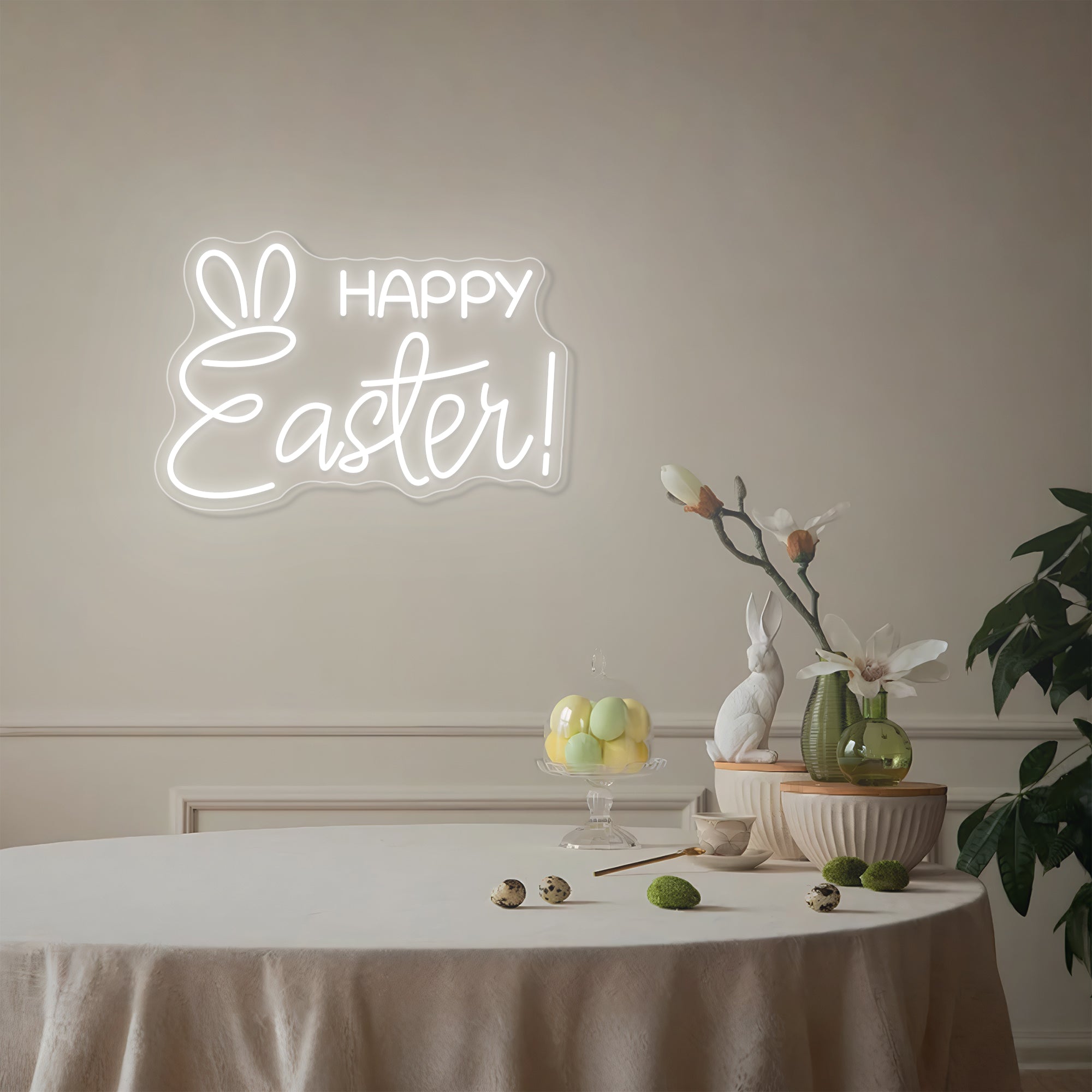 Whimsical & Expressive Typography Design: This charming sign brings the magic of Easter to life with a delightful typographic surprise. It features the warm holiday greeting “Happy Easter” in a friendly, inviting font—perhaps a rounded, cheerful typeface that feels as joyful as the spring season itself. But the real magic lies in the playful detail above the letter “E”: a pair of long, floppy bunny ears, perfectly positioned as if the letter itself has come to life as the Easter Bunny's face. This intentional fusion of text and character transforms a simple greeting into a living, glowing personality that peeks out from your wall with silent, joyful charm. Expertly crafted on premium acrylic with smooth, radiant LED neon outlining the entire composition, it turns Easter's most beloved symbol into a permanent, heartwarming celebration of springtime joy.
