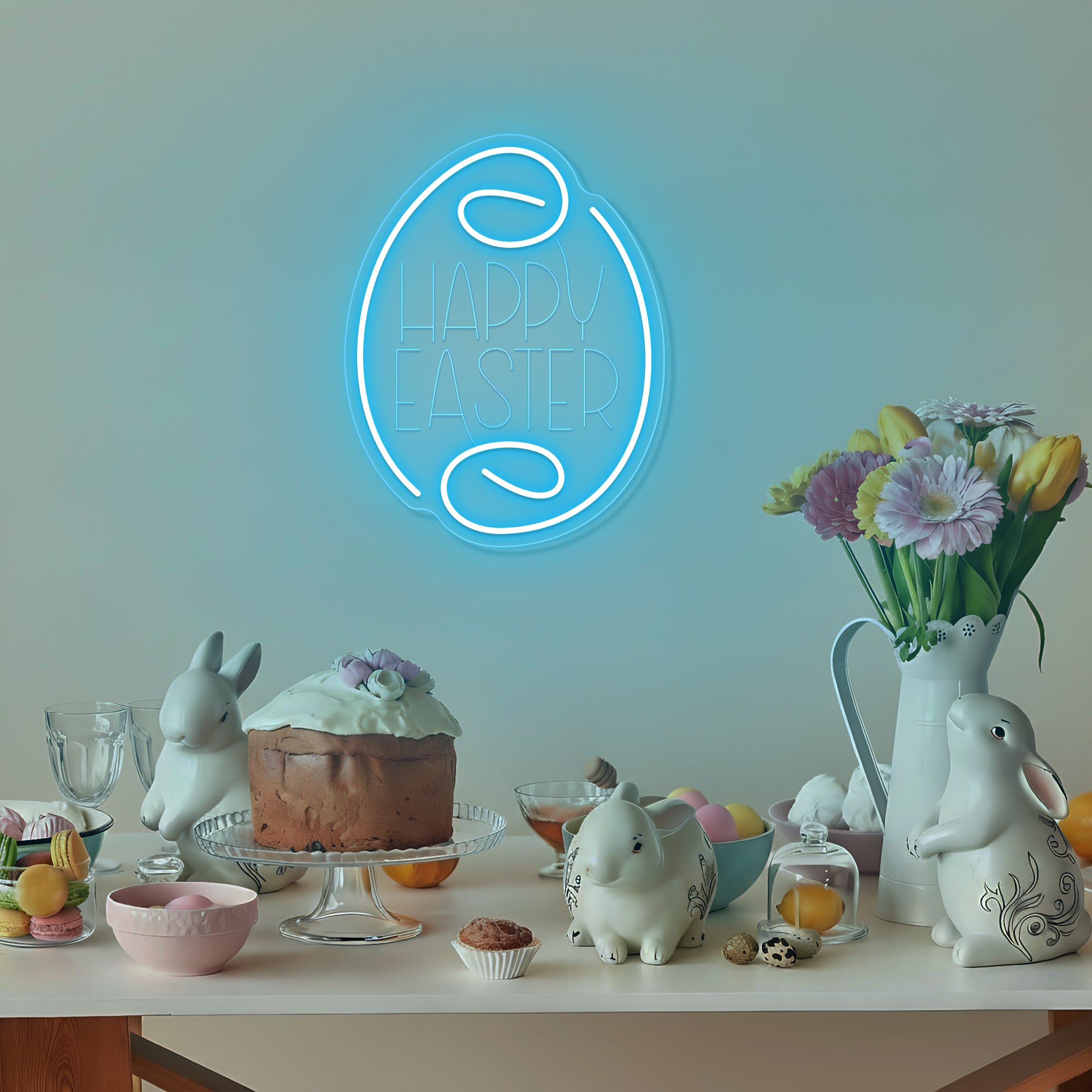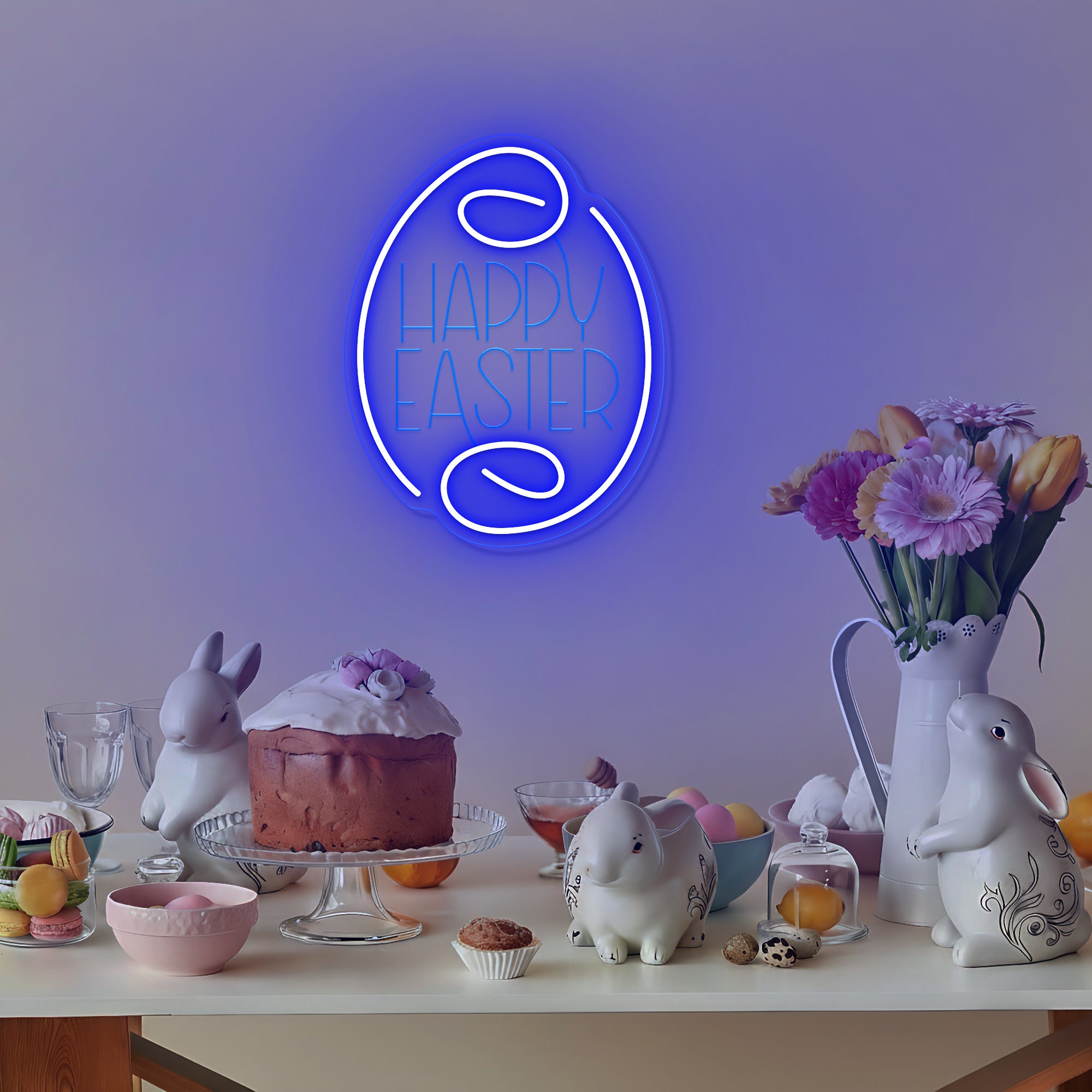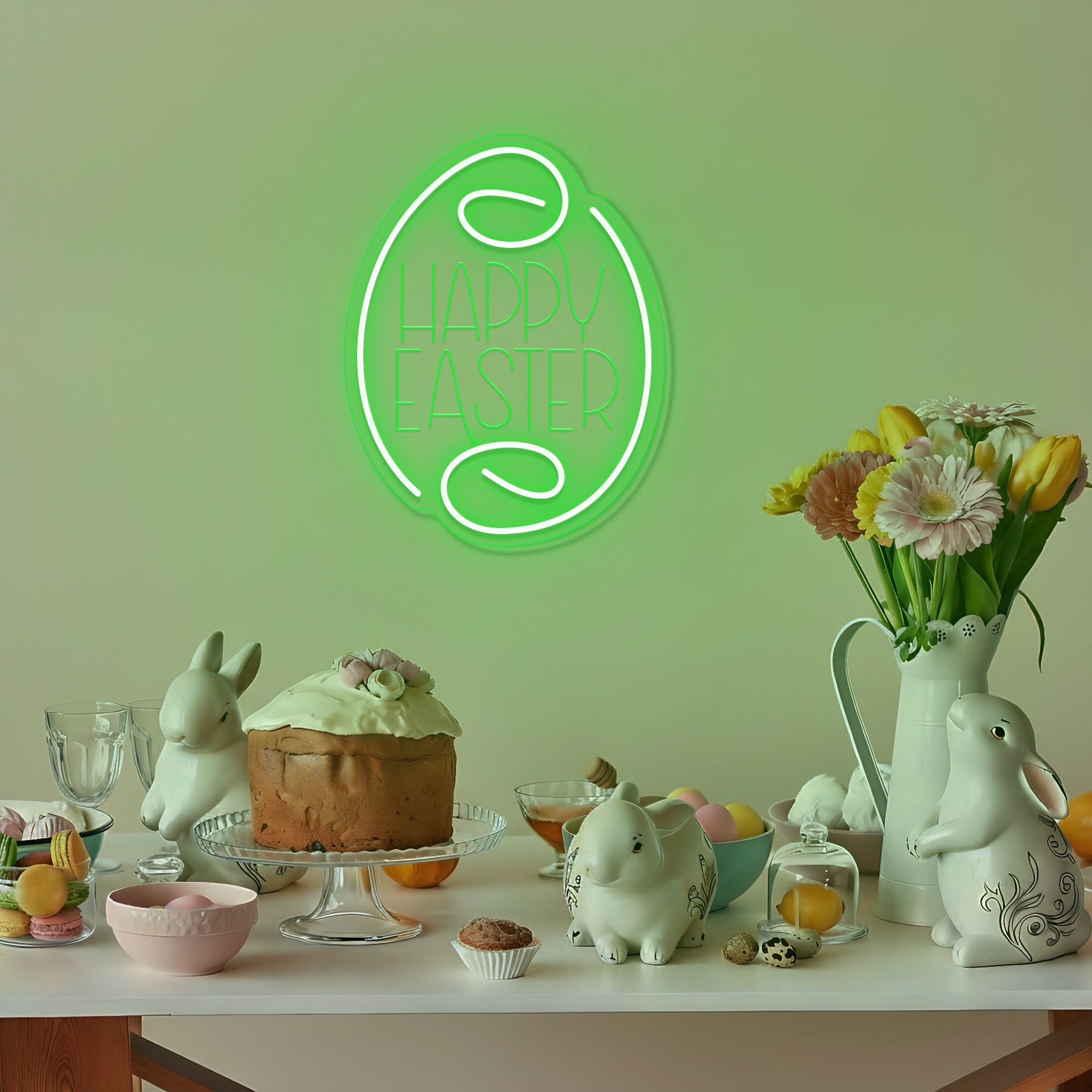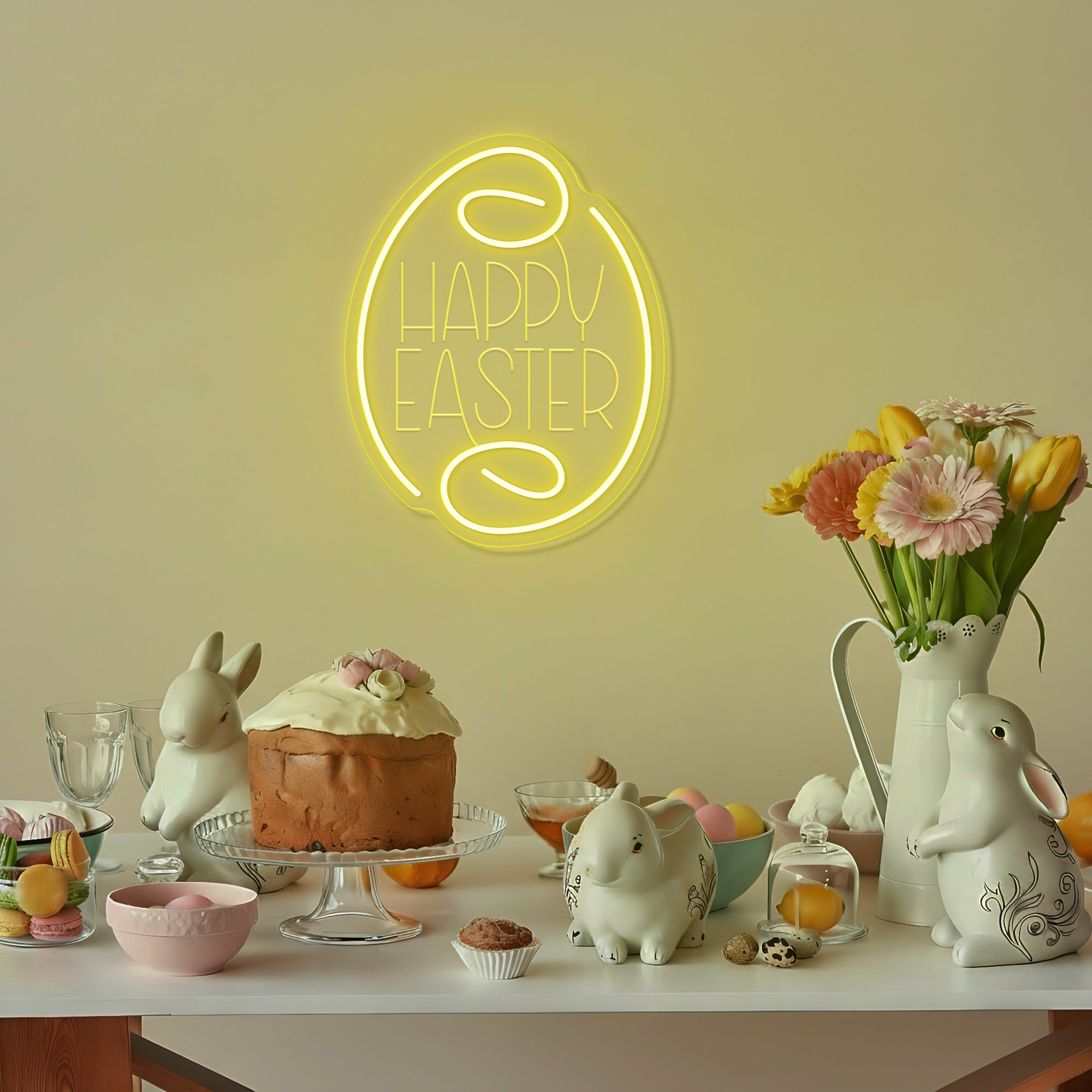 Festive & Symbolic Egg-Shaped Design: This enchanting sign captures the very essence of Easter in a beautifully integrated design. It features a luminous, continuous LED neon outline in the shape of a classic Easter egg—smooth, rounded, and full of springtime promise. Within this glowing shell, intricately engraved and UV-printed lettering reveals the joyful greeting “Happy Easter,” nestled safely inside like a precious treasure waiting to be discovered. The intentional fusion of the egg's protective form and the heartfelt message within symbolizes the hope, renewal, and hidden joys of the Easter season. Expertly crafted on premium acrylic with smooth, radiant LED neon forming the outer egg and detailed engraving bringing the message to life, it turns a beloved holiday symbol into a permanent, glowing celebration of spring's greatest promise.