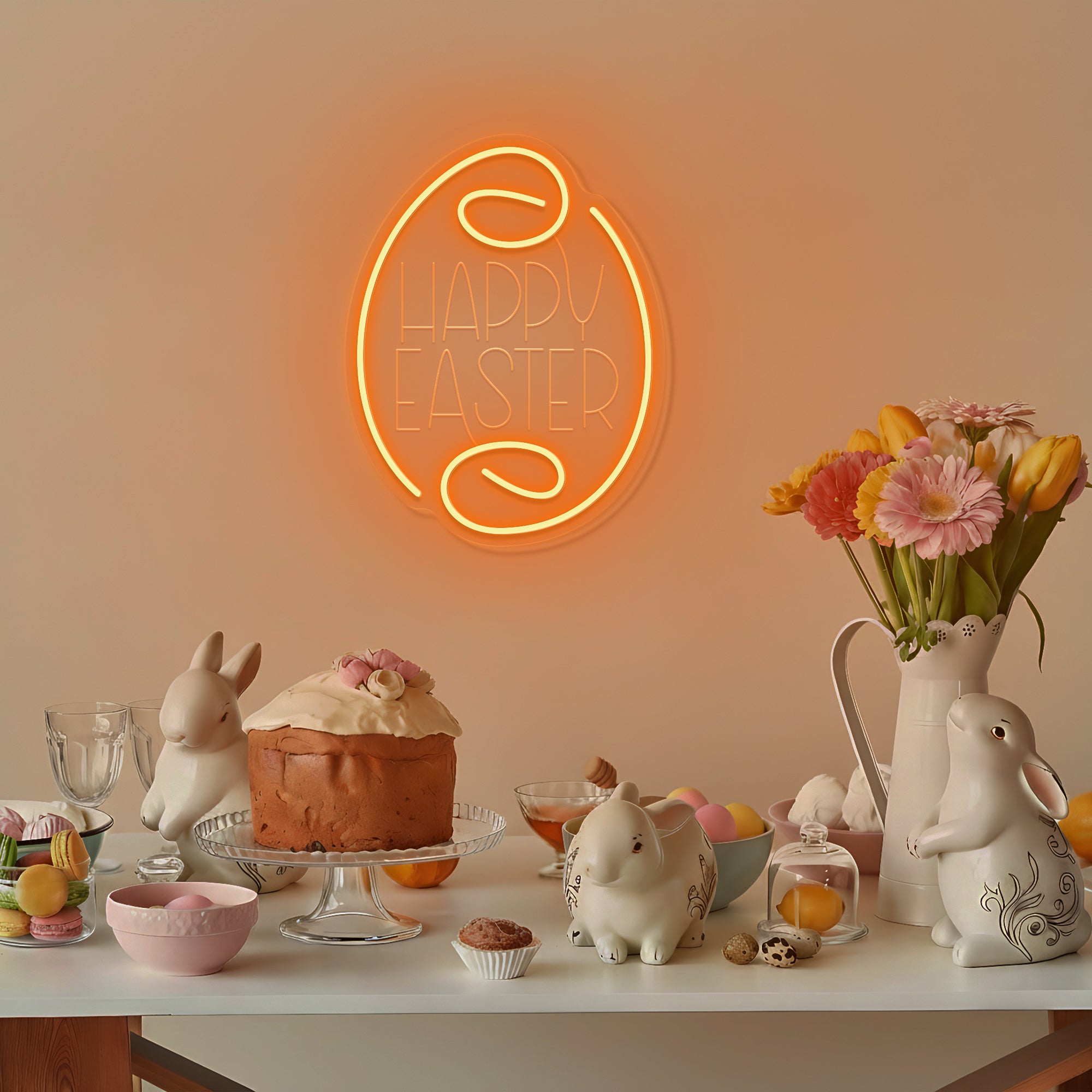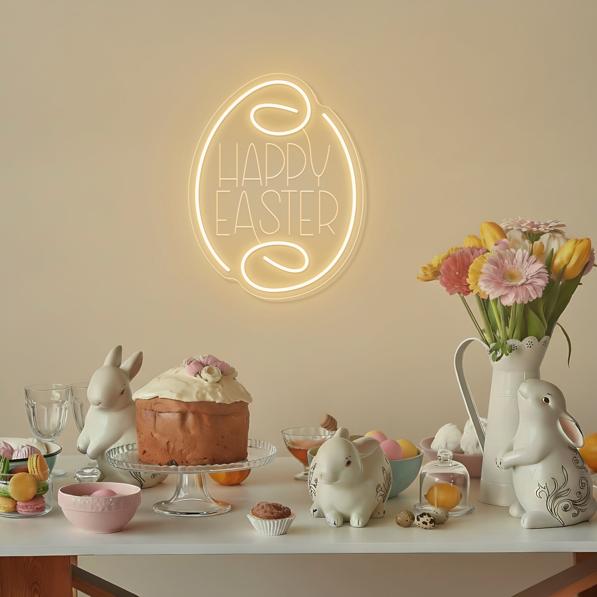 Soft & Festive Glow: Emits a gentle, inviting light that radiates the warmth and joy of Easter morning. The outer egg-shaped neon glows in classic Easter pastels such as soft pink, buttercream yellow, gentle lavender, or mint green, while the engraved “Happy Easter” lettering within catches and reflects this light with its own warm, ambient radiance. This even, harmonious illumination makes the egg appear to cradle the message in a soft, protective glow, casting a light that is both sweetly nostalgic and freshly modern—perfect for creating a magical holiday atmosphere.