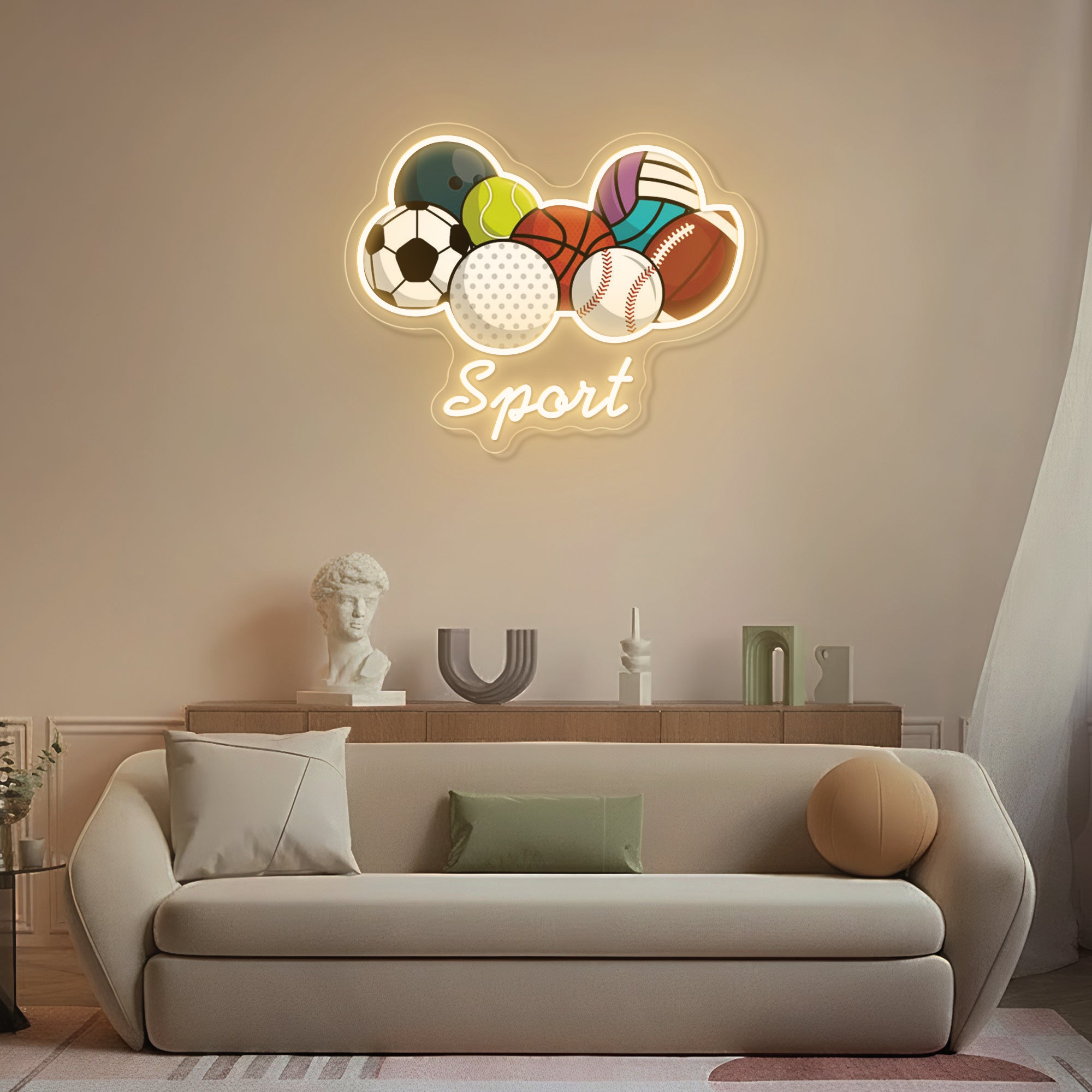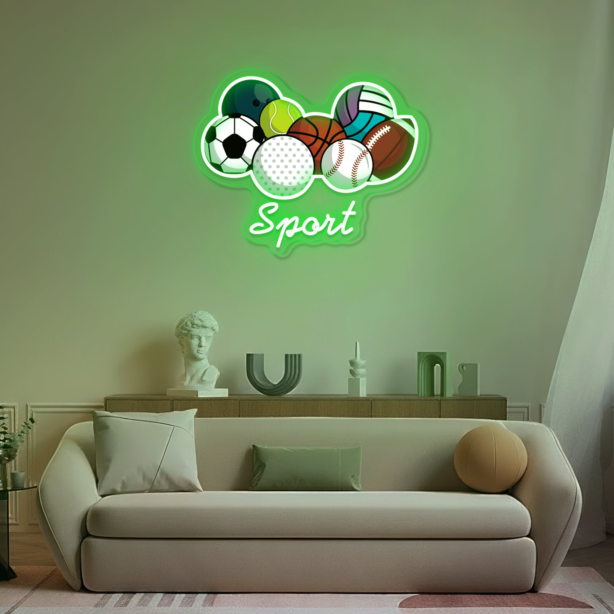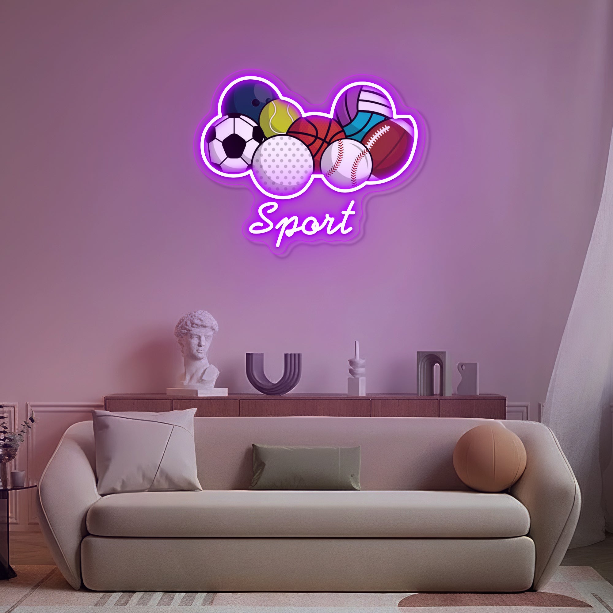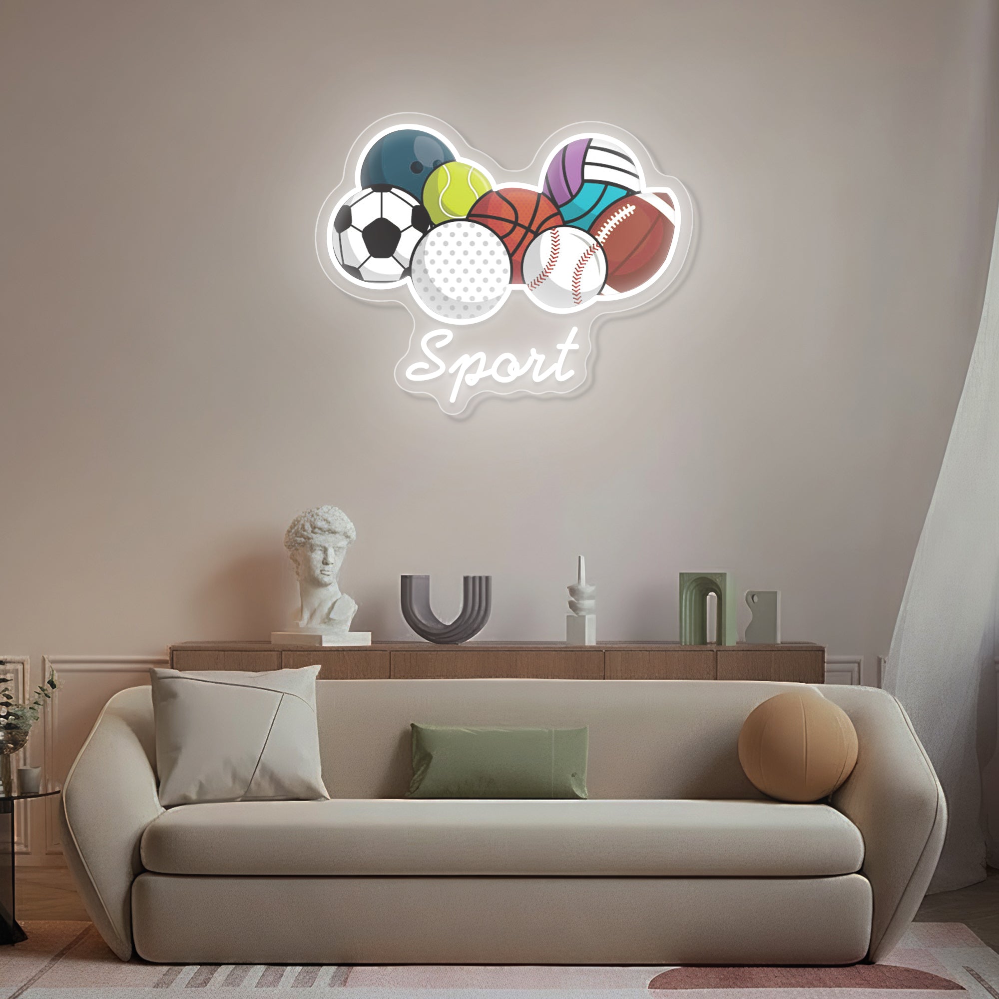 Dynamic & Multi-Sport Graphic Design: This energetic sign is a ultimate celebration of athletic passion, bringing together the icons of multiple sports in a single, vibrant composition. At the top, a stunning array of high-fidelity UV-printed sports balls is beautifully rendered—perhaps a basketball with its distinctive grooves, a soccer ball with its classic black and white pentagons, a baseball with its signature red stitching, a tennis ball in its fuzzy neon yellow, and a volleyball with its unique panel design. Each ball is captured with meticulous detail, creating a dynamic visual tribute to the games we love. Below this athletic showcase, the powerful word “Sport” glows in bold, confident LED neon lettering, anchoring the composition and declaring the theme with unmistakable clarity. This intentional fusion of detailed UV imagery and luminous typography transforms a simple word into a permanent, glowing celebration of the athlete's spirit. Expertly crafted on premium acrylic, it turns your love for the game into a stunning piece of sports-inspired wall art.