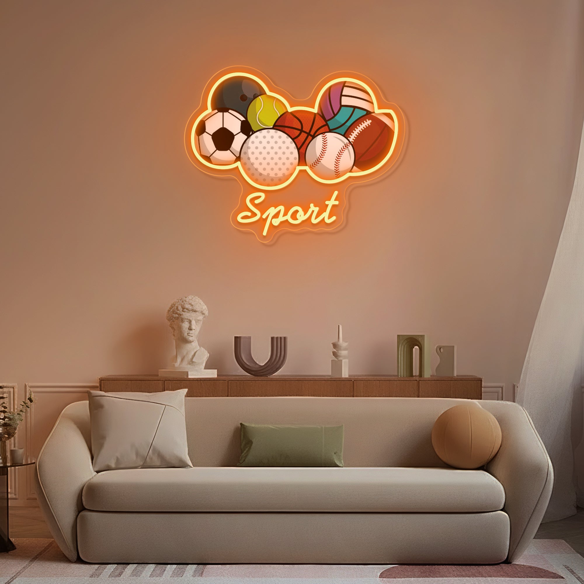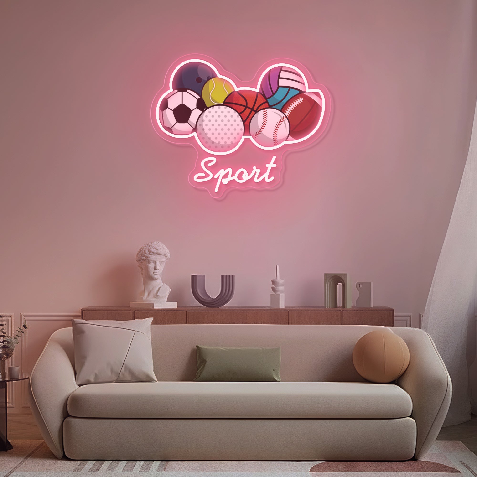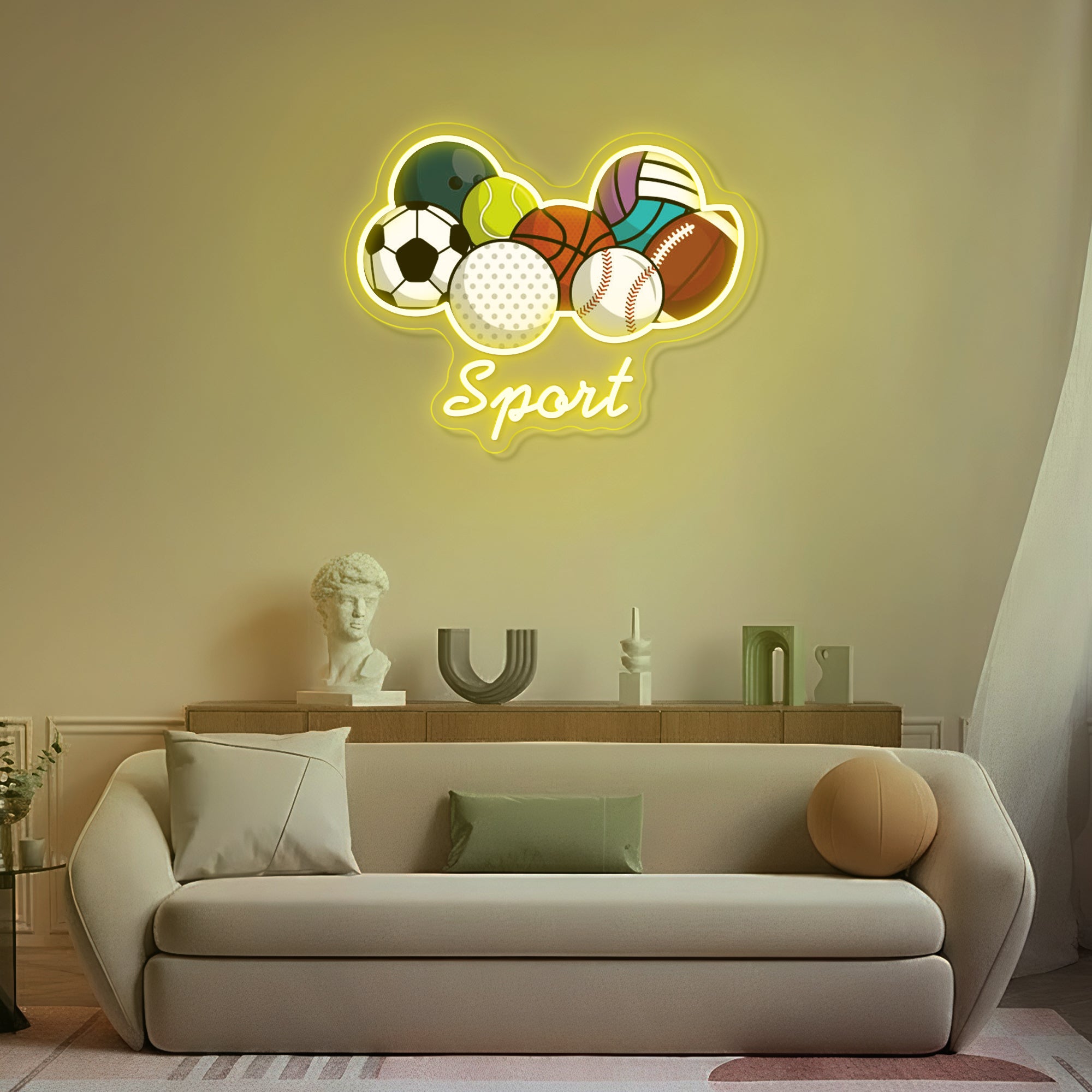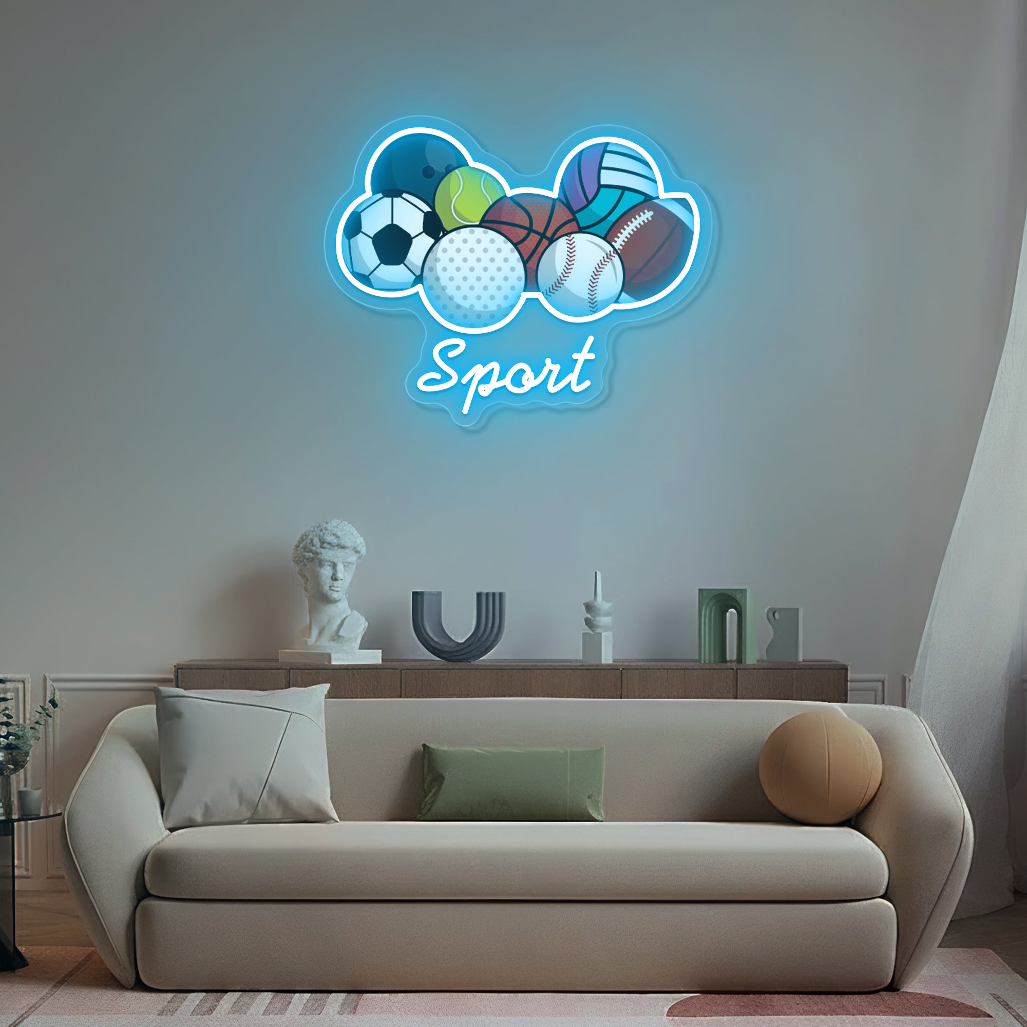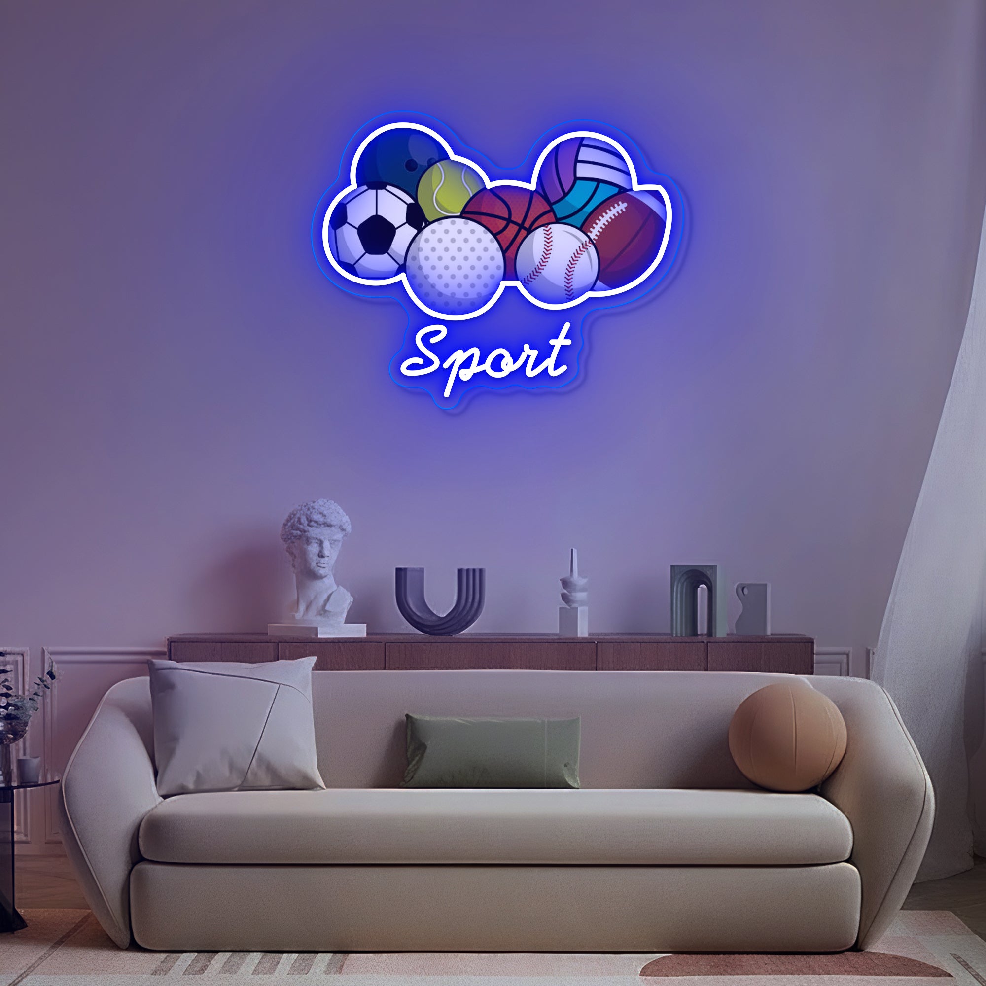 Dynamic & Multi-Sport Graphic Design: This energetic sign is a ultimate celebration of athletic passion, bringing together the icons of multiple sports in a single, vibrant composition. At the top, a stunning array of high-fidelity UV-printed sports balls is beautifully rendered—perhaps a basketball with its distinctive grooves, a soccer ball with its classic black and white pentagons, a baseball with its signature red stitching, a tennis ball in its fuzzy neon yellow, and a volleyball with its unique panel design. Each ball is captured with meticulous detail, creating a dynamic visual tribute to the games we love. Below this athletic showcase, the powerful word “Sport” glows in bold, confident LED neon lettering, anchoring the composition and declaring the theme with unmistakable clarity. This intentional fusion of detailed UV imagery and luminous typography transforms a simple word into a permanent, glowing celebration of the athlete's spirit. Expertly crafted on premium acrylic, it turns your love for the game into a stunning piece of sports-inspired wall art.
