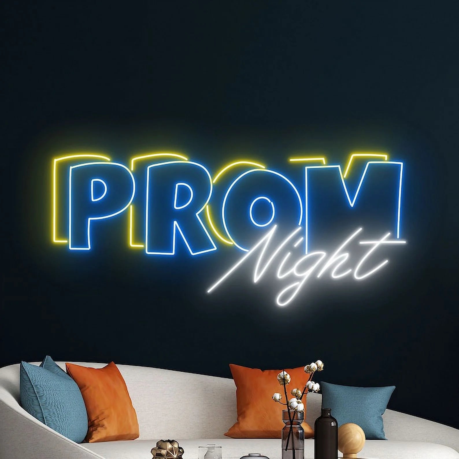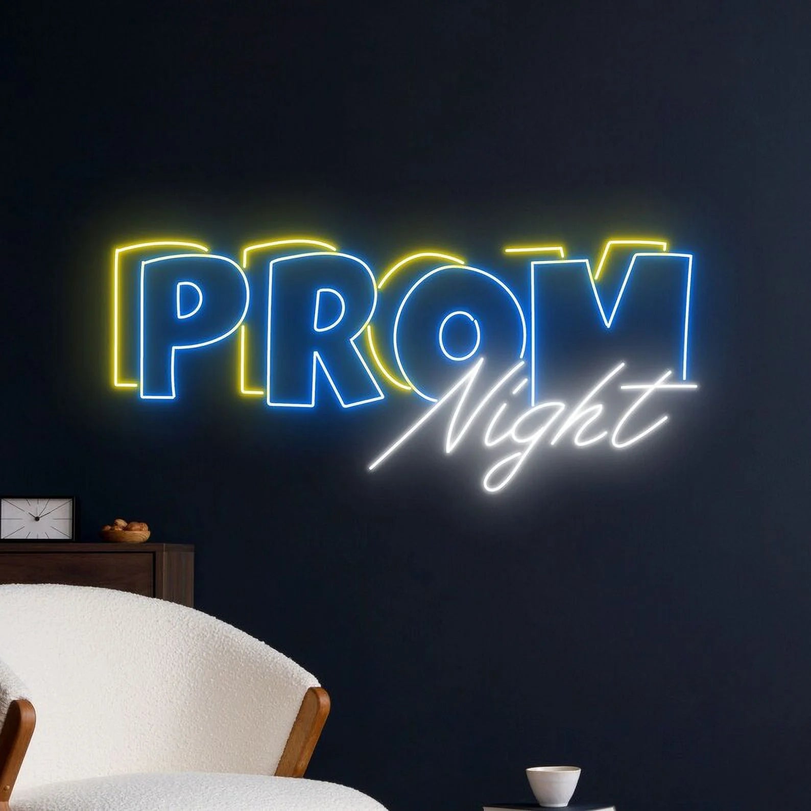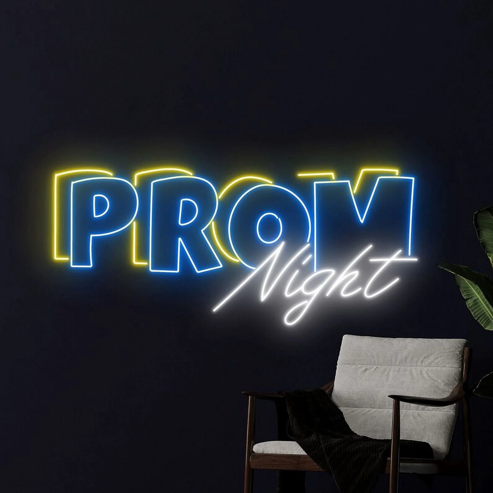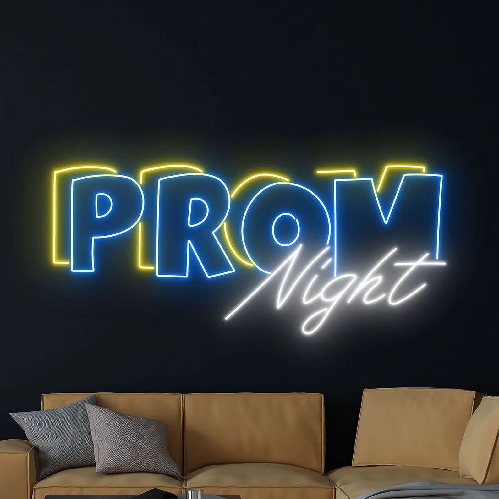 Romantic & Dreamy Glow: Emits a soft, enchanting light that captures the ethereal beauty of a perfect prom evening. The double-line "Prom" glows with steady, confident brilliance in warm tones such as soft pink, rose gold, or classic warm white, while the single-line "Night" sparkles with a more delicate, luminous radiance in complementary shades. This dual illumination creates depth and dimension, casting a light that is both boldly celebratory and romantically dreamy—reminiscent of twinkling fairy lights, satin gowns, and the soft focus of a cherished photograph.