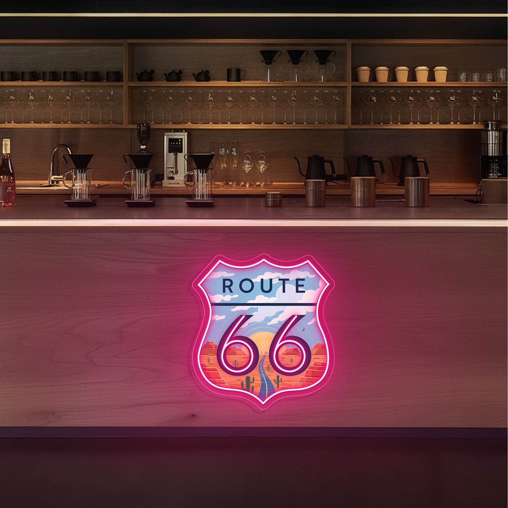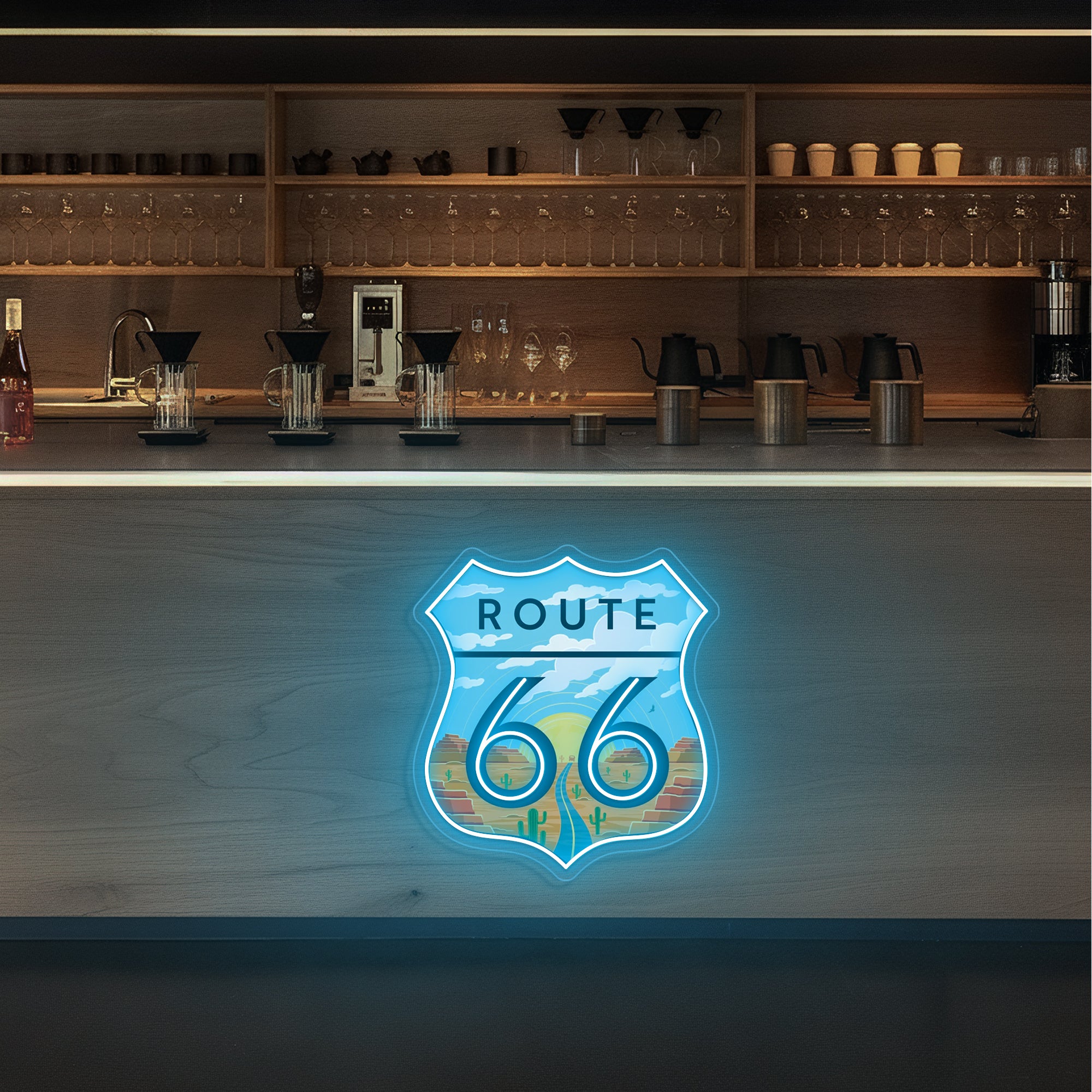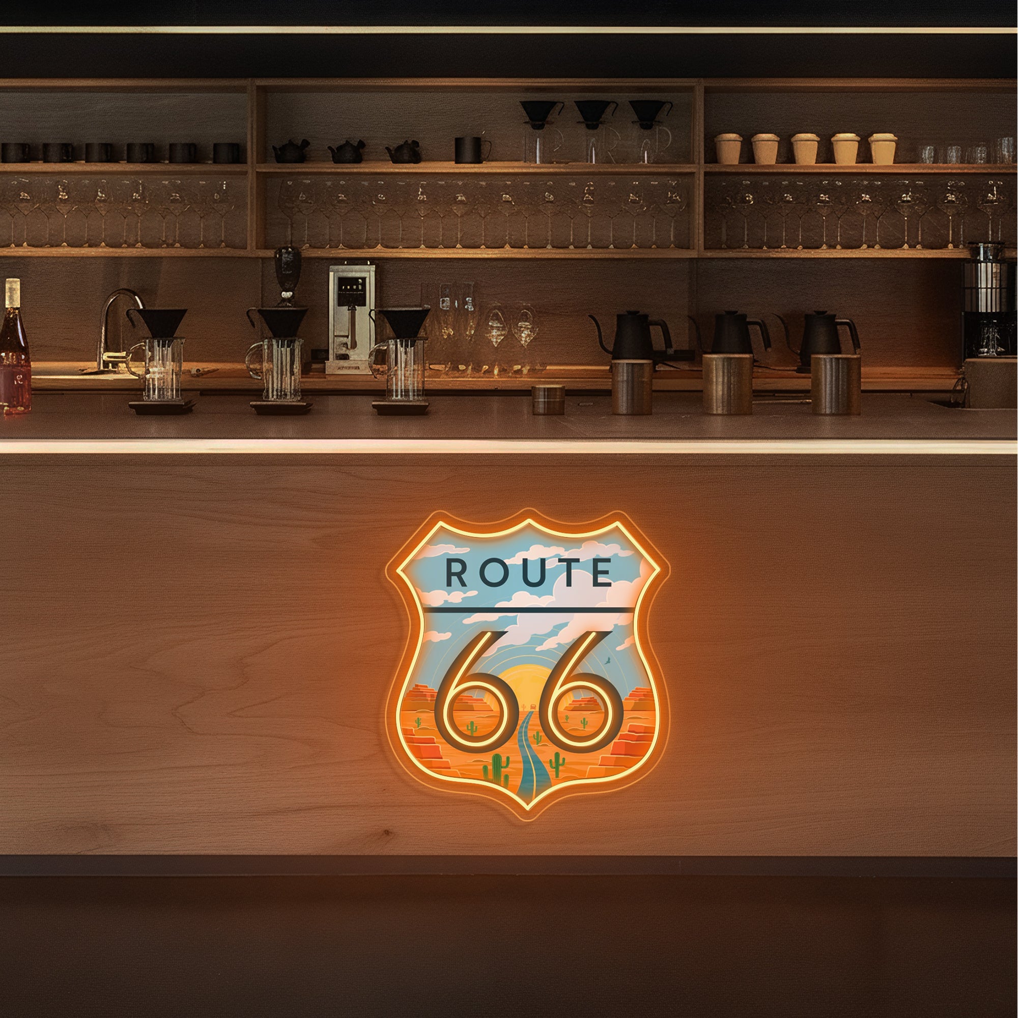 Iconic & Nostalgic Graphic and Typography Design: This sign is a luminous tribute to America's most legendary highway, capturing the spirit of freedom, adventure, and open-road dreams. It features a stunning, high-fidelity UV-printed backdrop of classic Route 66 imagery—perhaps a winding desert road stretching toward the horizon, a vintage neon motel sign, a classic Cadillac, or a retro diner with a jukebox. Overlaying this nostalgic scene, the iconic words “Route 66” glow in smooth, radiant LED neon, rendered in a bold, retro-inspired font that echoes the golden age of roadside Americana. This intentional fusion of detailed UV artwork and luminous typography transports viewers straight to the Mother Road, evoking the romance of cross-country travel and the timeless allure of the open highway. Expertly crafted on premium acrylic, it turns a legendary piece of American history into a permanent, glowing work of art for your space.