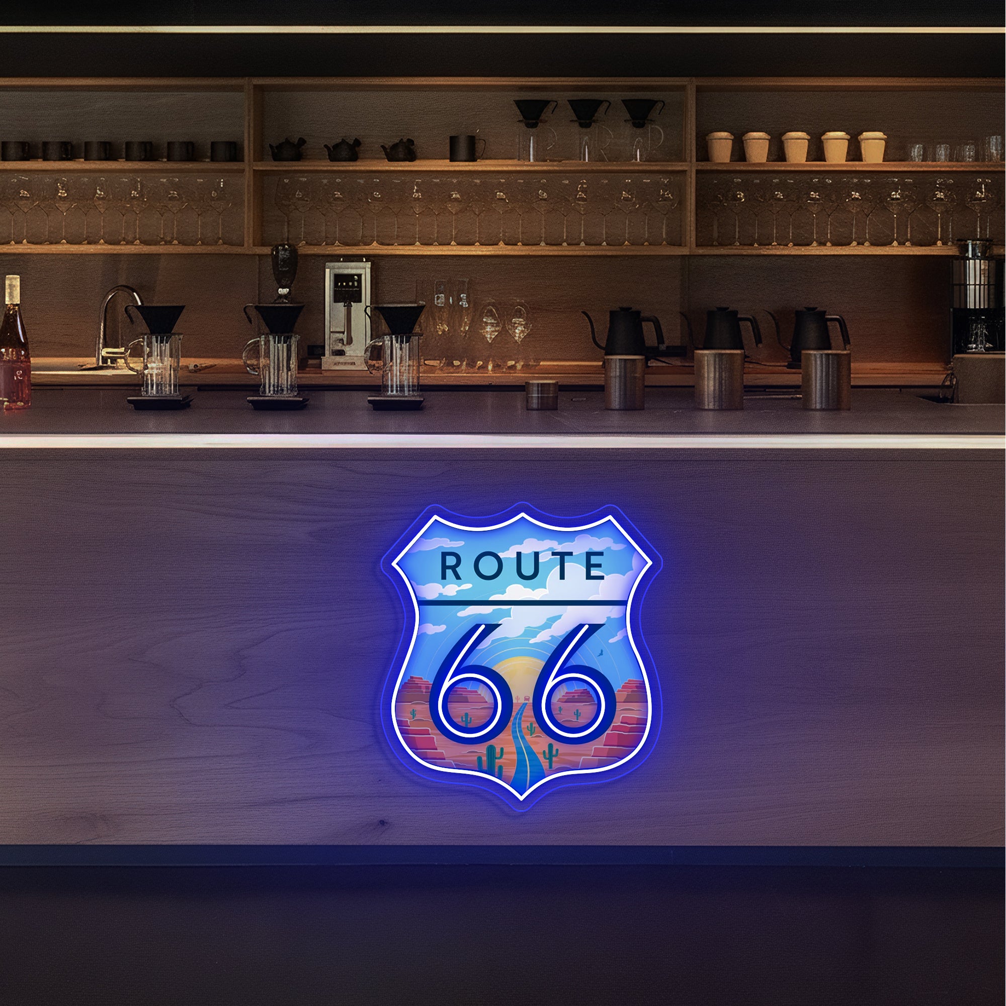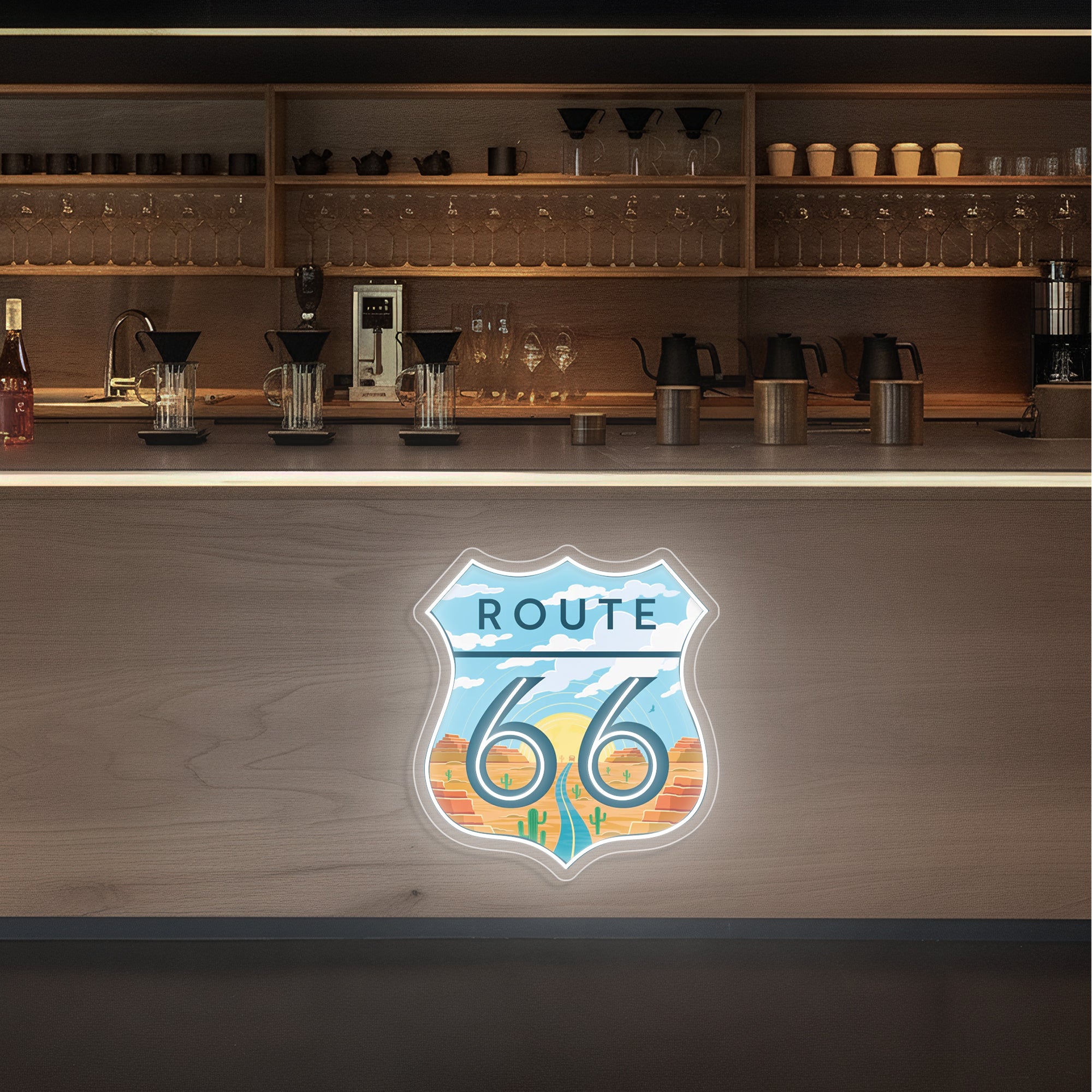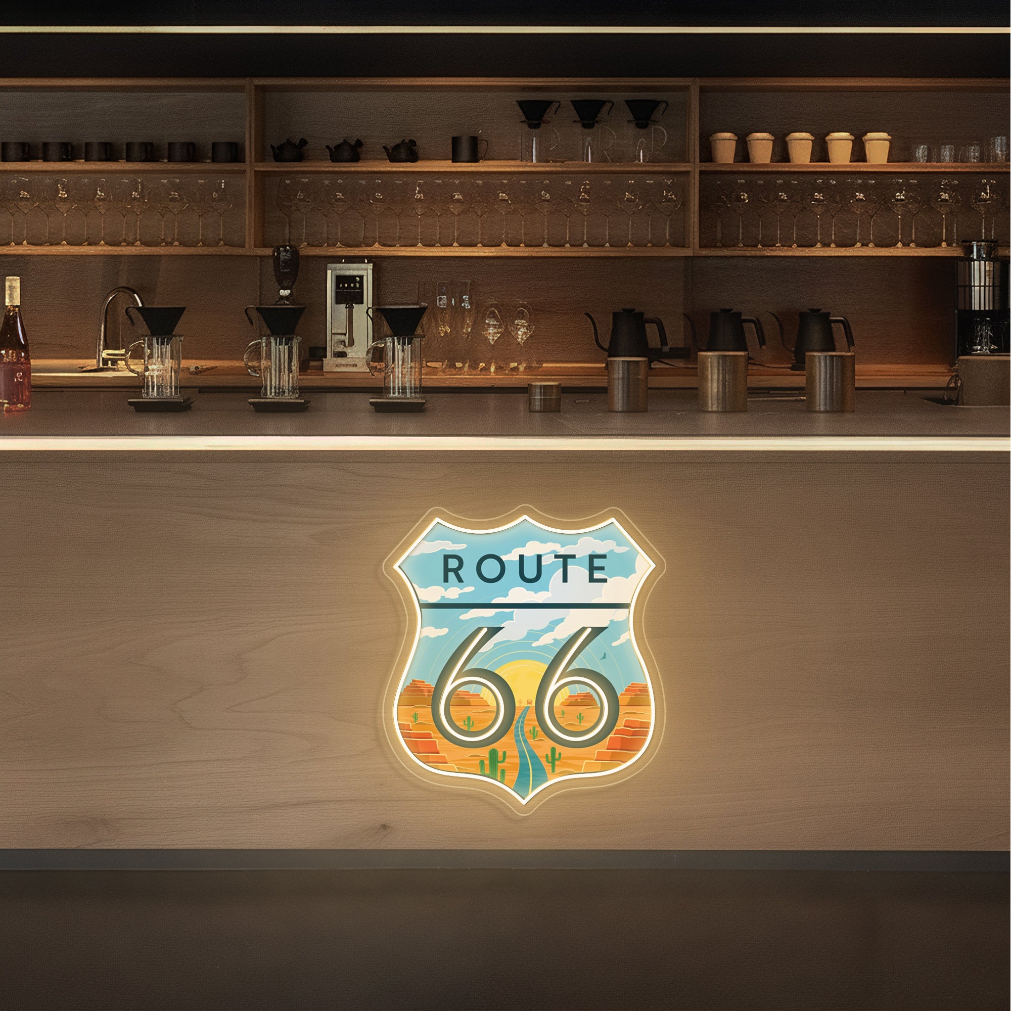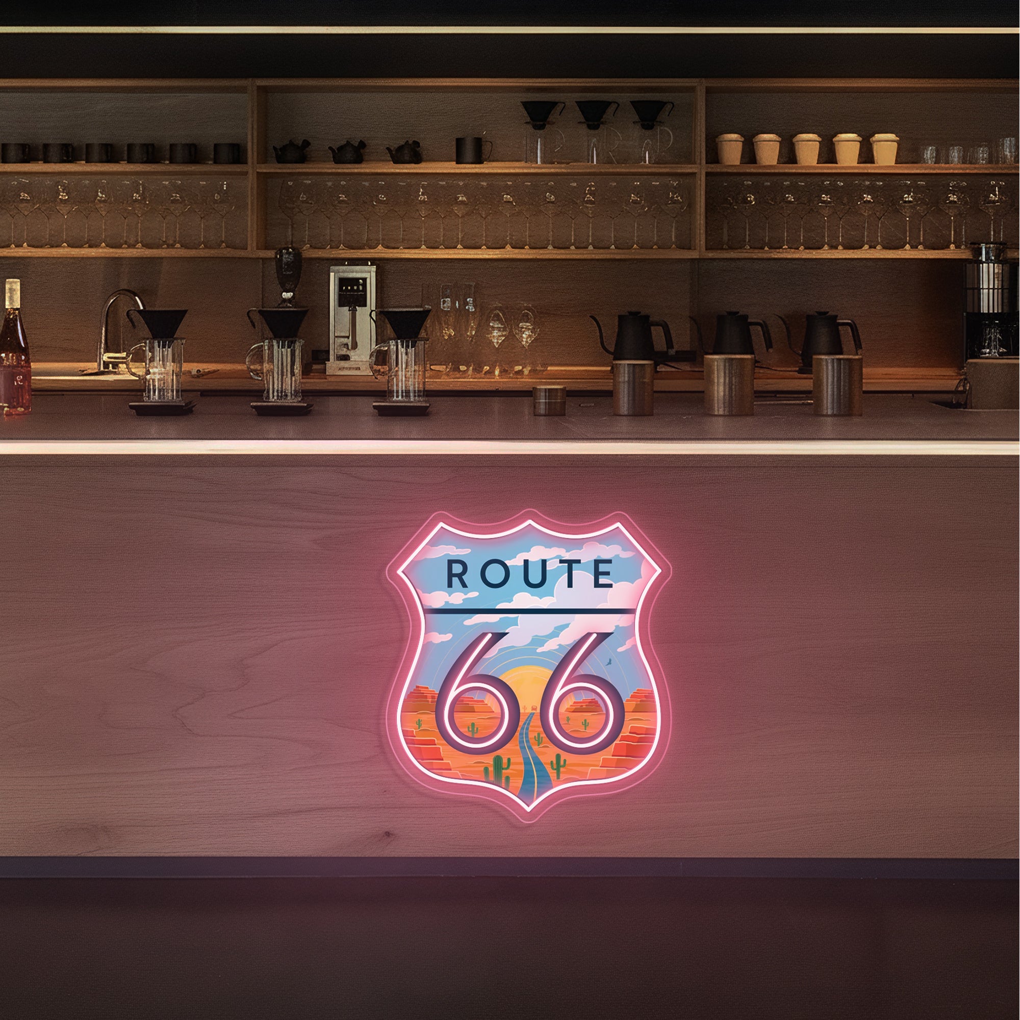 Iconic & Nostalgic Graphic and Typography Design: This sign is a luminous tribute to America's most legendary highway, capturing the spirit of freedom, adventure, and open-road dreams. It features a stunning, high-fidelity UV-printed backdrop of classic Route 66 imagery—perhaps a winding desert road stretching toward the horizon, a vintage neon motel sign, a classic Cadillac, or a retro diner with a jukebox. Overlaying this nostalgic scene, the iconic words “Route 66” glow in smooth, radiant LED neon, rendered in a bold, retro-inspired font that echoes the golden age of roadside Americana. This intentional fusion of detailed UV artwork and luminous typography transports viewers straight to the Mother Road, evoking the romance of cross-country travel and the timeless allure of the open highway. Expertly crafted on premium acrylic, it turns a legendary piece of American history into a permanent, glowing work of art for your space.