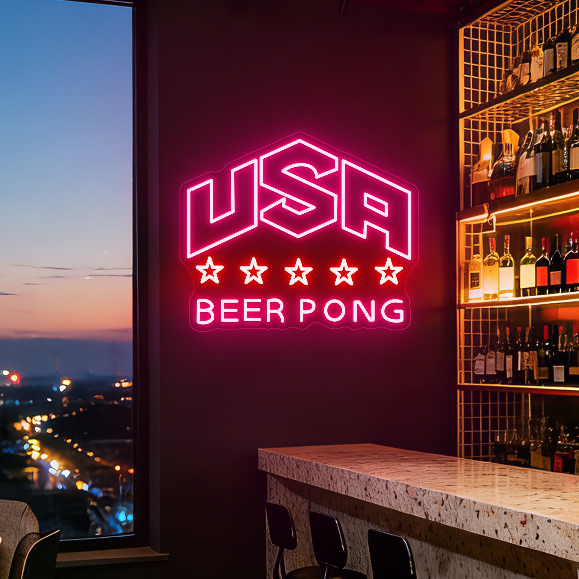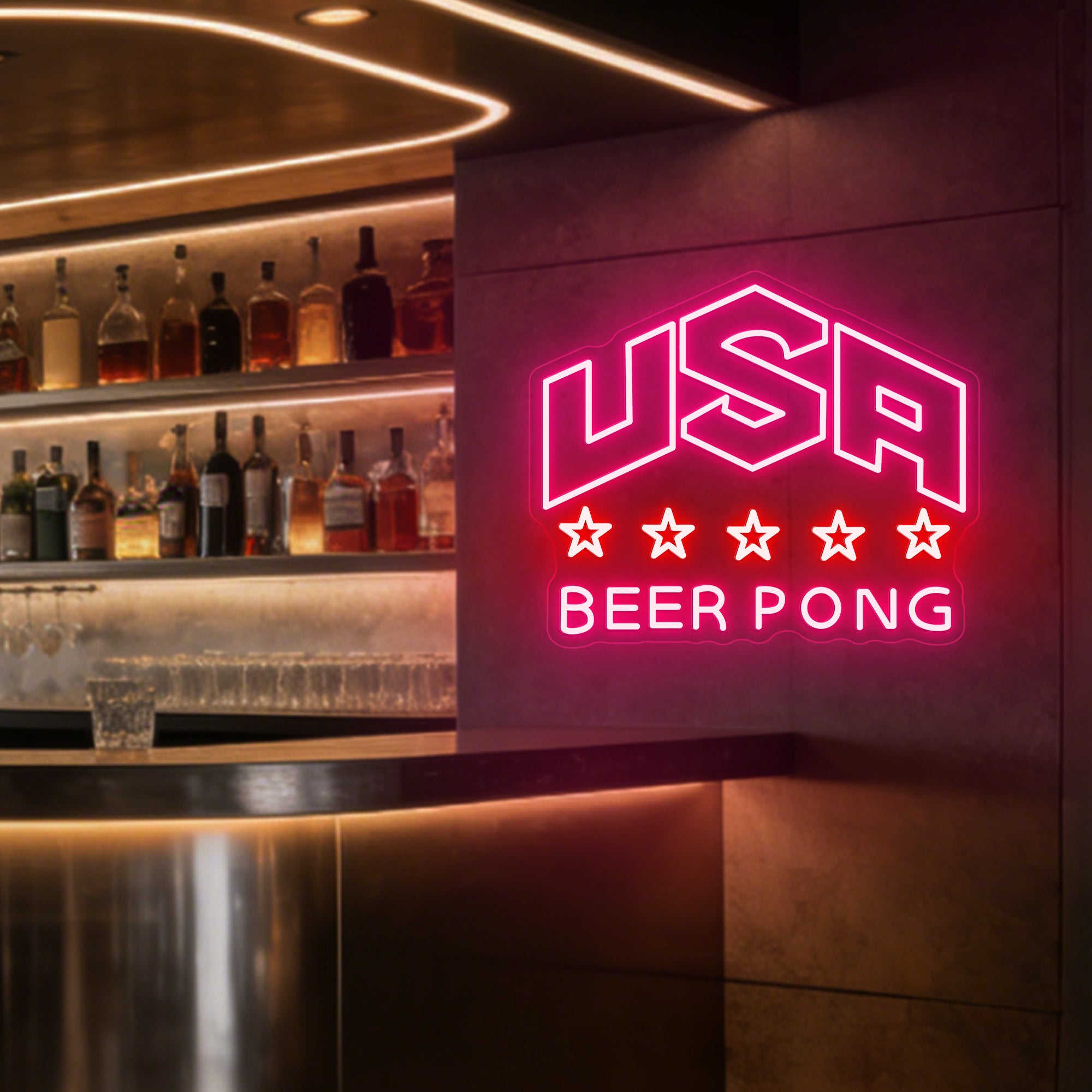 Patriotic Game Design: This dynamic sign boldly combines American pride with bar game culture. The top features a strong “USA” in sleek dual-line neon, the center showcases five iconic stars in a crisp row, and the bottom displays “BEER PONG” in clean, single-line script. This layered design creates a striking visual tribute to both national spirit and social competition.
