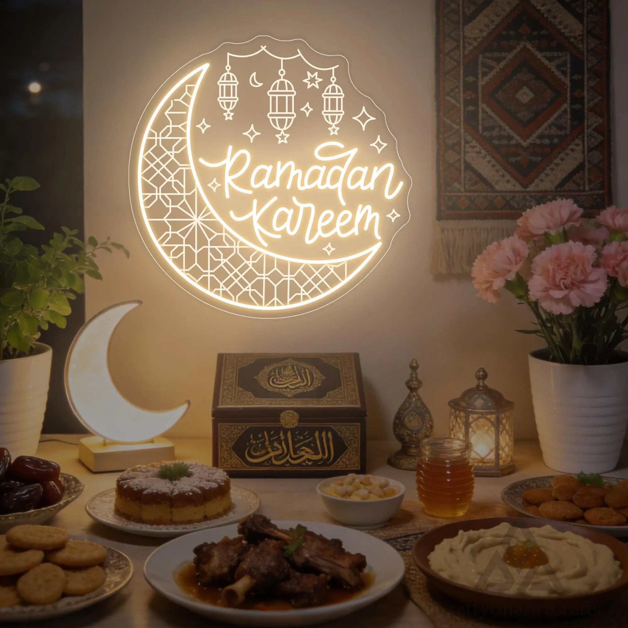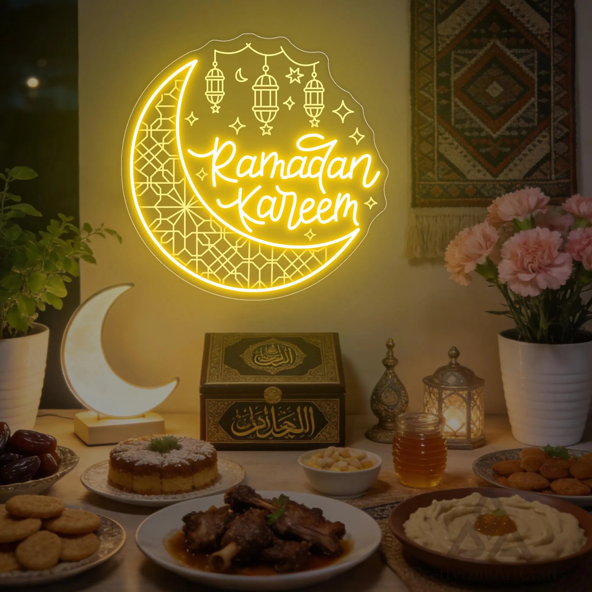 The Ramadan Kareem Crescent Moon Eid Neon Sign is a luminous tribute to the holiest month and its joyous conclusion. This masterpiece unites the most blessed of greetings with the celestial and cultural symbols that define this sacred season—the crescent moon that marks its beginning and the lanterns that welcome guests with warmth. It's more than a light; it is a celebration of fasting broken with gratitude, prayers offered in unity, and hearts opened in charity. Perfect for adorning your home throughout Ramadan, creating a breathtaking focal point for Iftar and Eid gatherings, or as a profoundly meaningful gift for family and friends, it doesn't just decorate a wall—it illuminates the very spirit of the holy month and the joy of Eid. It is an investment in an atmosphere that honors tradition, nurtures faith, and radiates the blessings of Ramadan and the celebration of Eid.