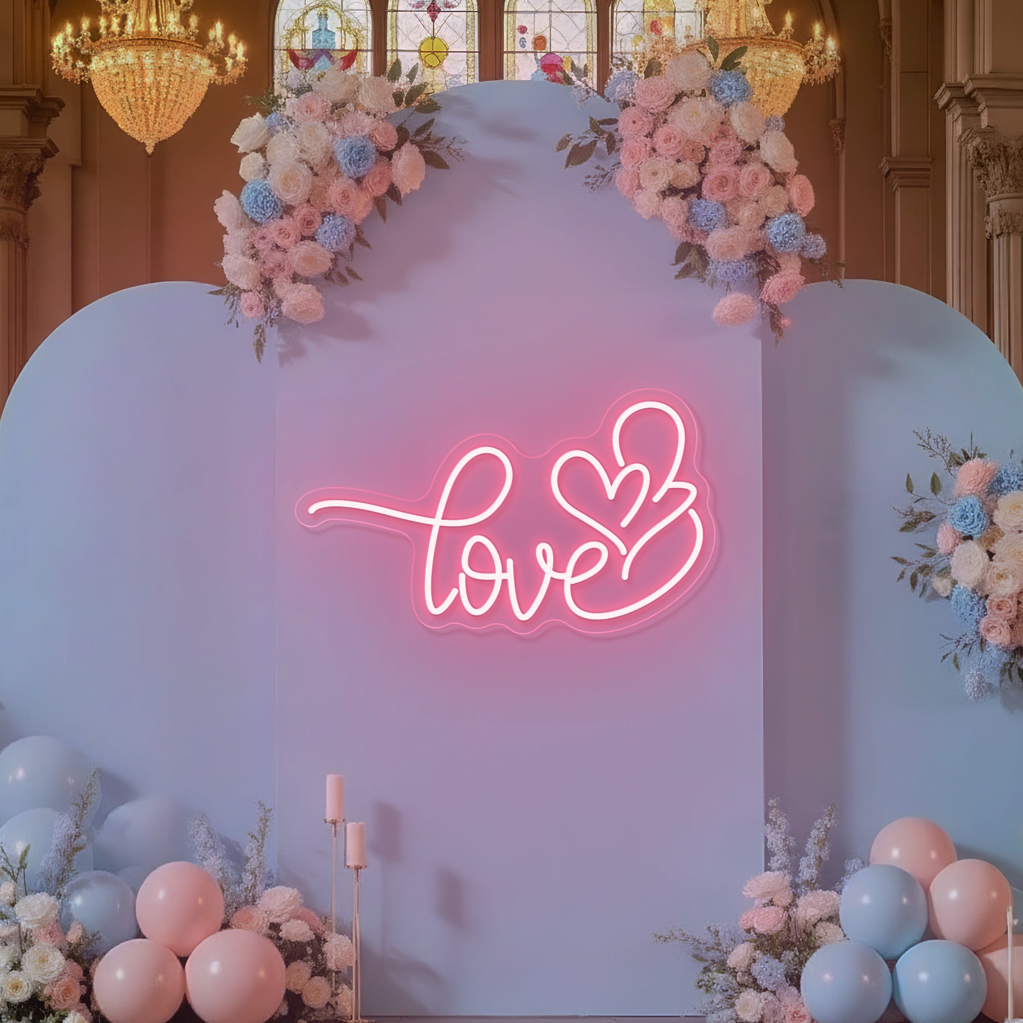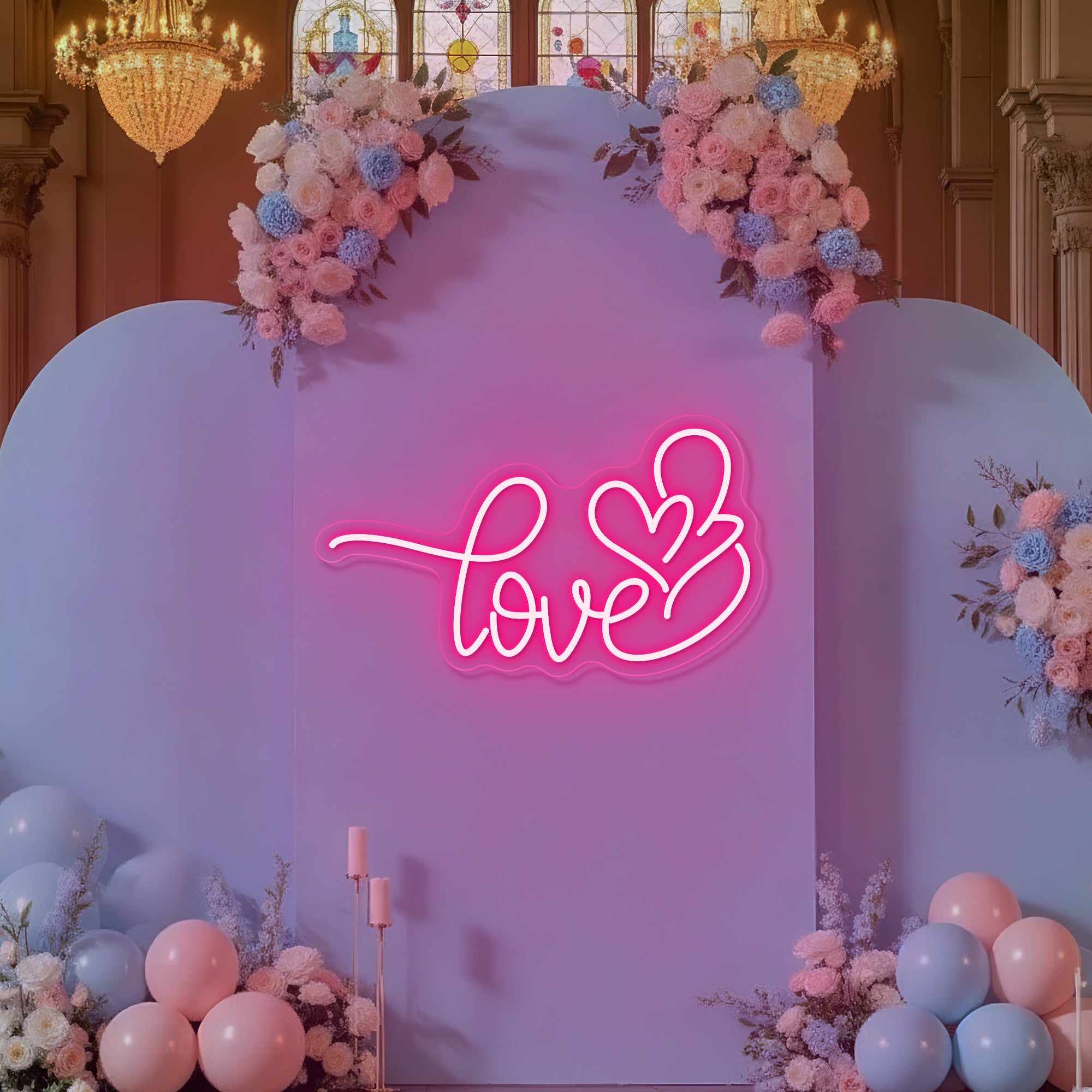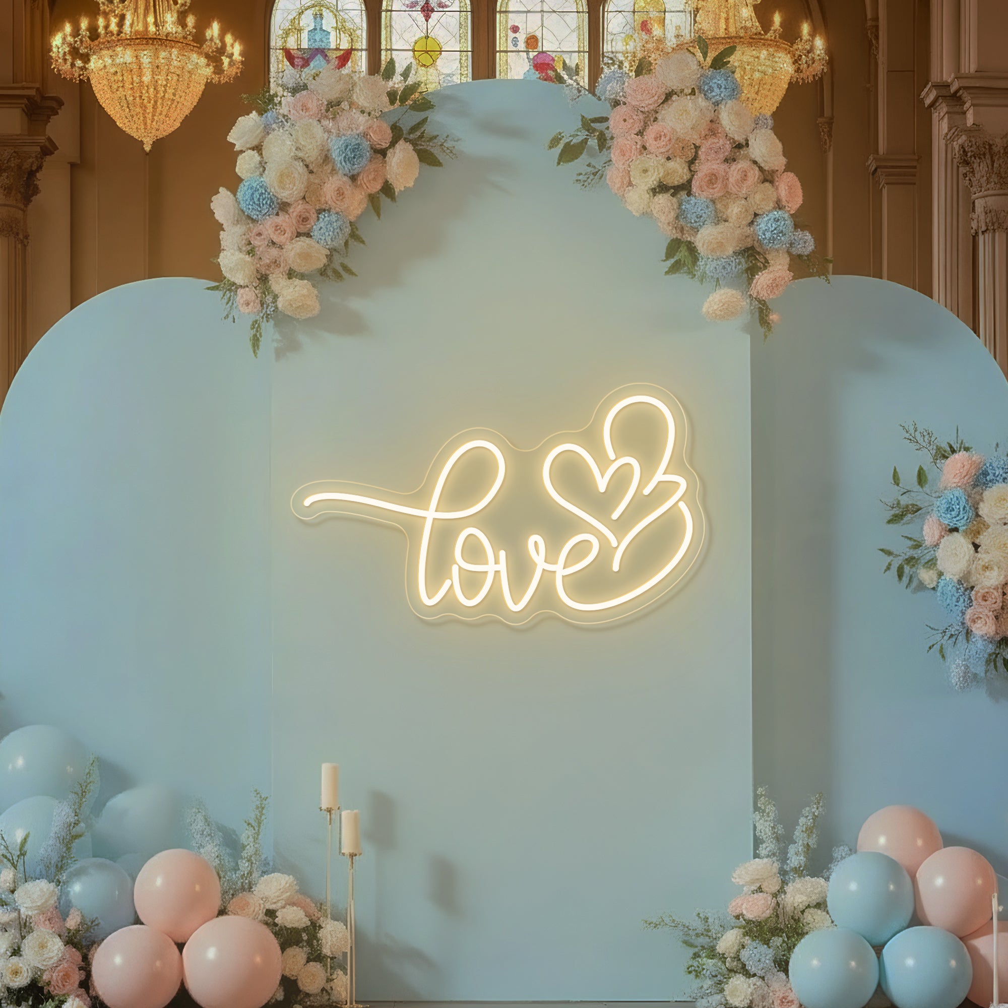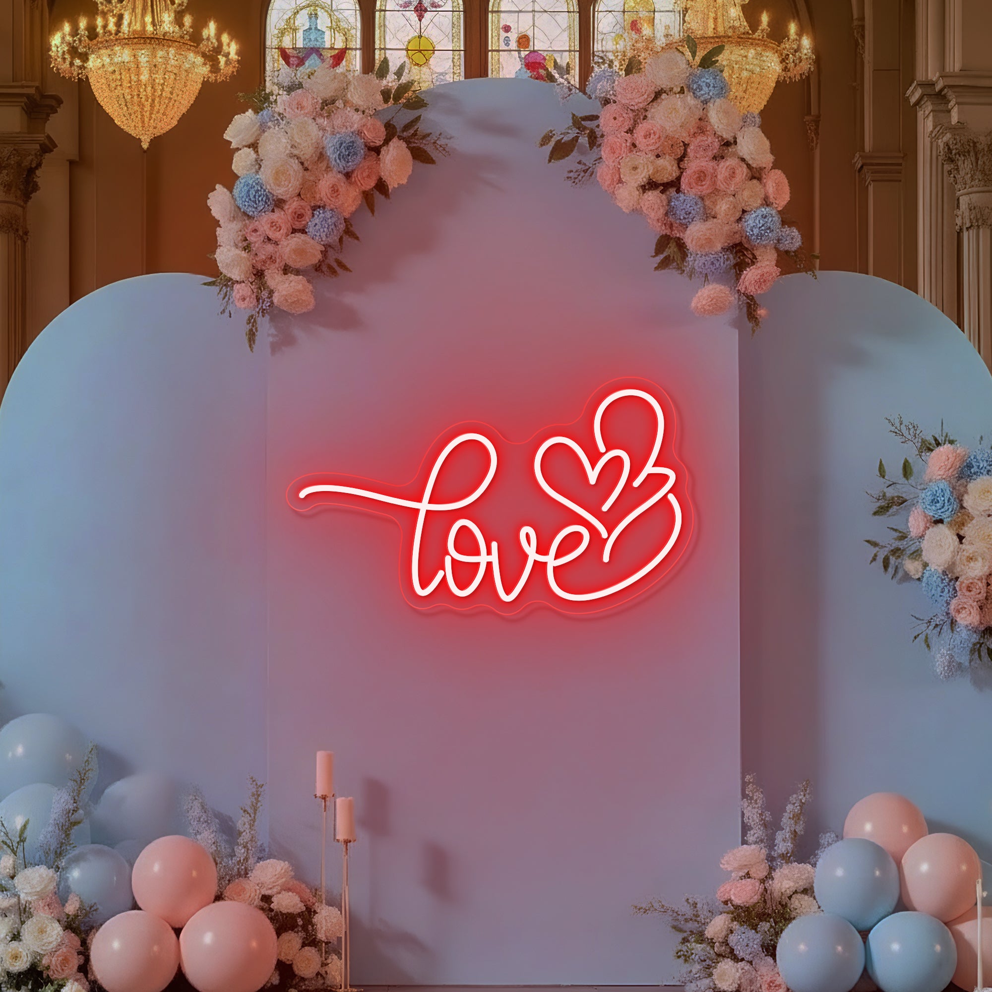Playful & Romantic Typography Design: This delightful sign spreads love in its most charming form. It features the timeless word “Love” in a beautiful, flowing script or a clean, modern font, brought to life through high-fidelity UV printing. Playfully scattered around the word are several delicate, glowing hearts—each one a tiny burst of affection. The design is intentionally joyful, romantic, and whimsical, transforming a simple declaration into a luminous celebration of love in all its forms. Expertly crafted on premium acrylic with smooth, radiant LED neon outlining both the lettering and the floating hearts, it turns a heartfelt sentiment into a glowing centerpiece for any wedding celebration.
