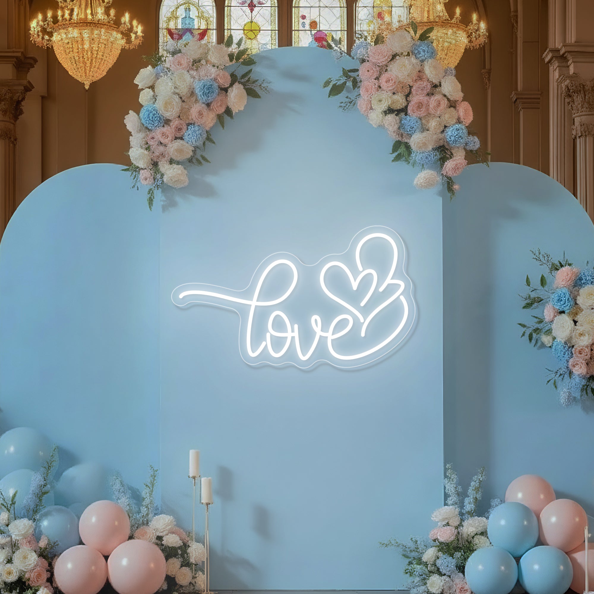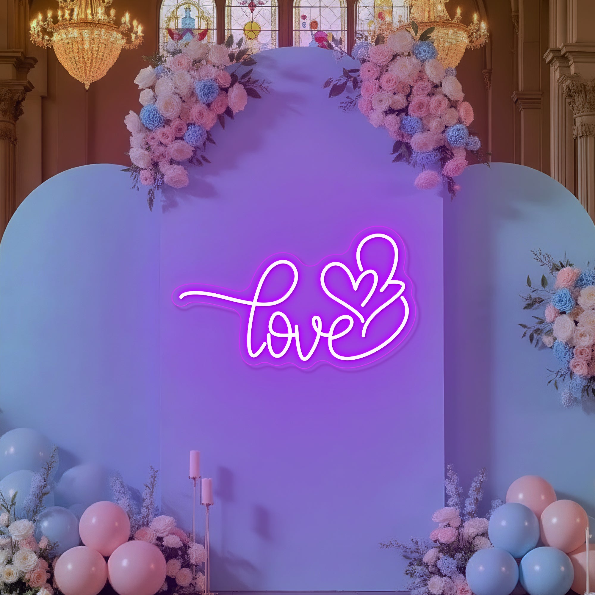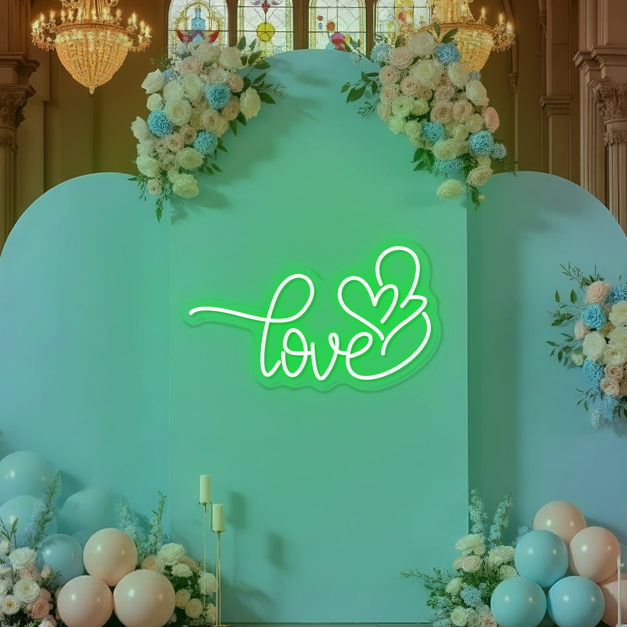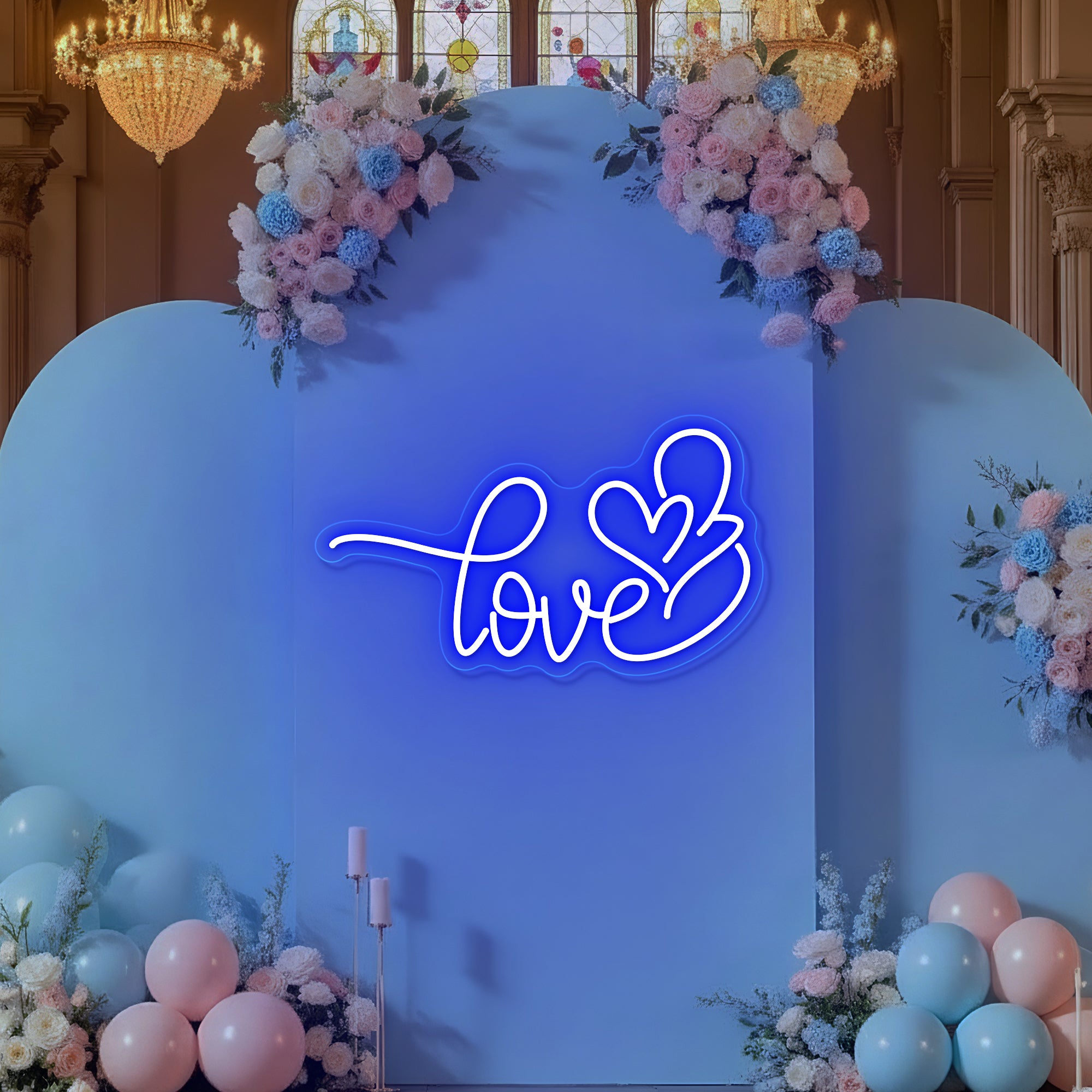 Playful & Romantic Typography Design: This delightful sign spreads love in its most charming form. It features the timeless word “Love” in a beautiful, flowing script or a clean, modern font, brought to life through high-fidelity UV printing. Playfully scattered around the word are several delicate, glowing hearts—each one a tiny burst of affection. The design is intentionally joyful, romantic, and whimsical, transforming a simple declaration into a luminous celebration of love in all its forms. Expertly crafted on premium acrylic with smooth, radiant LED neon outlining both the lettering and the floating hearts, it turns a heartfelt sentiment into a glowing centerpiece for any wedding celebration.