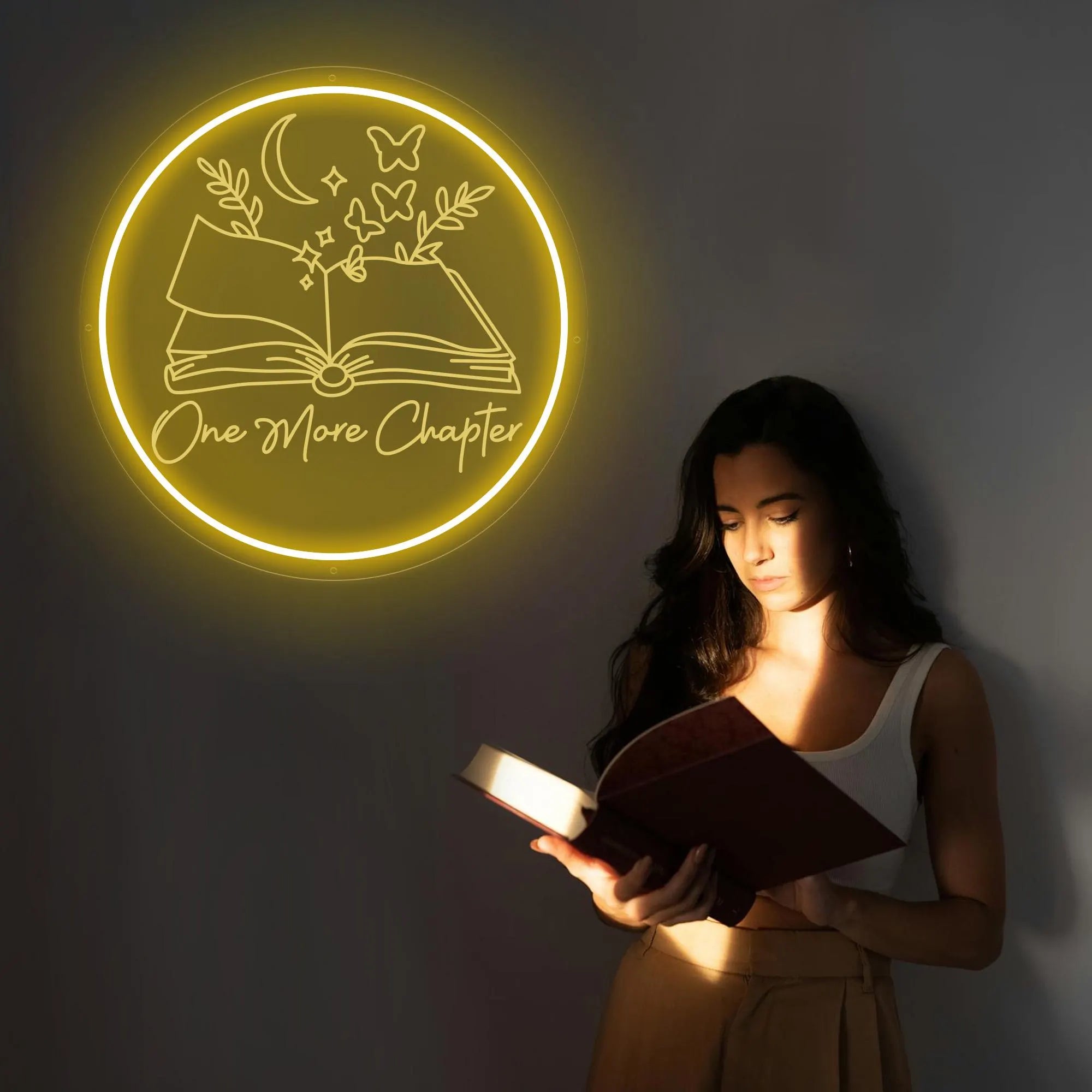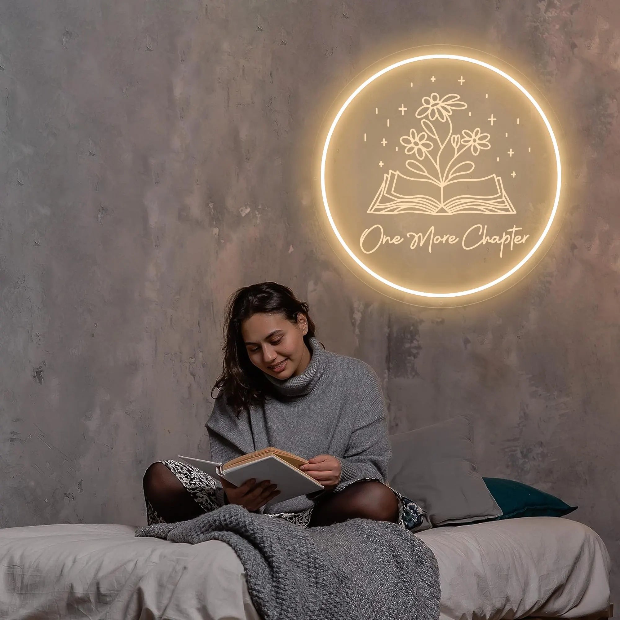 Whimsical & Literary Circle Design: This enchanting sign is a love letter to every book lover who has ever whispered those magical words: just one more chapter. It features a luminous, continuous LED neon circle that frames the entire composition like a portal into another world—a perfect, glowing window into the imagination. Within this radiant circle, intricately engraved details bring a literary scene to life: the delicate outline of an open book, its pages ready to transport the reader, and the heartfelt plea “One More Chapter” rendered in an elegant, bookish font that every devoted reader knows too well. The intentional combination of the enclosing circle—symbolizing the immersive world of a story—and the detailed engraving creates a piece that feels both intimate and expansive, like a private reading nook captured in light. Expertly crafted on premium acrylic with smooth LED neon encircling the entire scene, it transforms a reader's late-night wish into a permanent, glowing celebration of the written word.
