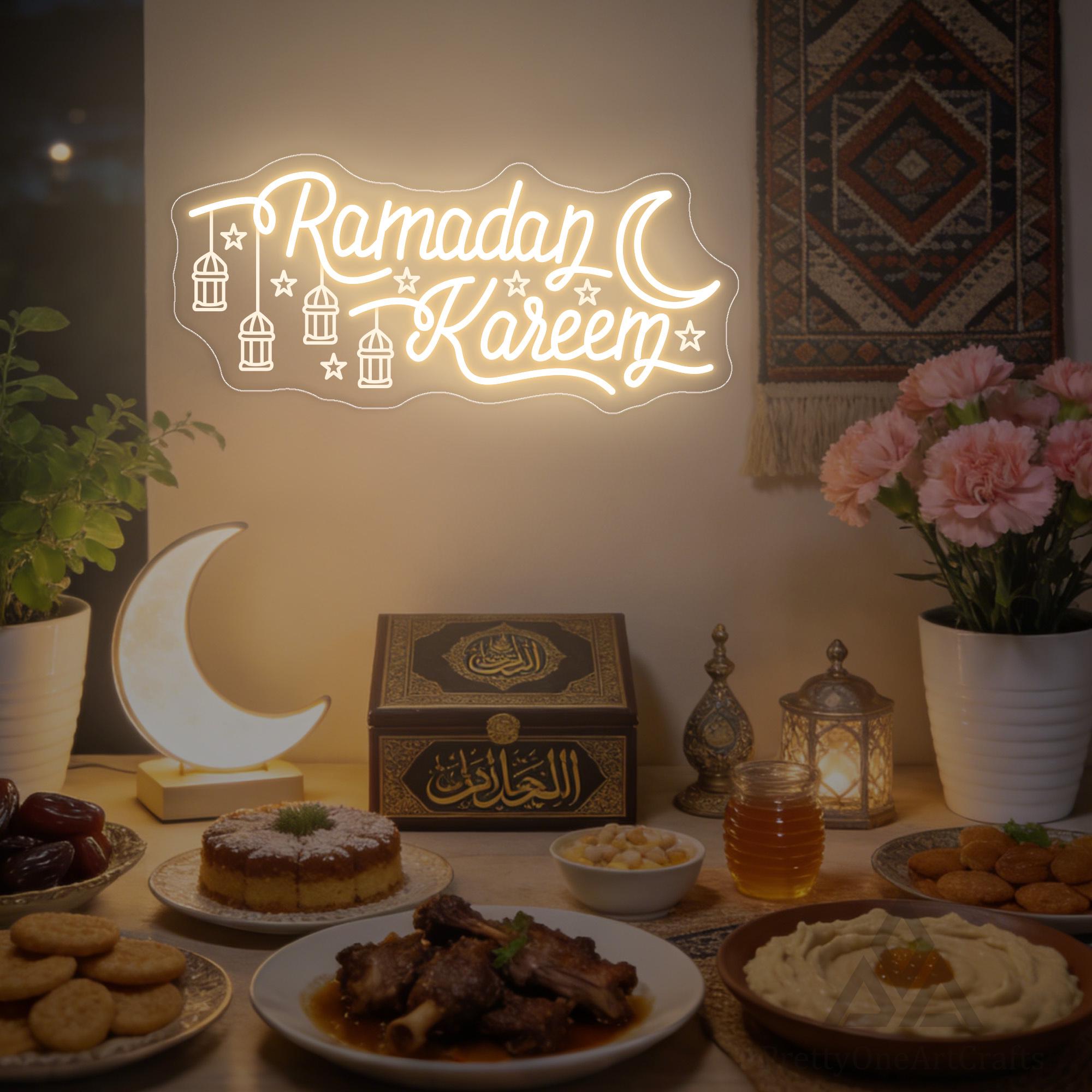 Sacred & Festive Typography and Design: This luminous sign captures the spiritual beauty and celebratory spirit of the holiest month in the Islamic calendar. It features the blessed greeting “Ramadan Kareem” in an elegant, flowing script—inspired by traditional Arabic calligraphy, beautifully rendered through high-fidelity UV printing. Complementing the sacred text is a graceful crescent moon, symbolizing the beginning of Ramadan, surrounded by intricately engraved stars that twinkle with celestial charm and delicate lanterns that evoke the warm, festive glow of Eid nights. The intentional combination of reverent typography and celestial imagery transforms a simple greeting into a radiant celebration of faith, family, and gratitude. Expertly crafted on premium acrylic with smooth, radiant LED neon outlining the entire composition, it turns a season of blessings into a permanent, glowing work of art.