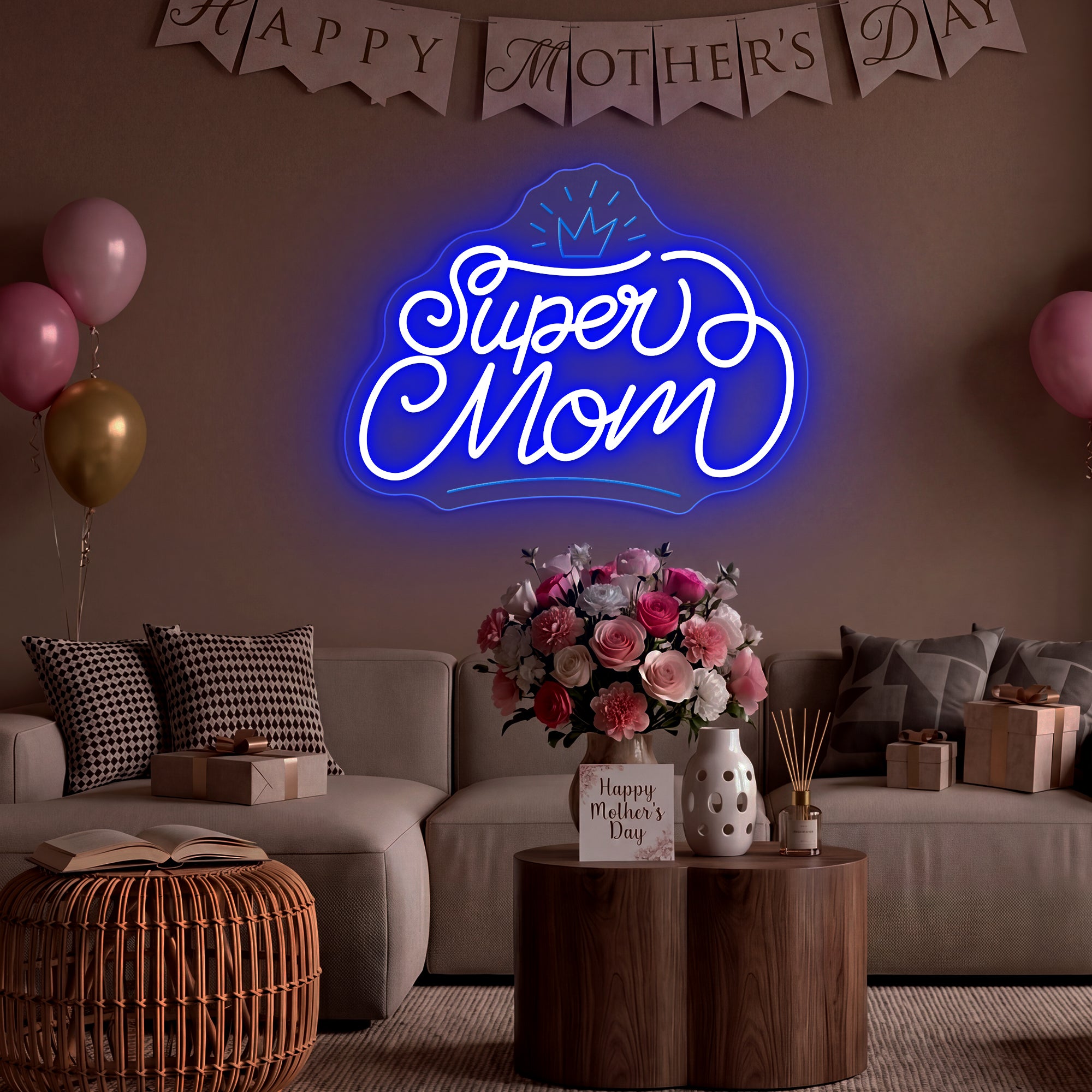 Empowering Typography with Regal Crown Accent: This luminous sign celebrates the queen of every household with style and heartfelt gratitude. It features the proud declaration “Super Mom” in a bold, confident font—clean, modern, and full of admiration. Above or beside the lettering, a delicately engraved crown sits as a symbol of her unwavering strength, grace, and the royal love she gives every single day. This intentional pairing of empowering words with a regal emblem creates a piece that says: she is not just a mom—she is a superhero, and she deserves a crown. Expertly crafted on premium acrylic with smooth, radiant LED neon outlining the text and precise engraving bringing the crown to life, it turns a heartfelt sentiment into a permanent, glowing tribute.