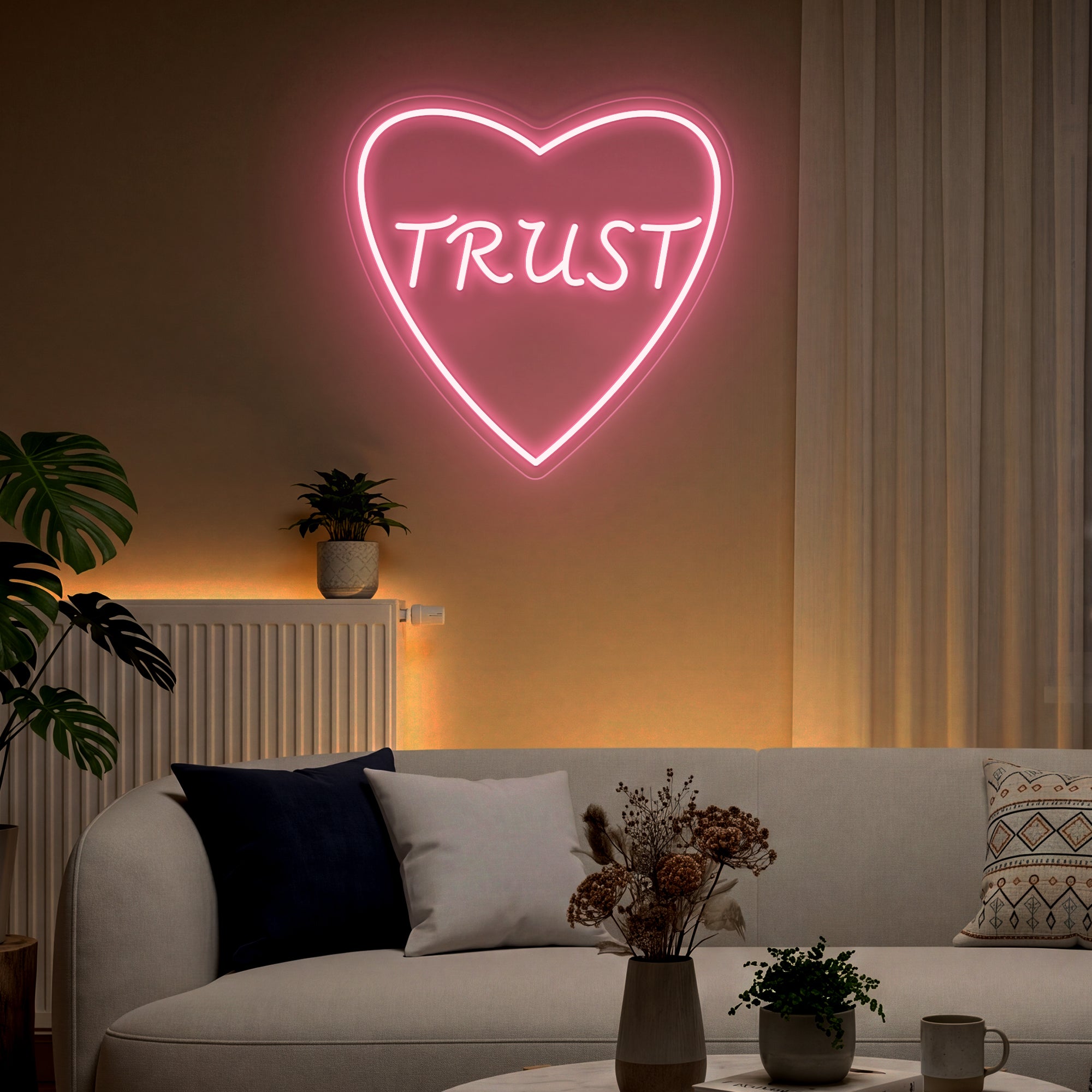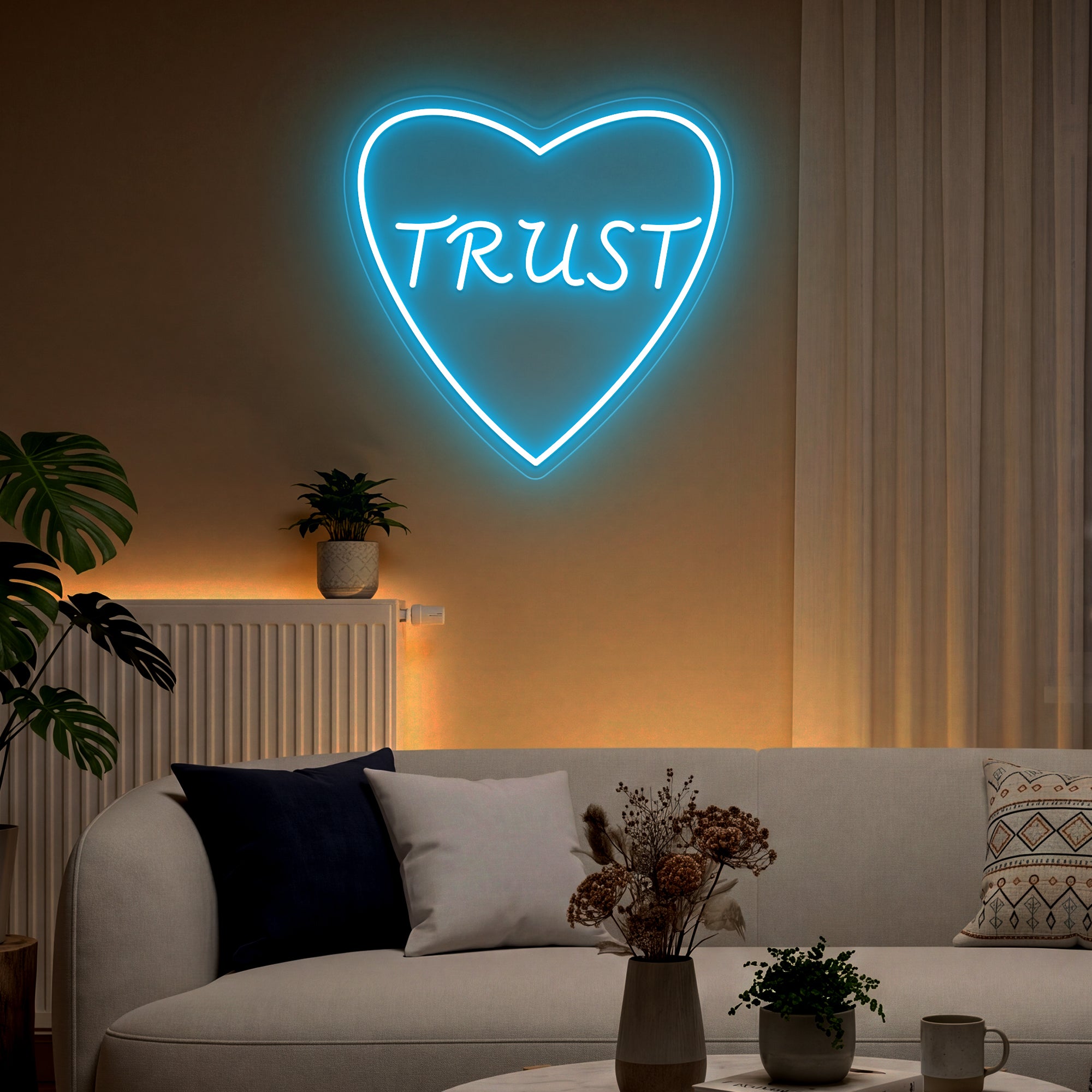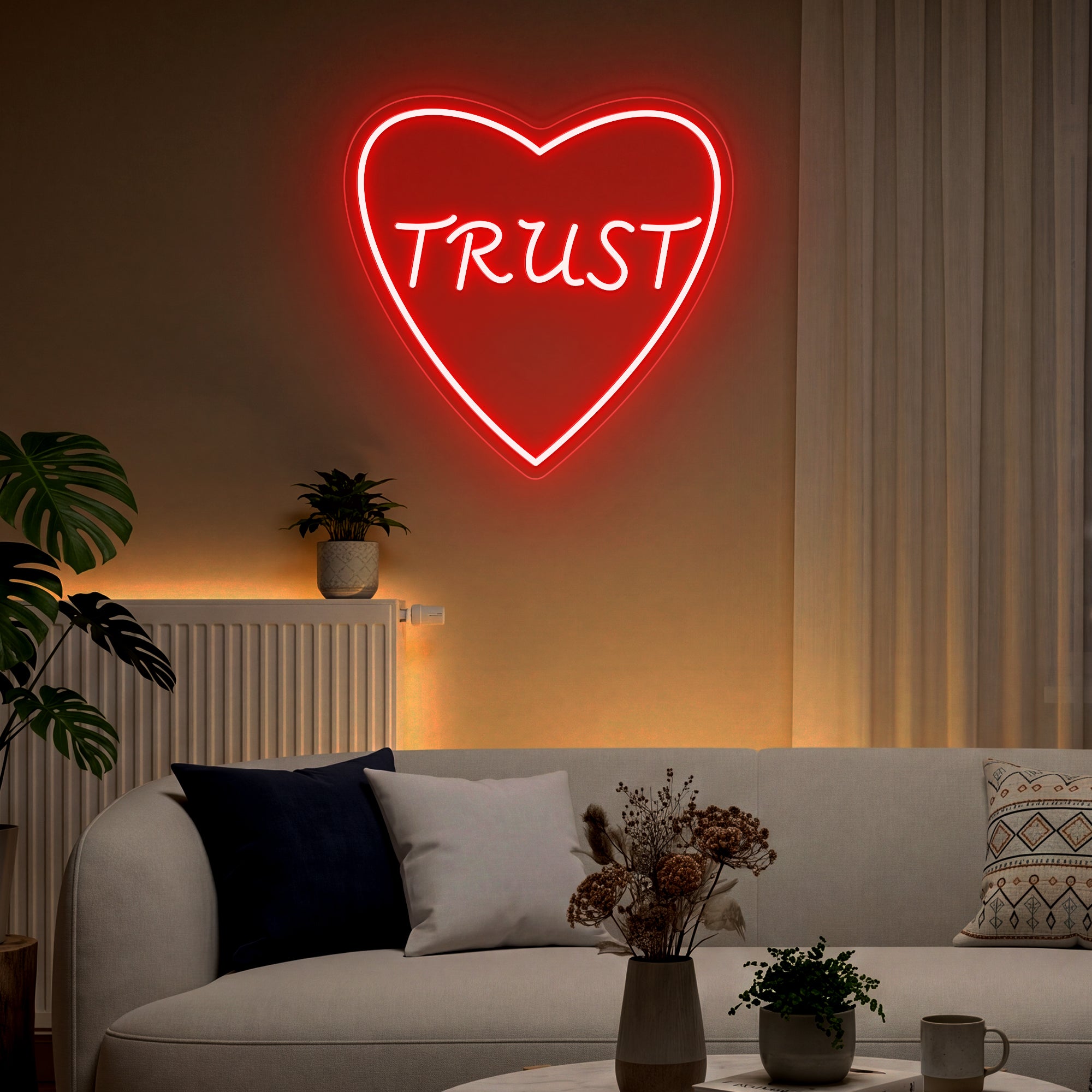 Warm & Symbolic Heart and Typography Design: This heartfelt sign captures the essence of trust—the quiet foundation of every deep connection—in a single, glowing image. It features a beautifully stylized, continuous LED neon heart, soft and full of warmth, with the powerful word “Trust” glowing at its center. The design is intentionally simple, elegant, and profound, letting the universal symbol of love embrace the word that makes love unshakable. Expertly crafted in smooth, continuous LED neon, it transforms a powerful emotion into a permanent, luminous reminder of the safety and peace found in true trust.
