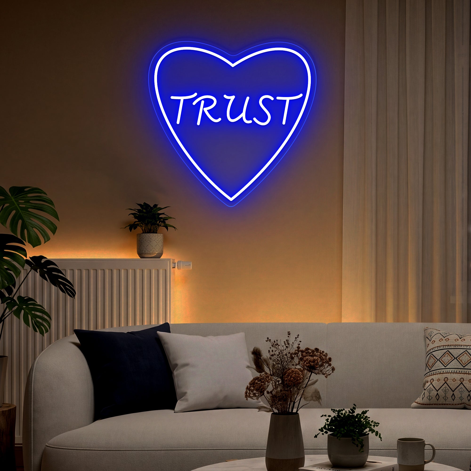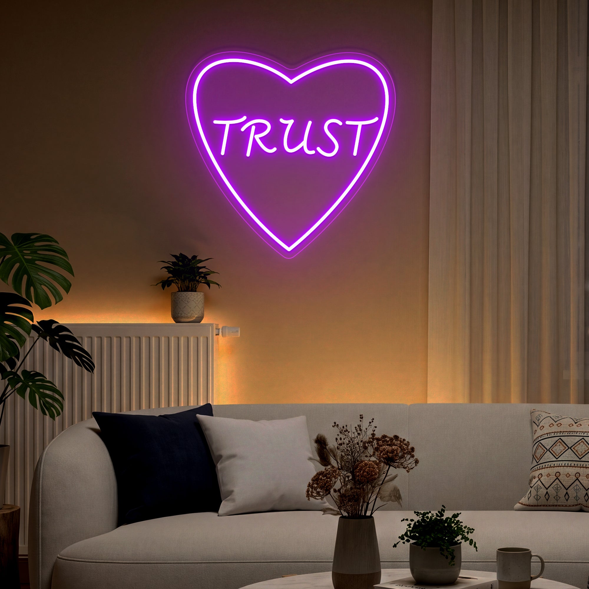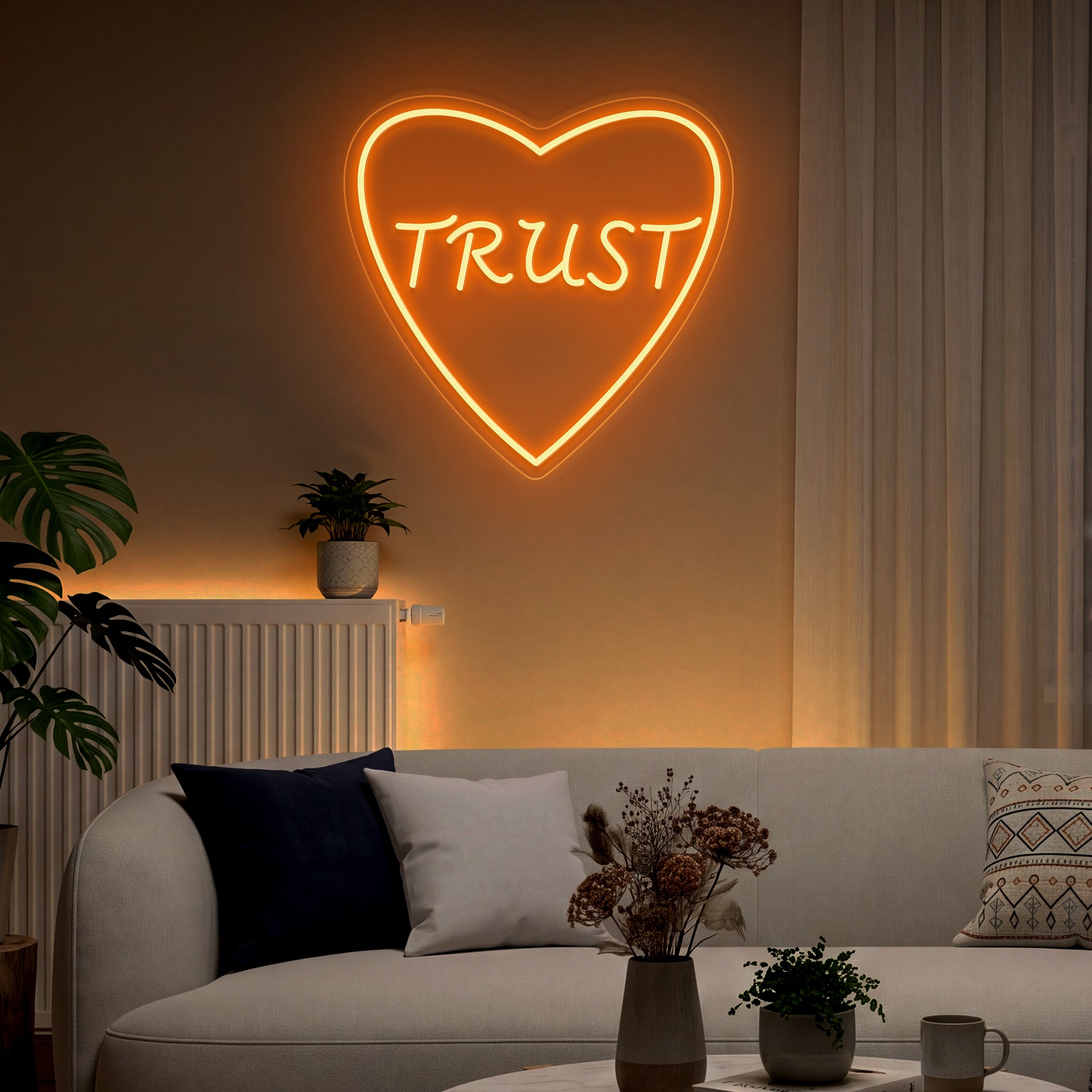 Warm & Symbolic Heart and Typography Design: This heartfelt sign captures the essence of trust—the quiet foundation of every deep connection—in a single, glowing image. It features a beautifully stylized, continuous LED neon heart, soft and full of warmth, with the powerful word “Trust” glowing at its center. The design is intentionally simple, elegant, and profound, letting the universal symbol of love embrace the word that makes love unshakable. Expertly crafted in smooth, continuous LED neon, it transforms a powerful emotion into a permanent, luminous reminder of the safety and peace found in true trust.
