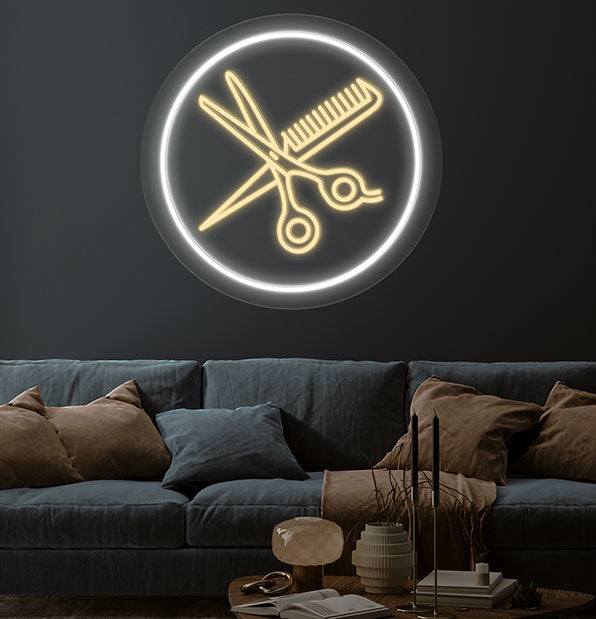 Iconic & Professional Graphic Design: This sign instantly communicates its purpose with classic salon symbology. It features a clean, stylized graphic of a pair of barber shears (clippers) crossed or paired with a styling comb. The design is intentionally direct, recognizable, and modern, transforming the timeless tools of the trade into a luminous, professional emblem. Expertly crafted in smooth, continuous LED neon, it turns essential hairdressing icons into a bright and welcoming sign for your business.