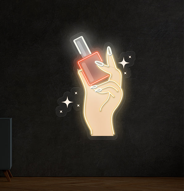 Vibrant & Graphic Design: This eye-catching sign is pure visual energy, inspired by bold comic book art and retro pop culture. It features a dynamic UV-cured graphic of a stylish, illustrated hand confidently holding a nail polish bottle, accented by sparkling four-pointed stars bursting around it. With no text to clutter the view, the design speaks a universal language of style, creativity, and salon fun. Expertly crafted in vibrant LED neon, it transforms a playful graphic into a luminous piece of wall art that demands attention.