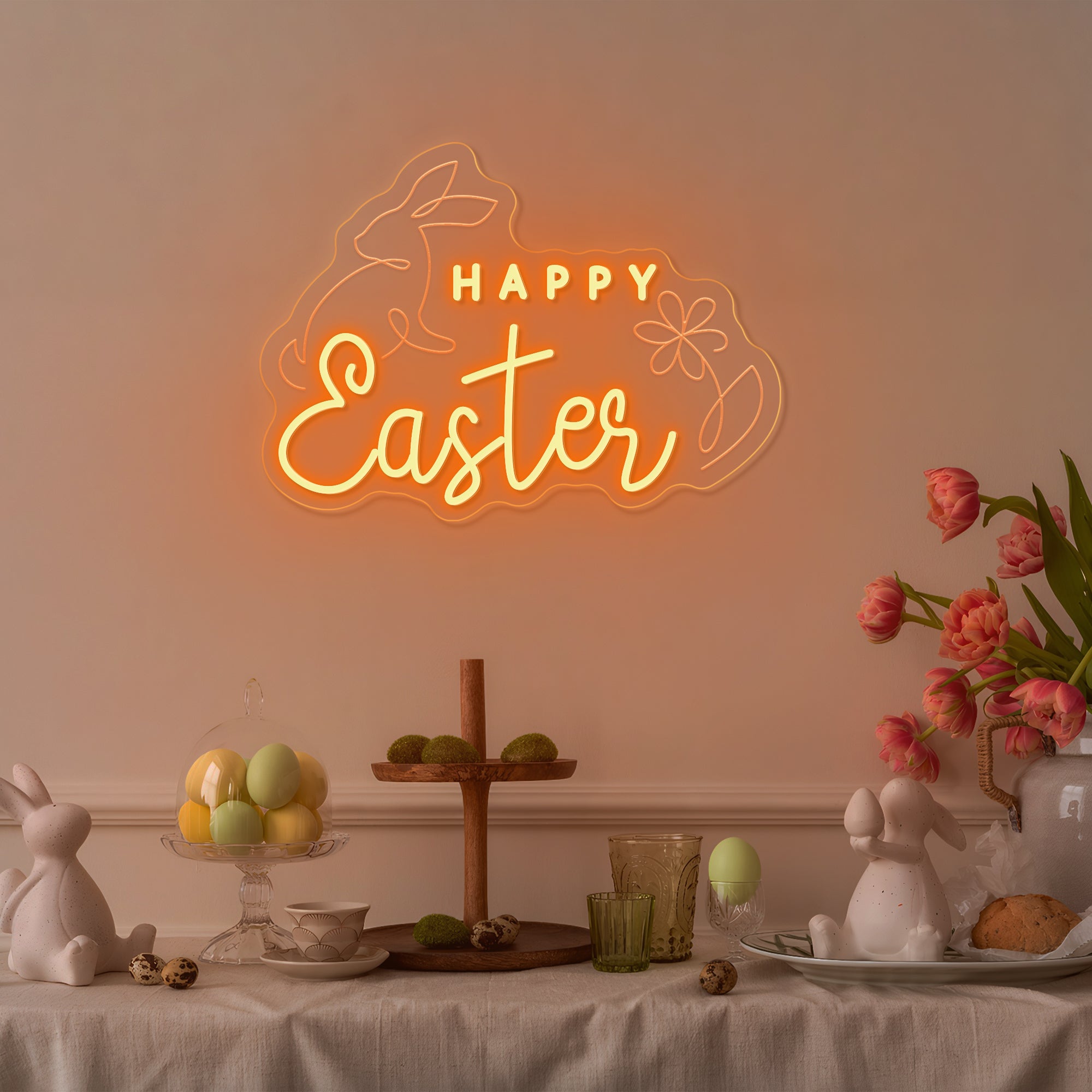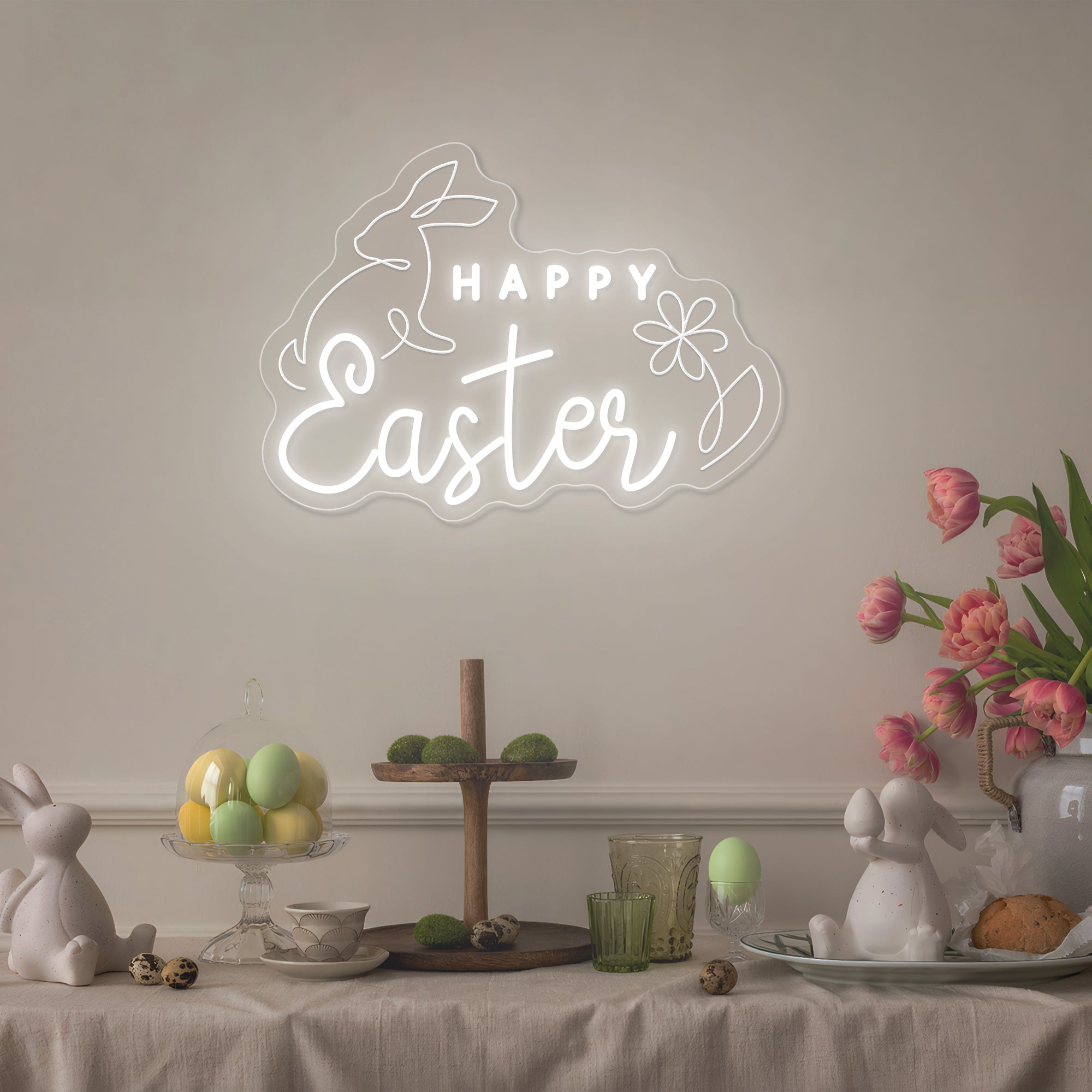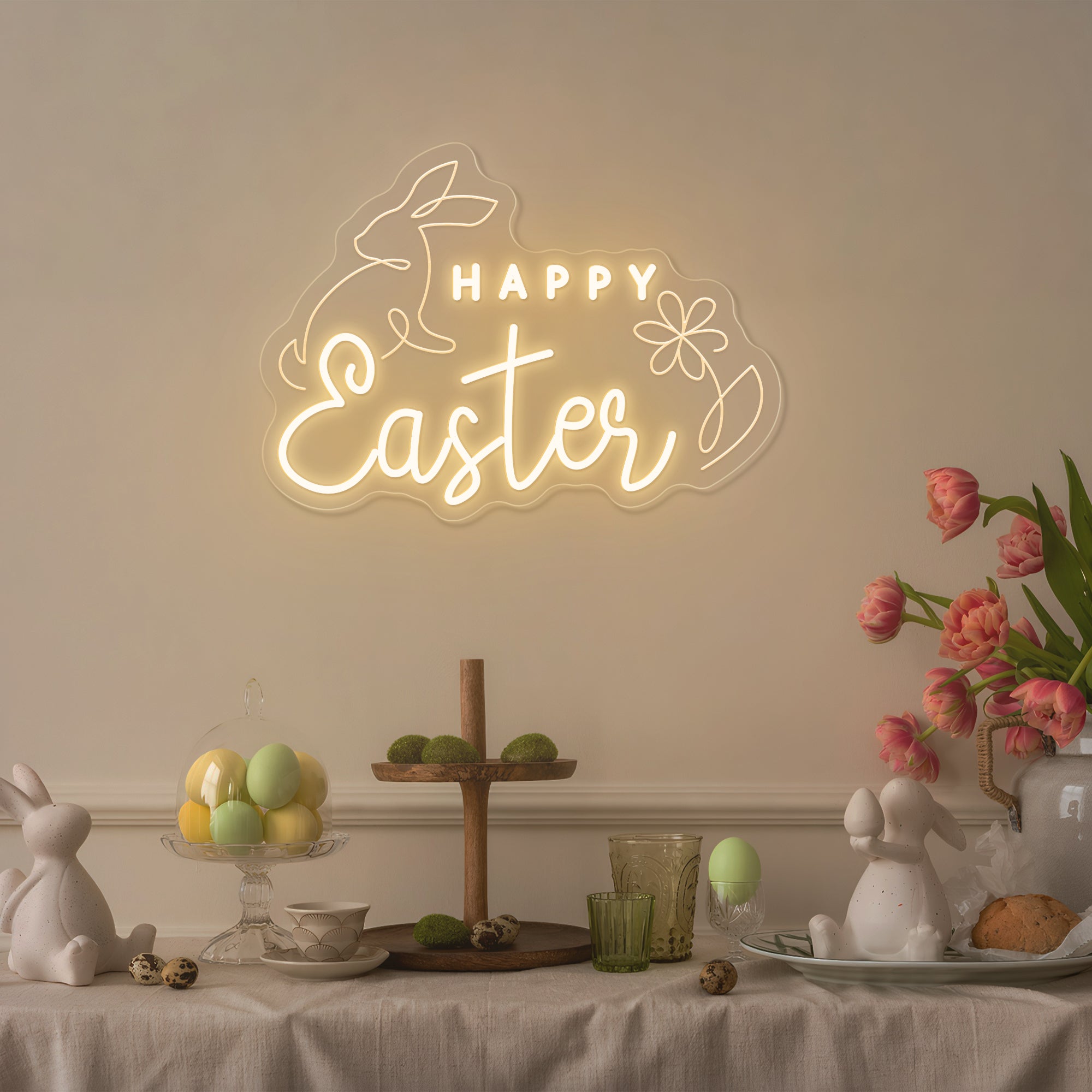 Soft & Festive Glow: Emits a gentle, welcoming light that captures the warmth and hope of Easter morning. It shines in a classic Easter palette of soft pastels—blush pink, buttercream yellow, gentle lavender, and fresh mint green—with the "Happy Easter" message often glowing in a warm, inviting white or gold. This even, cheerful illumination makes every detail—the rabbits' floppy ears, the delicate flower petals, the joyful lettering—appear to glow from within, casting a light that is both sweetly nostalgic and freshly modern. Perfect for creating a warm and magical holiday atmosphere.