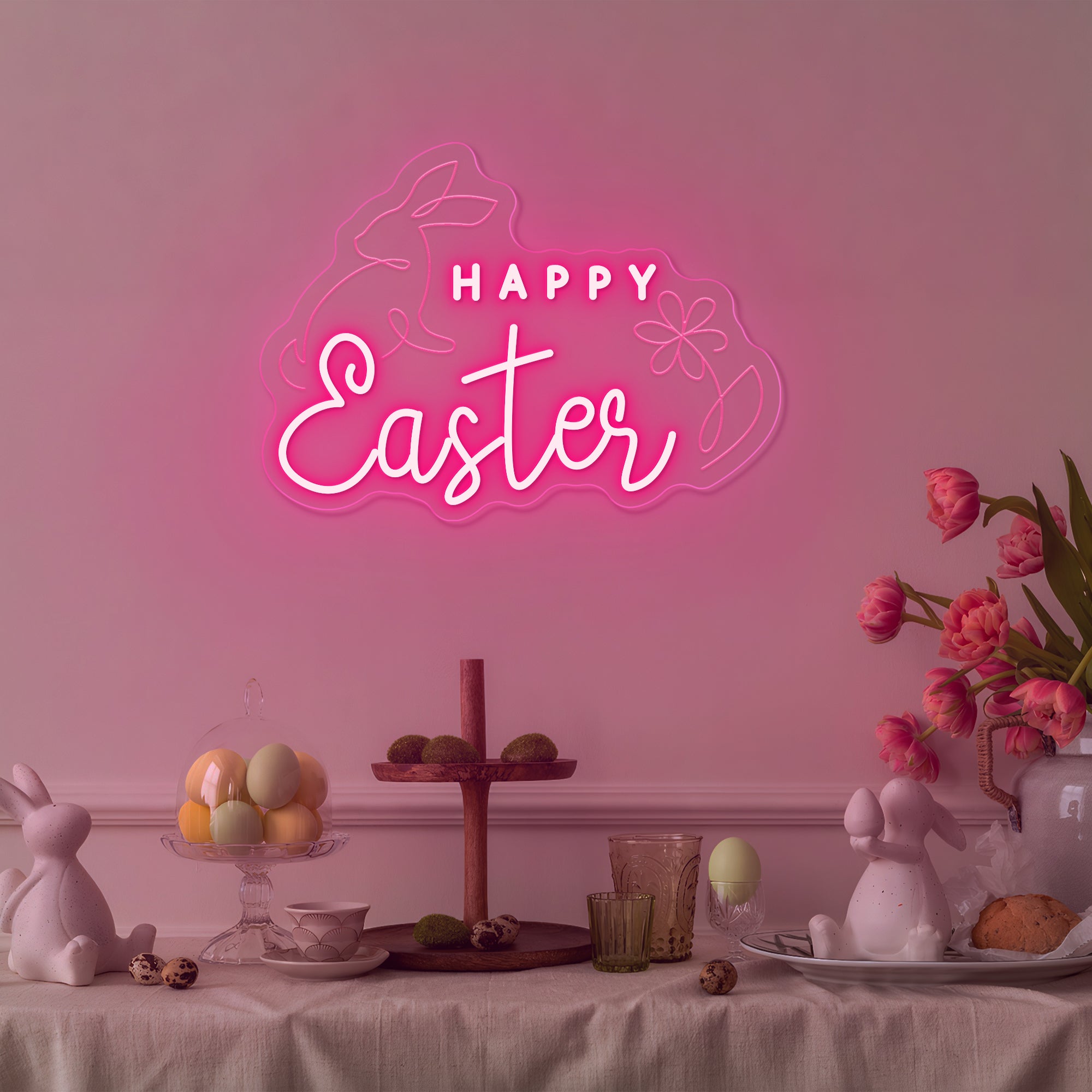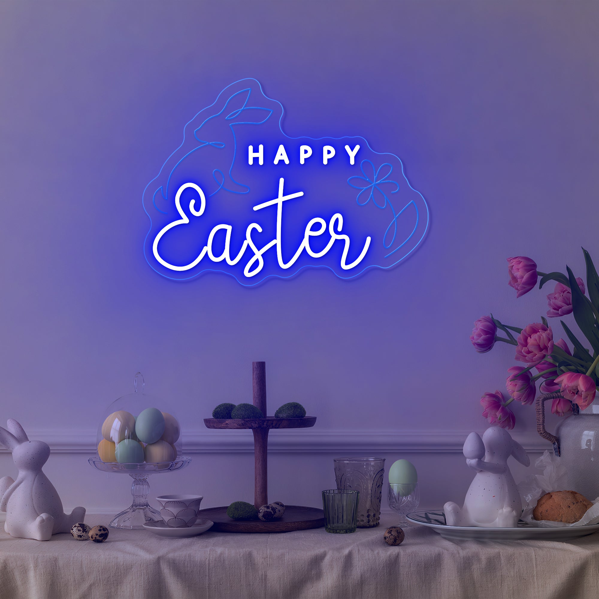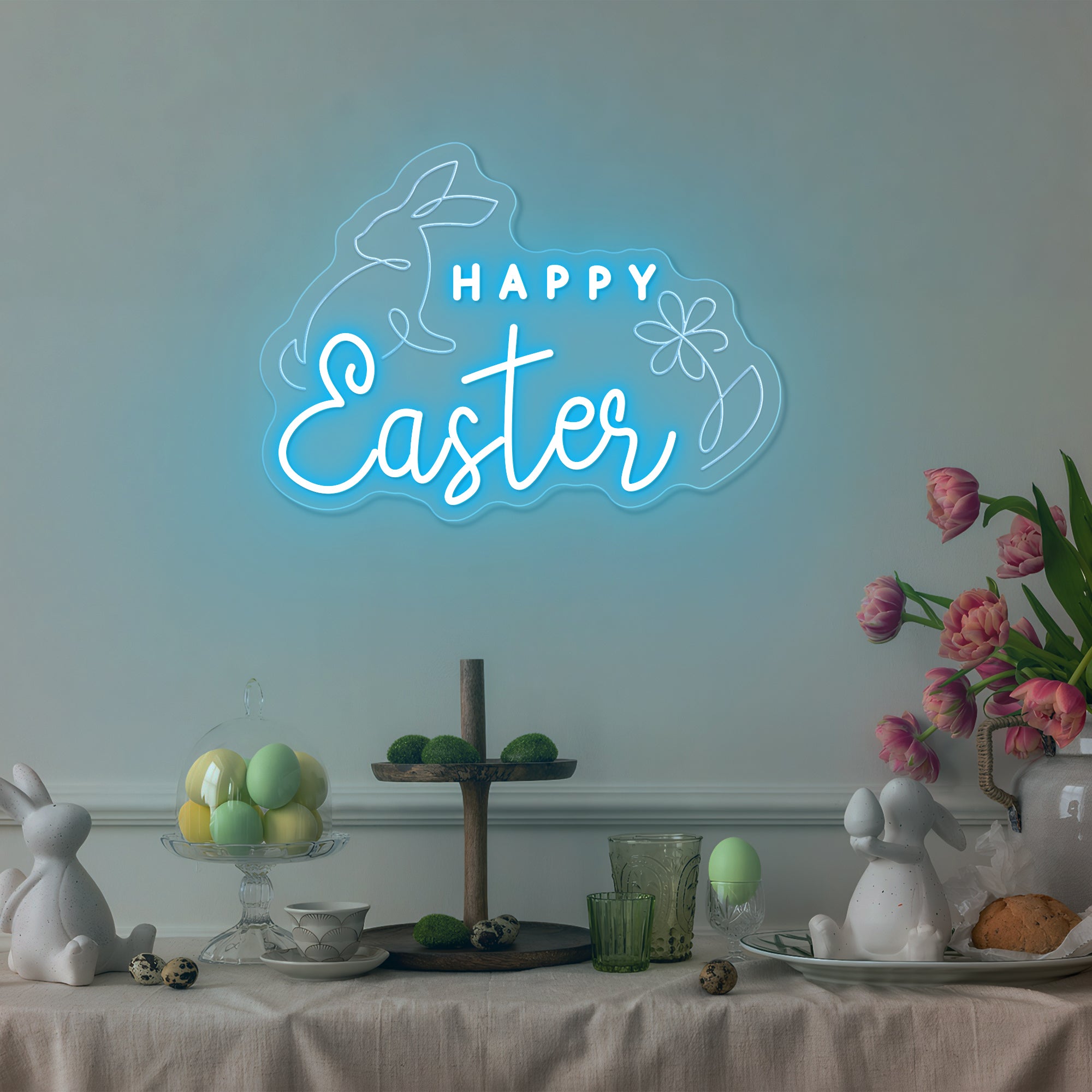 Soft & Festive Glow: Emits a gentle, welcoming light that captures the warmth and hope of Easter morning. It shines in a classic Easter palette of soft pastels—blush pink, buttercream yellow, gentle lavender, and fresh mint green—with the "Happy Easter" message often glowing in a warm, inviting white or gold. This even, cheerful illumination makes every detail—the rabbits' floppy ears, the delicate flower petals, the joyful lettering—appear to glow from within, casting a light that is both sweetly nostalgic and freshly modern. Perfect for creating a warm and magical holiday atmosphere.
