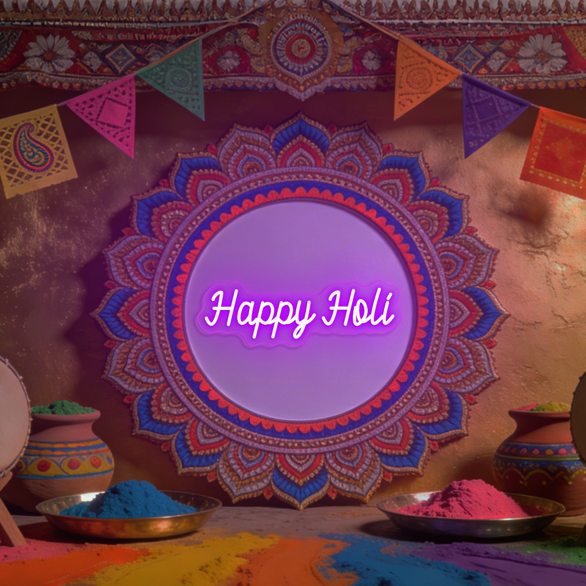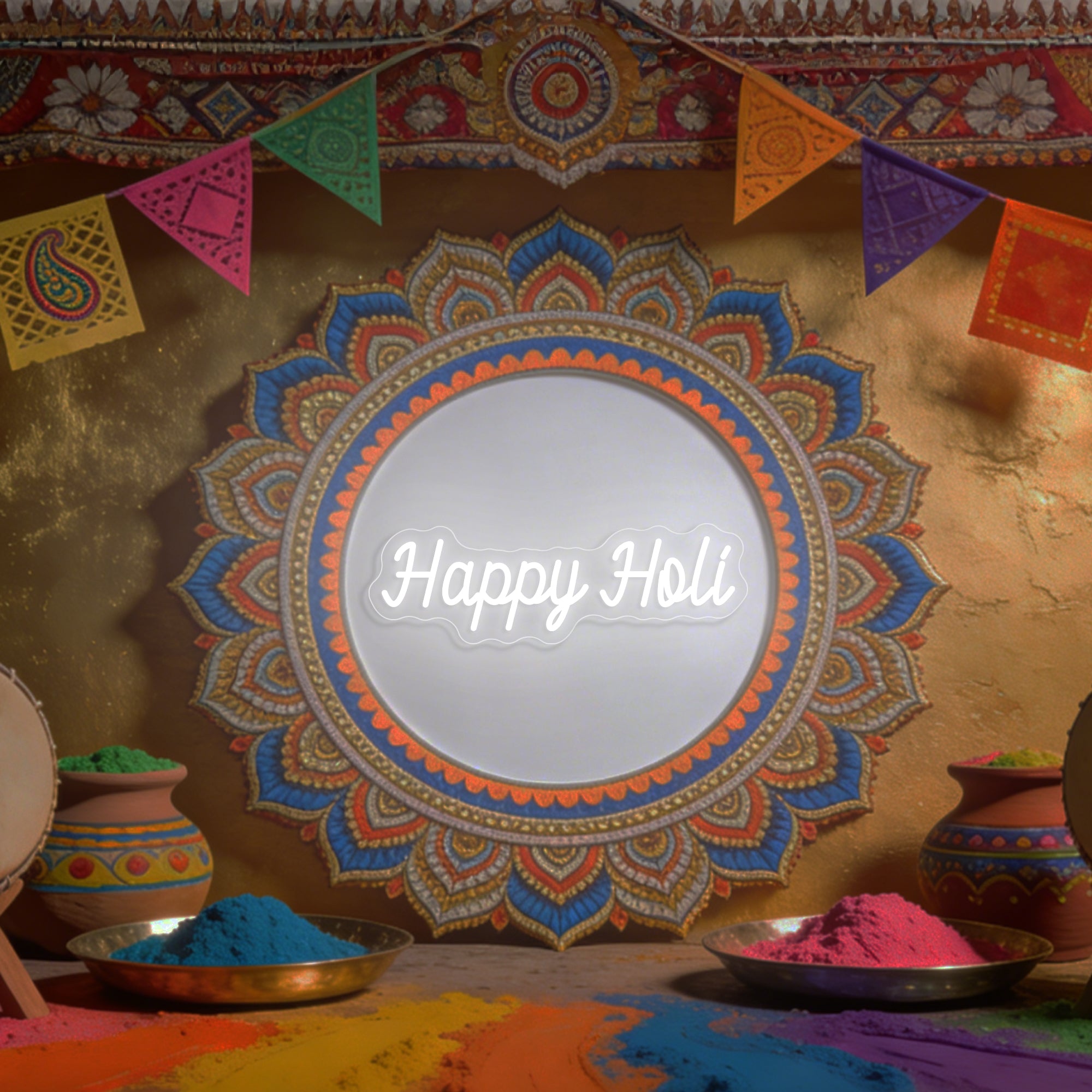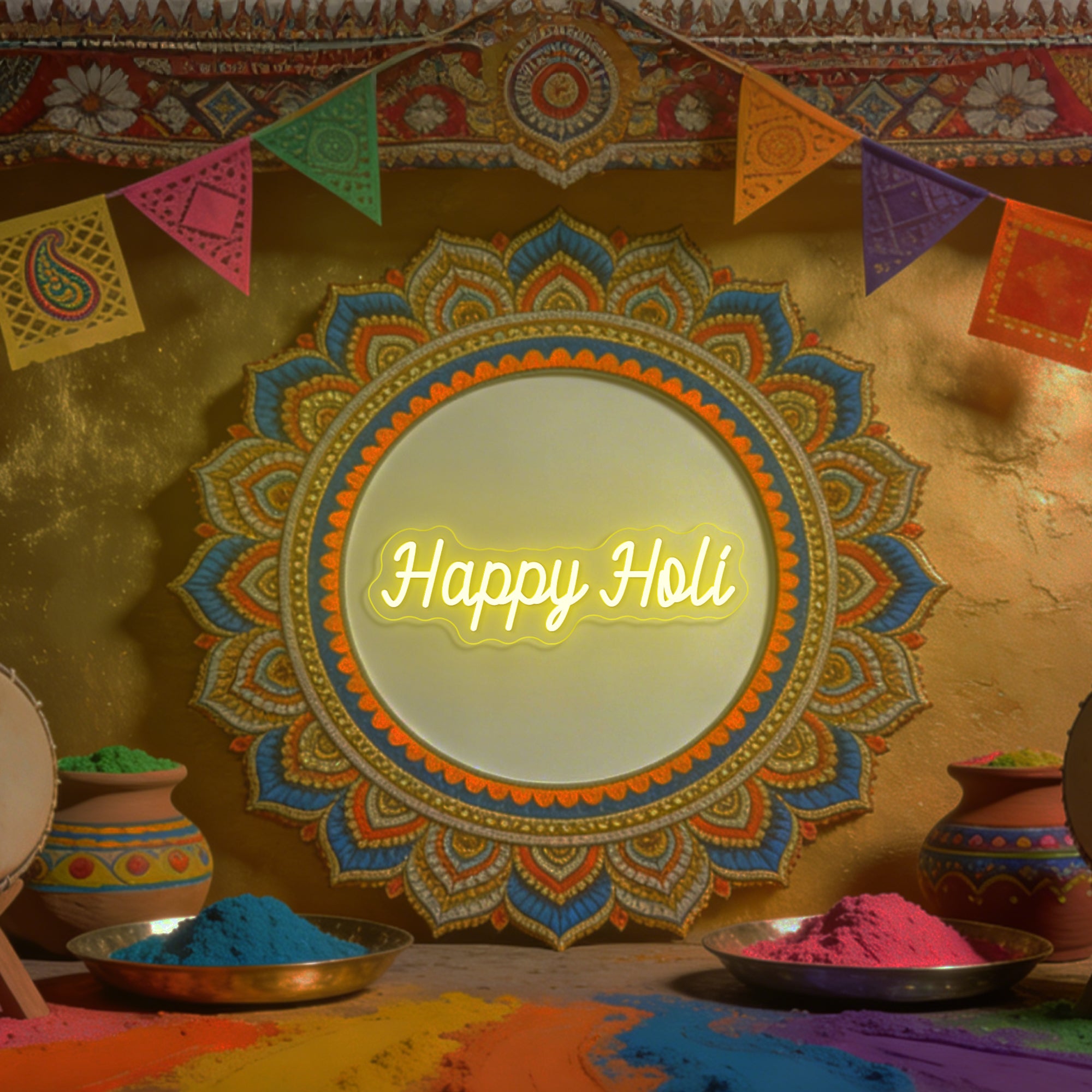 A must-have for Holi parties, Indian cultural events, or adding a splash of joyful color to any room year-round. It also makes a wonderfully thoughtful and festive gift. Its universally friendly message and vibrant design complement a wide range of interior styles. True to the spirit of personal joy, it is highly customizable: options to select specific festival colors, choose the size, and even add names or dates (like "Holi 2026") allow you to create a uniquely personal emblem of your celebration.