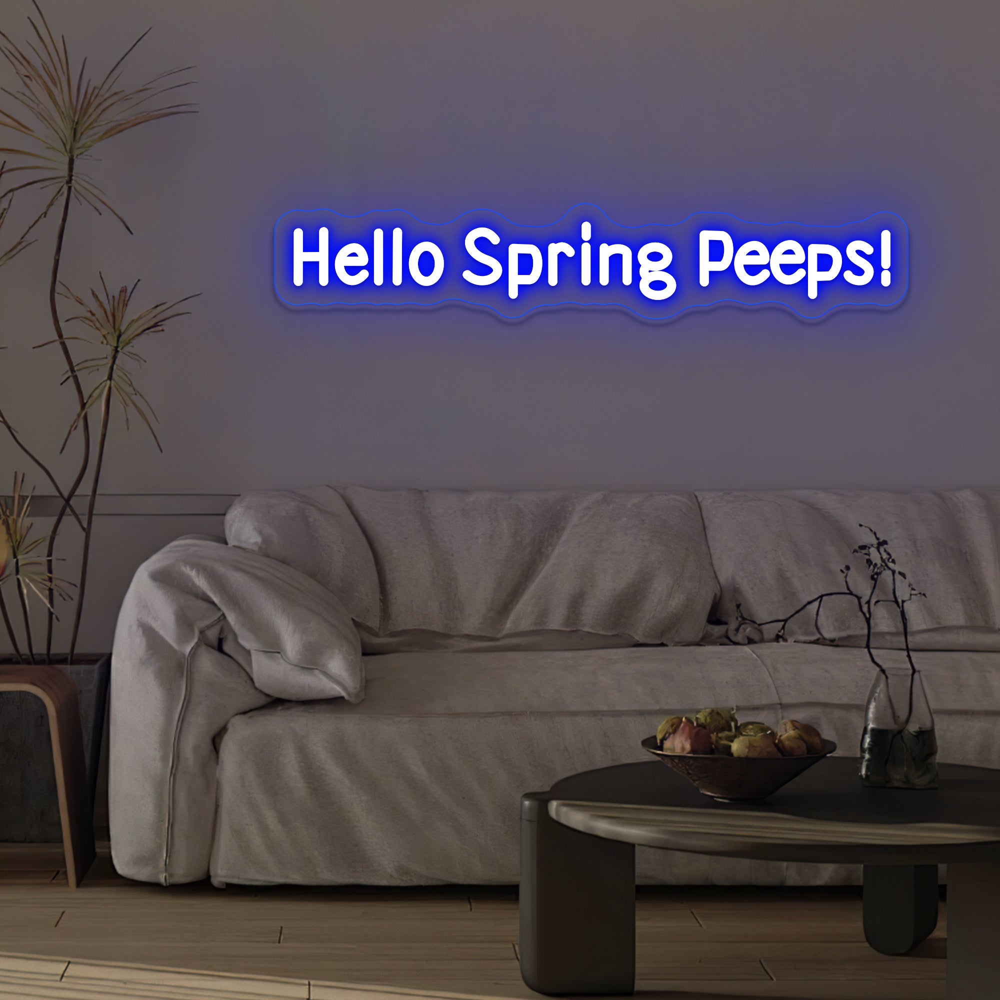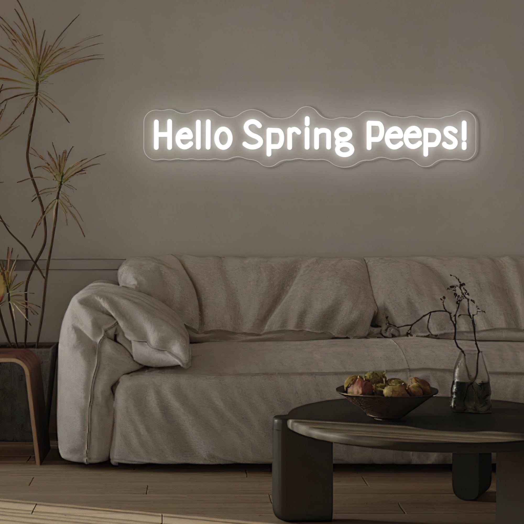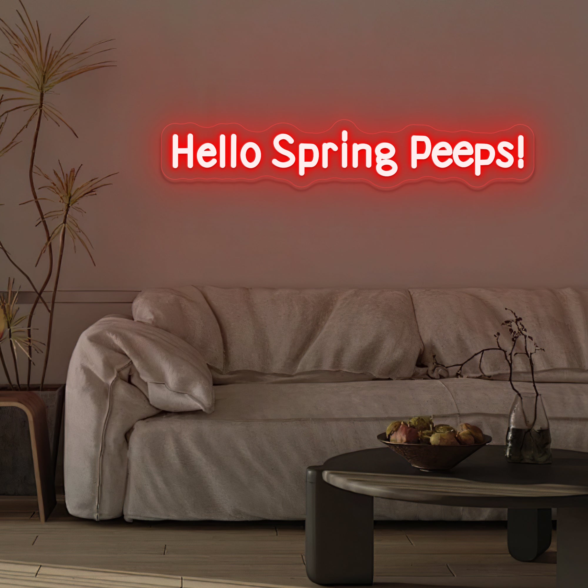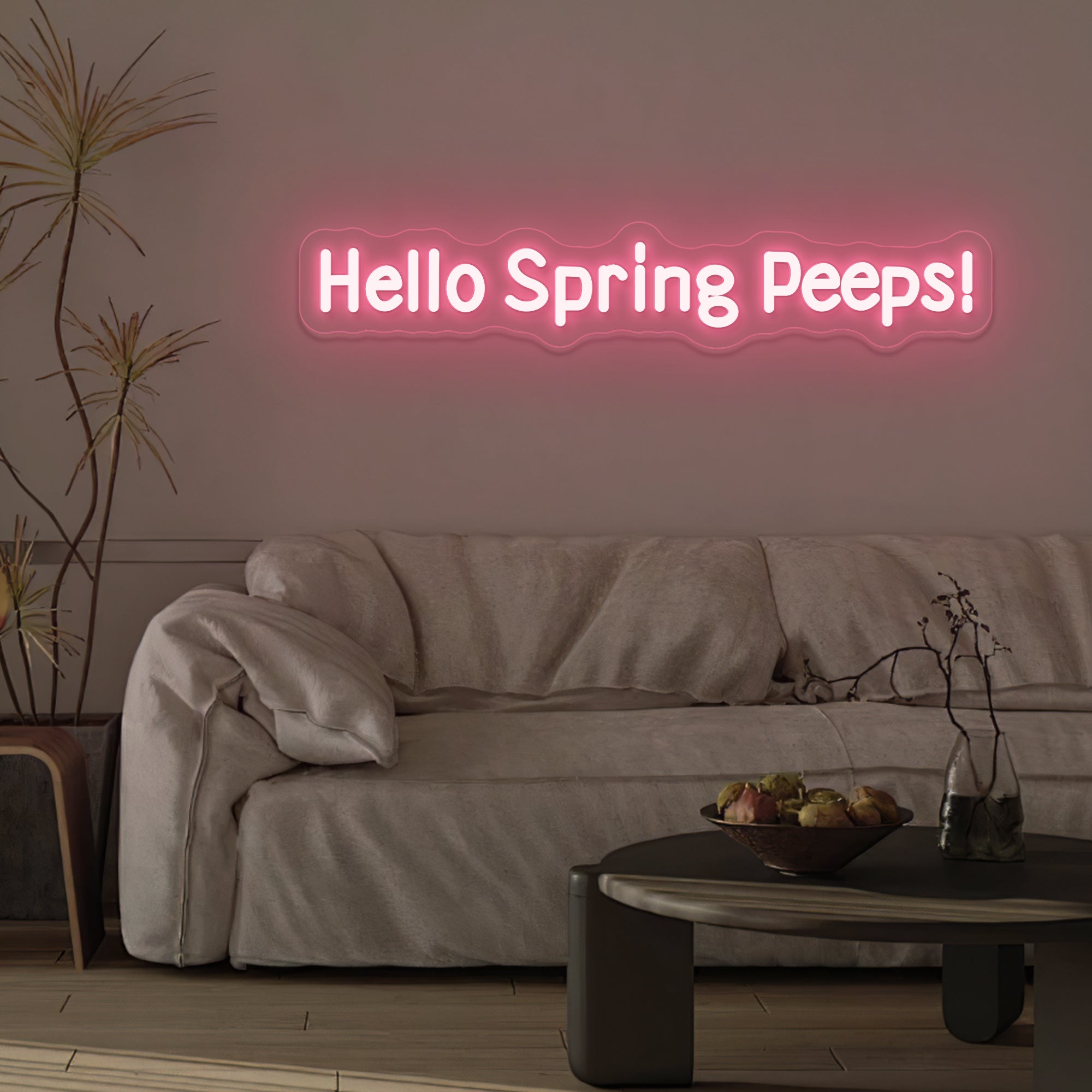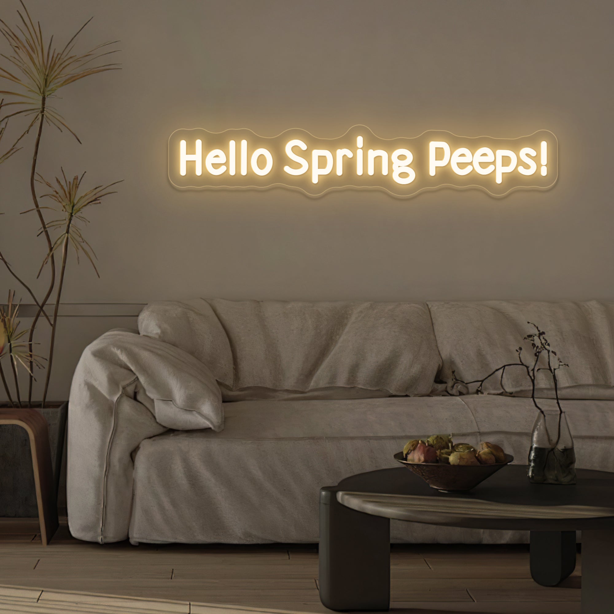 Witty & Typographic Design: This clever sign greets the season with a playful twist on words. The phrase “HELLO SPRING PEEPS” is rendered in a cheerful, modern font where the word “PEEPS” takes center stage—not as chicks, but as a friendly nod to your crew, your people, your springtime squad. Crafted in crisp, clean dual-line or multi-color LED neon, the design is all about smart, joyful typography. It transforms a casual, inclusive greeting into a luminous piece of contemporary word art that’s both stylish and full of personality.
