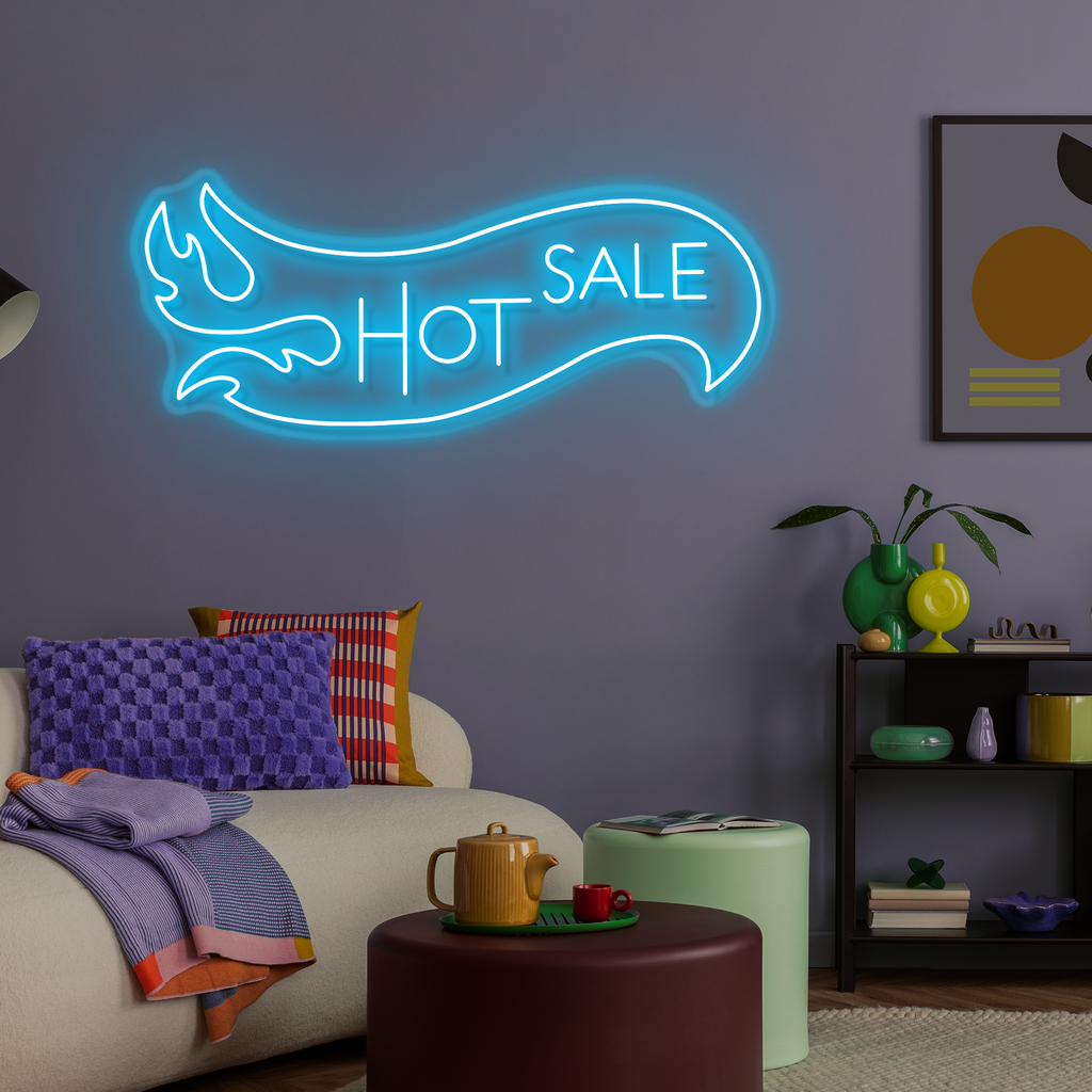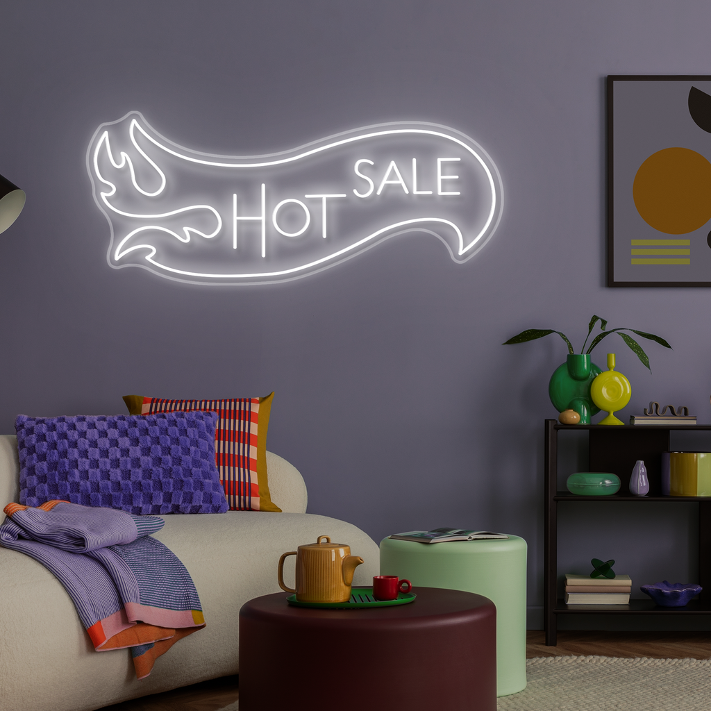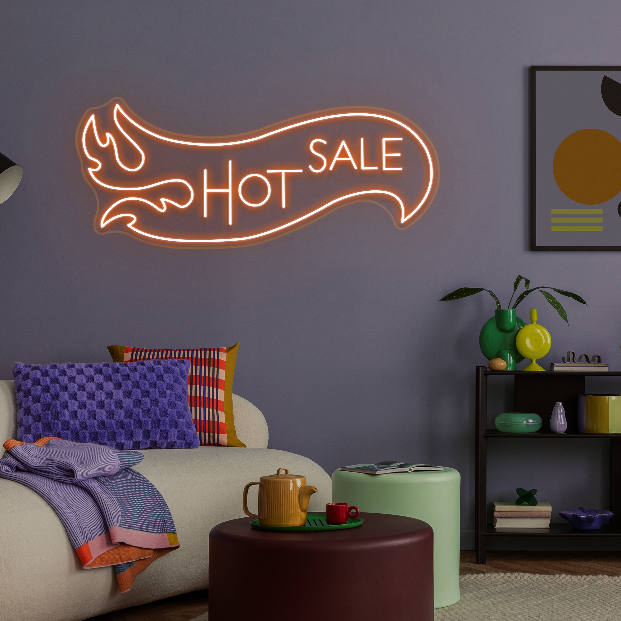Dynamic Sale Design: This eye-catching sign boldly displays the words "HOT SALE" in energetic, modern lettering, dramatically accented with stylized LED flame motifs that appear to leap and flicker, creating an irresistible sense of urgency and excitement.