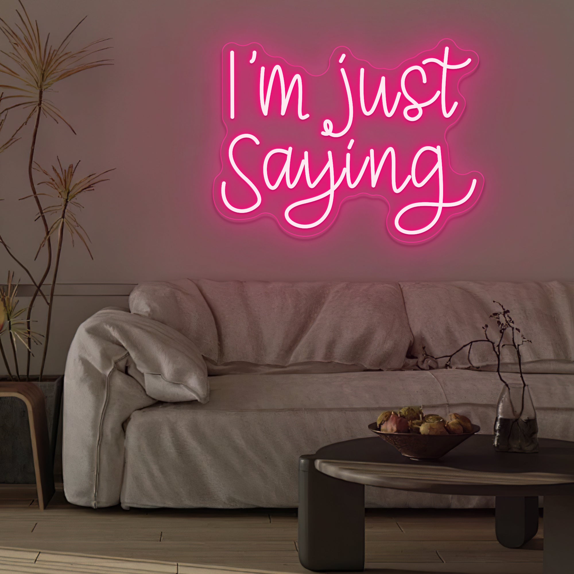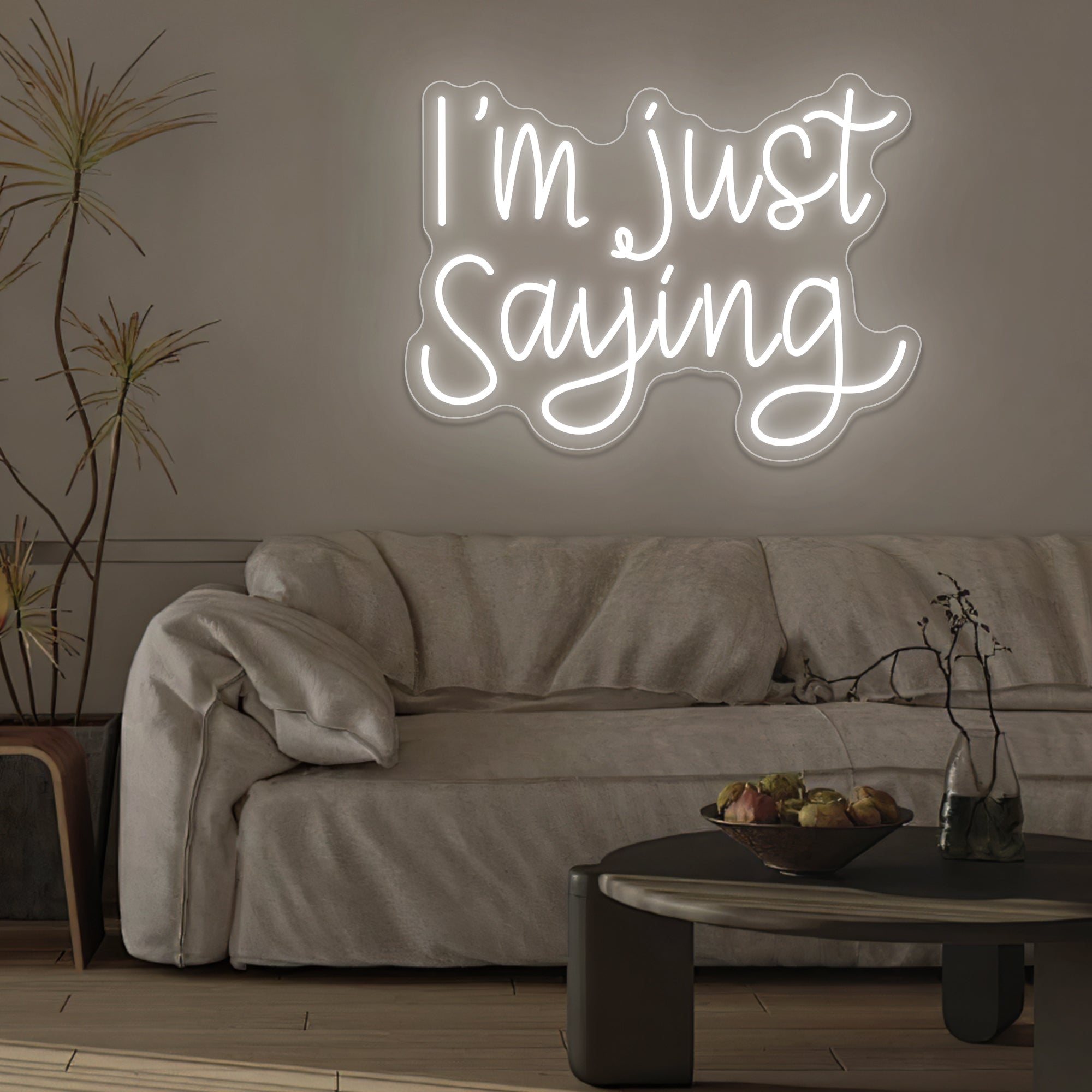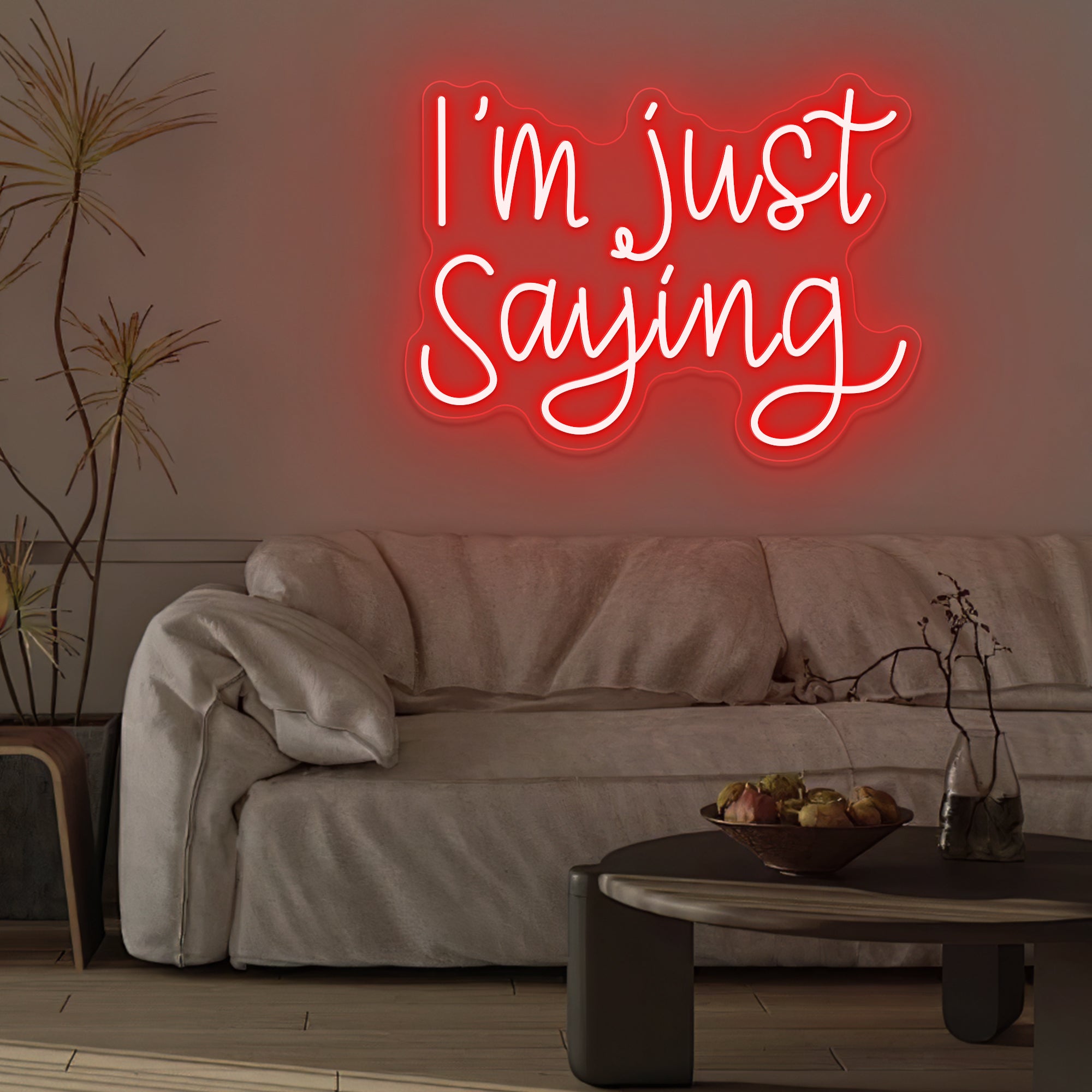 Casual & Conversational Typography: This sign captures a modern, offhand phrase with the relatable quote “I’M JUST SAYING” rendered in a clean, approachable font—often a smooth, casual script or a relaxed sans-serif. Designed with crisp dual-line LED neon, the text feels like a friendly aside made permanent, turning a casual expression into a witty and thought-provoking piece of wall art that invites a smile or a nod of agreement.