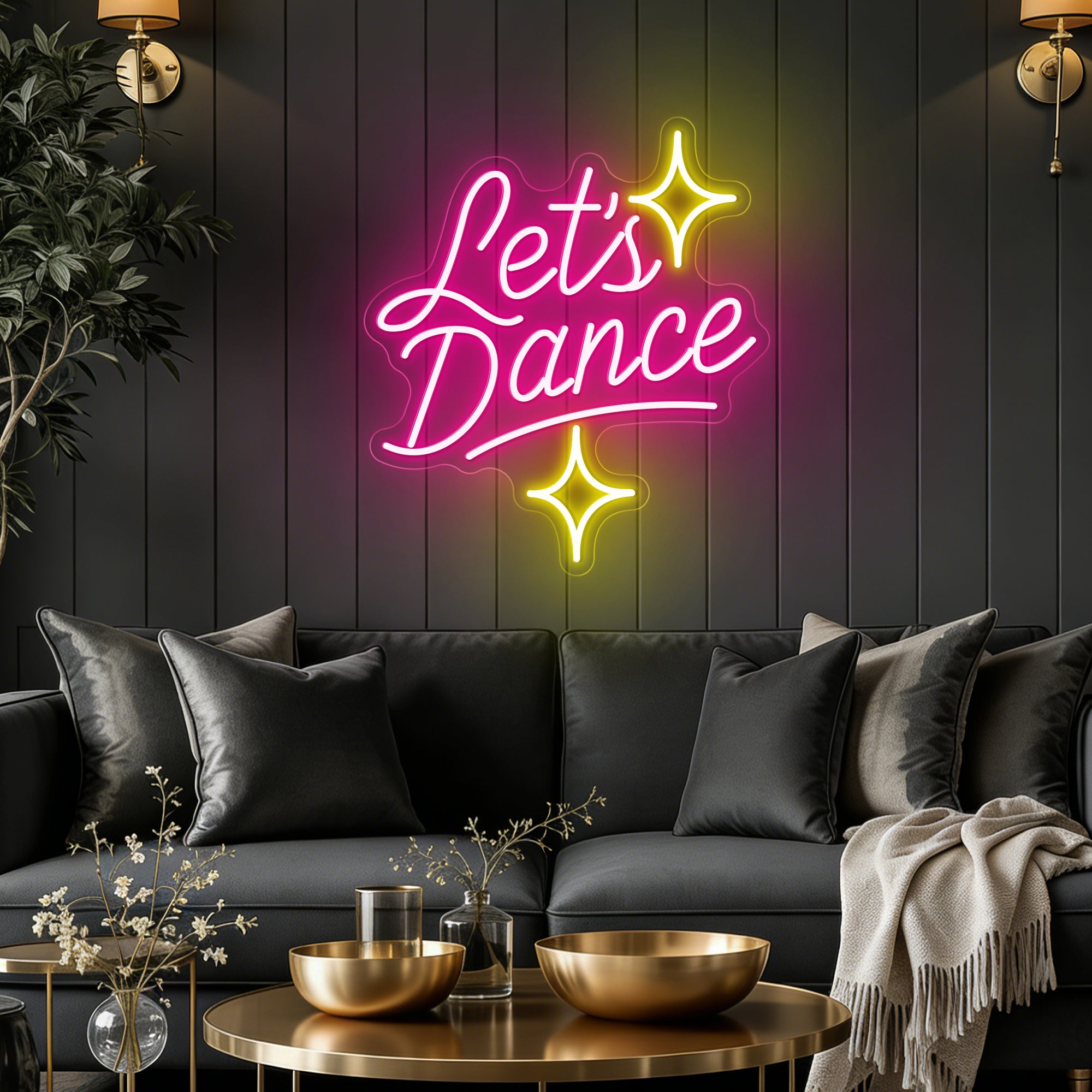 Dynamic Kinetic Typography Design: This electrifying sign brings the phrase "LET'S DANCE" to life through bold, angular typography that appears to be in motion. The letters are often stylized with sharp, flash-like accents or energetic lines radiating outward, all crafted in vibrant dual-line or multi-color LED neon. The design captures the sudden, joyful impulse to move, transforming an invitation into a visual explosion of rhythm and light.