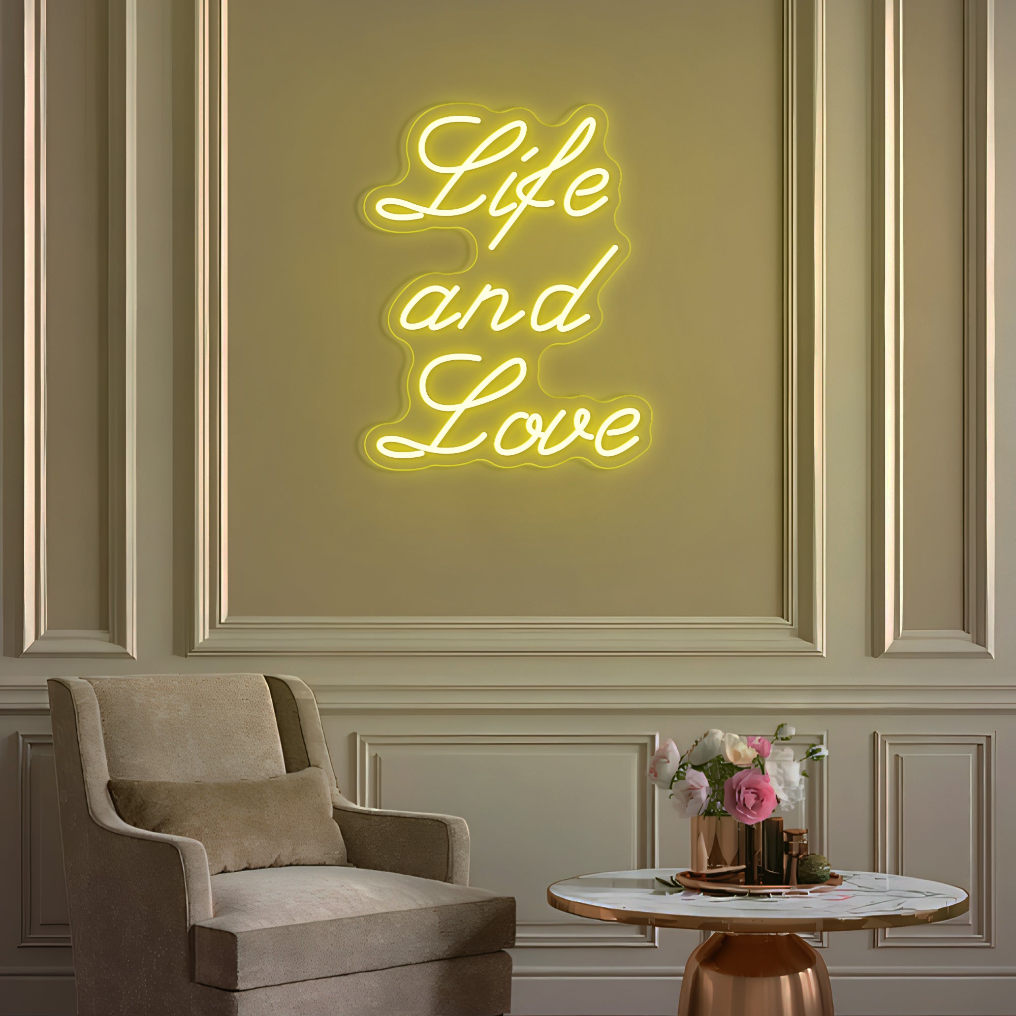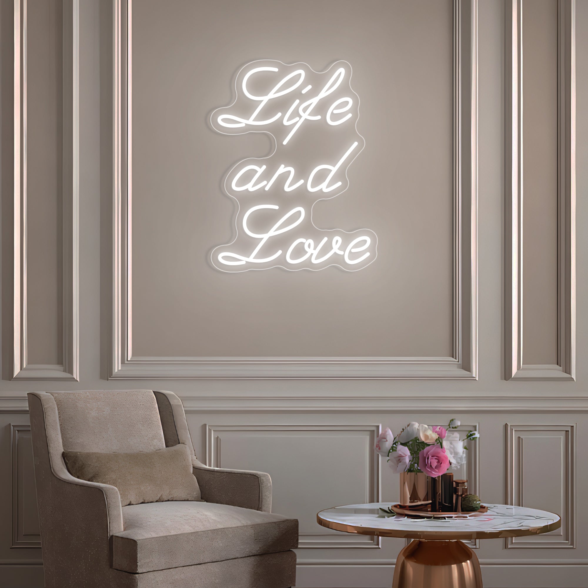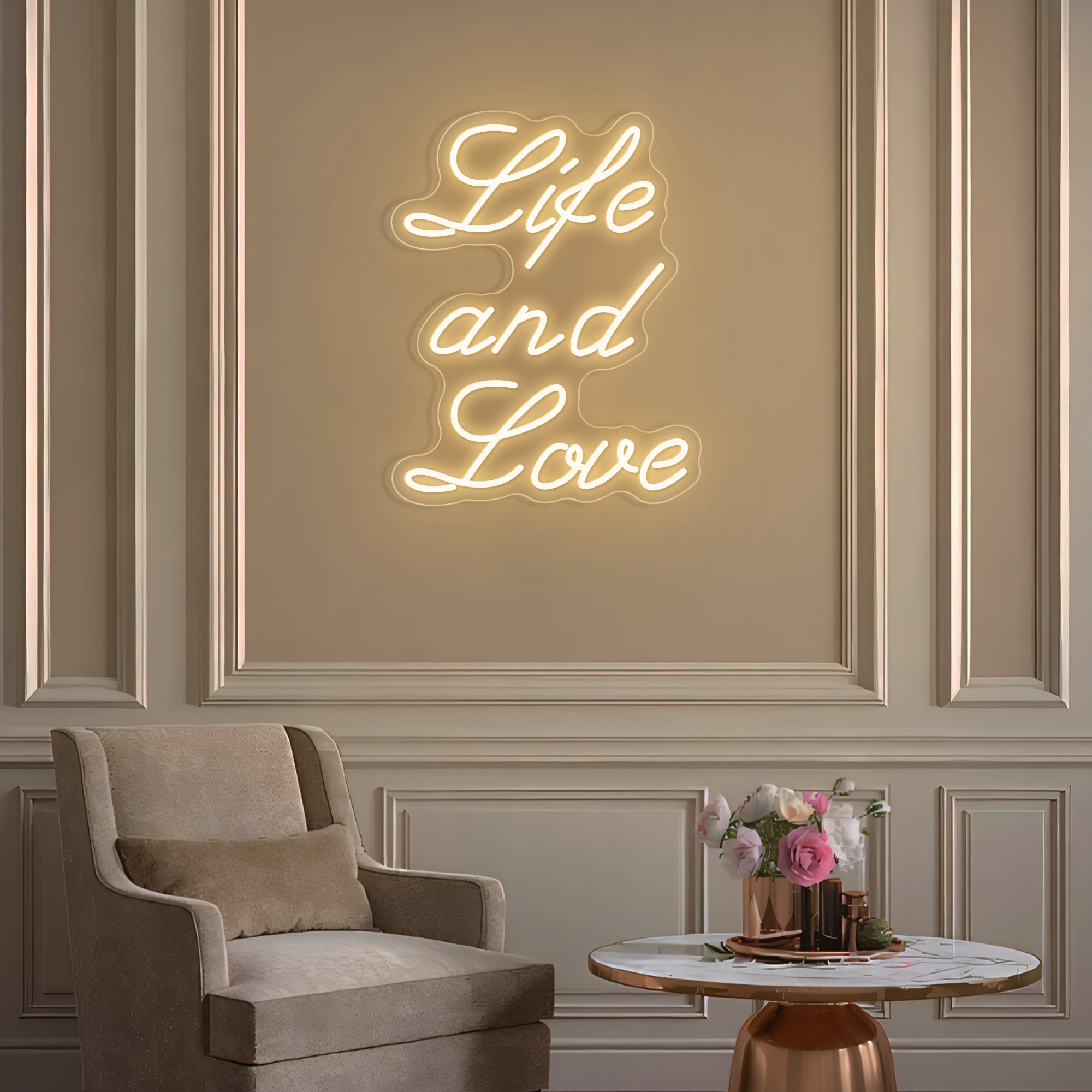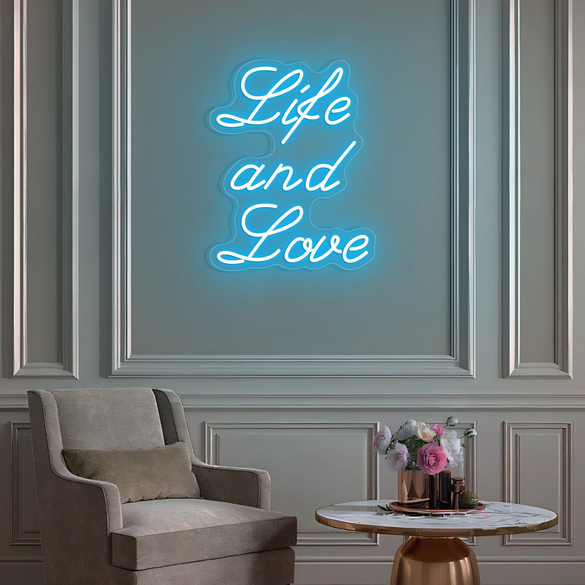 Classic & Balanced Typography Design: This sign presents its timeless message with clarity and intention: “Life And Love.” It features the words in a well-proportioned, classic font—such as a clean serif or an elegant modern typeface—with each word respectfully capitalized to give equal weight to both profound concepts. The design is intentionally clear and balanced, transforming an essential truth into a luminous, dignified statement. Expertly crafted in smooth, continuous LED neon lines, it turns a foundational belief into a permanent, radiant focal point for daily contemplation.