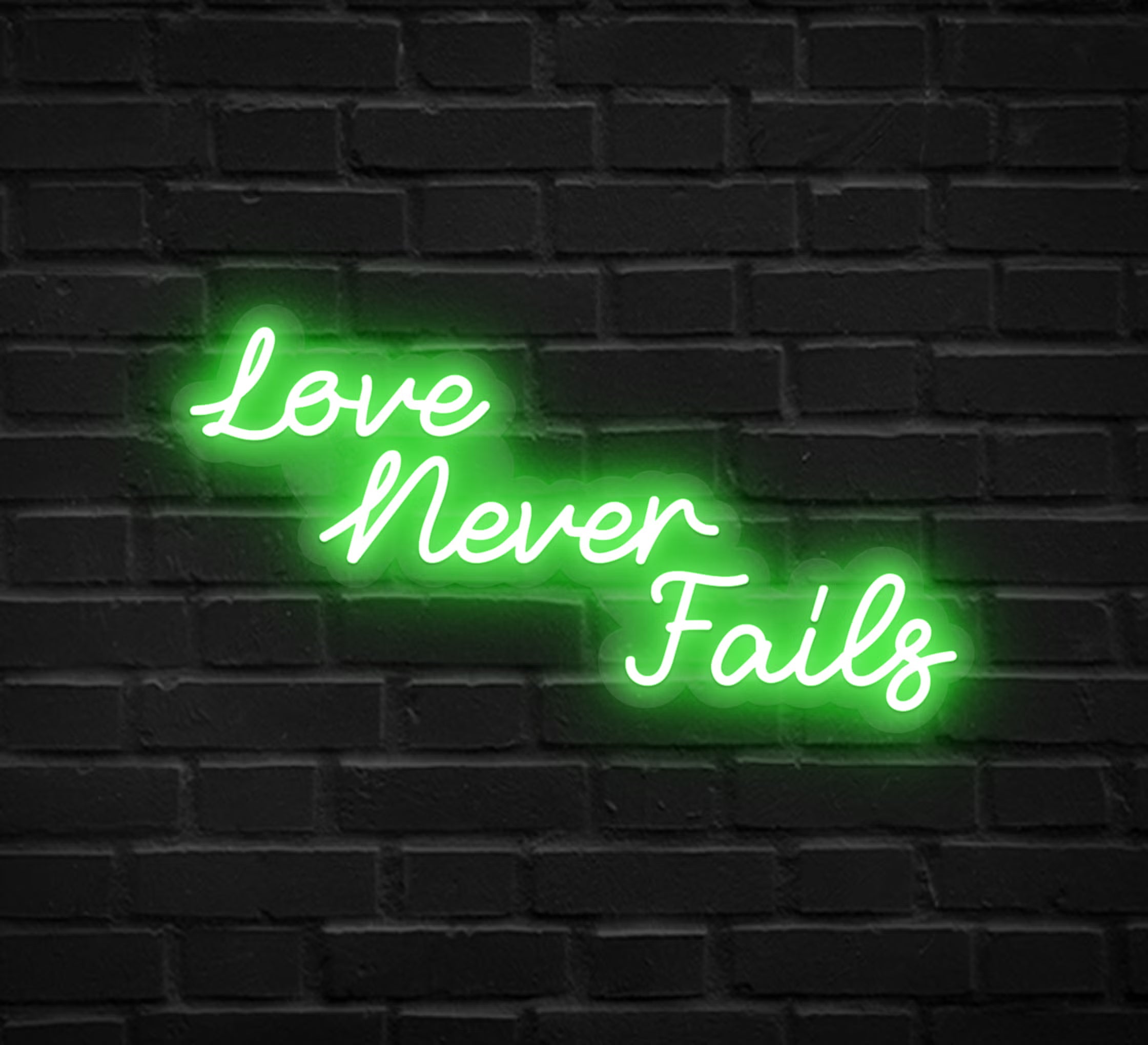 Timeless & Profound Typography Design: This sign declares a foundational truth with elegant simplicity. It features the powerful, unwavering statement “Love Never Fails” in a clean, classic font—such as a refined serif or a strong, modern sans-serif. The design is intentionally clear and dignified, transforming an eternal promise into a luminous, steadfast declaration. Expertly crafted in smooth, continuous LED neon, it turns a cornerstone belief into a radiant focal point for celebration and reflection.