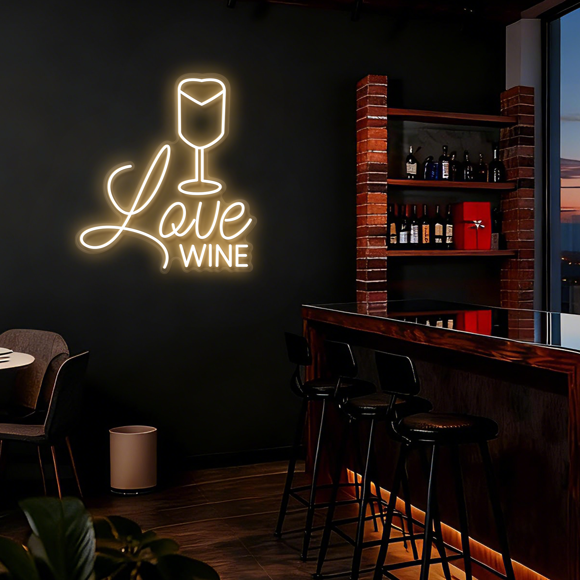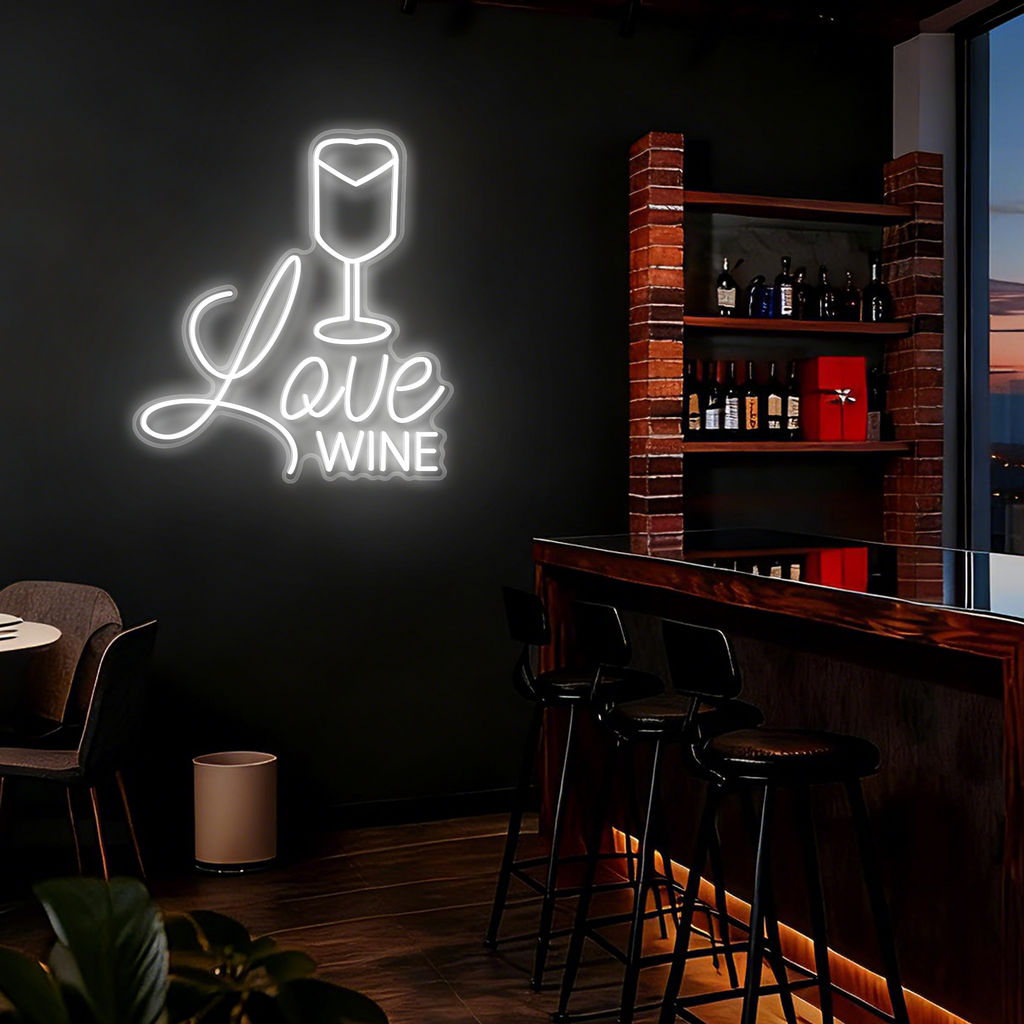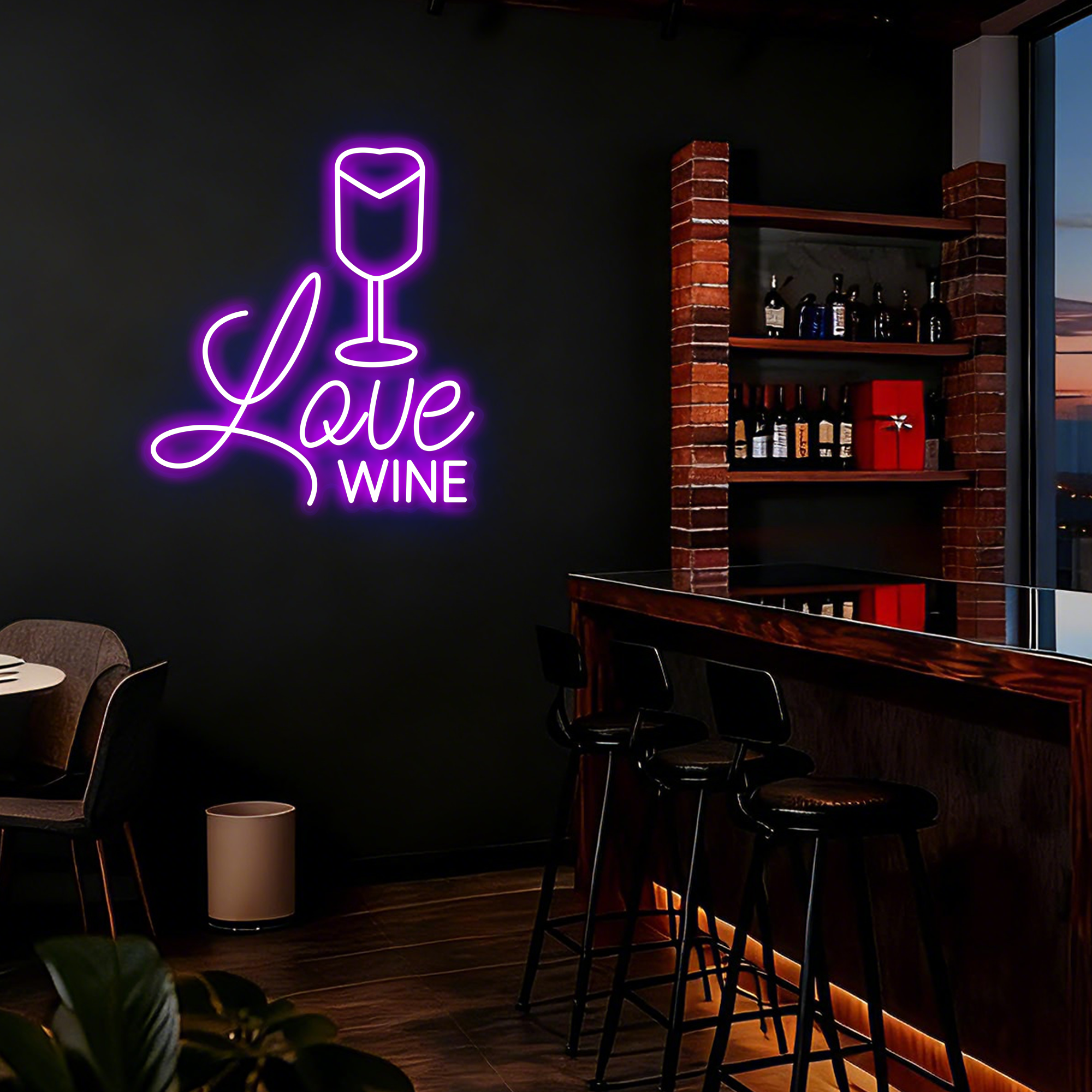 Elegant Wine Glass Design: Features a classic and elegant wine glass silhouette crafted from smooth LED neon lines, paired with the charming phrase "Love Wine" in a complementary script below.