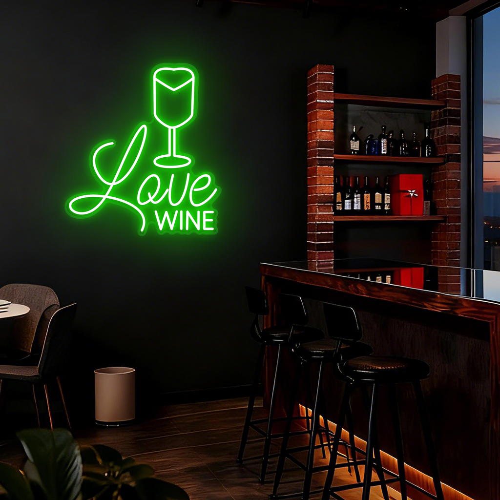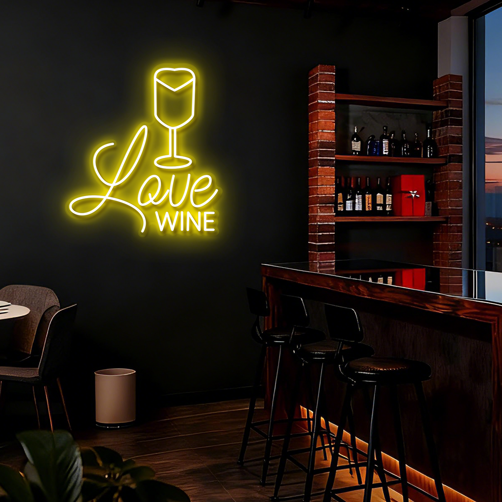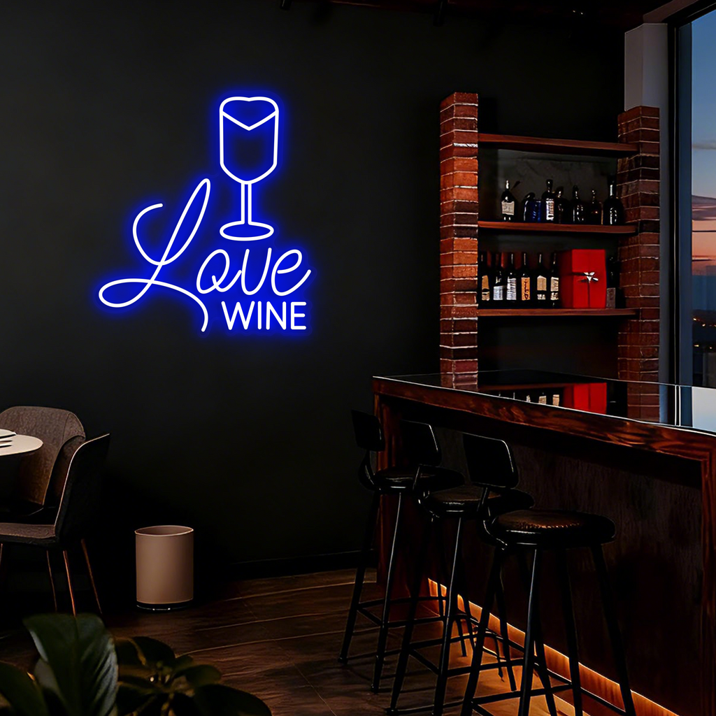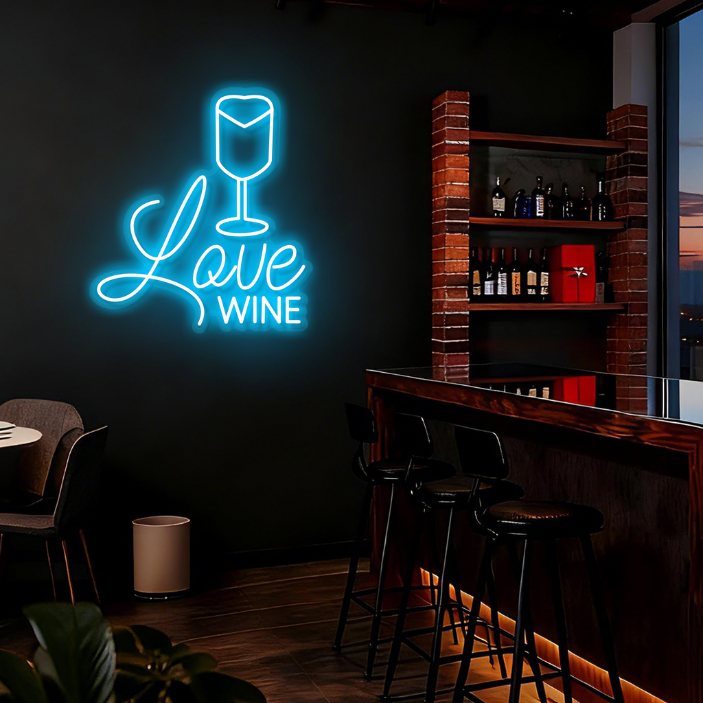 Elegant Wine Glass Design: Features a classic and elegant wine glass silhouette crafted from smooth LED neon lines, paired with the charming phrase "Love Wine" in a complementary script below.