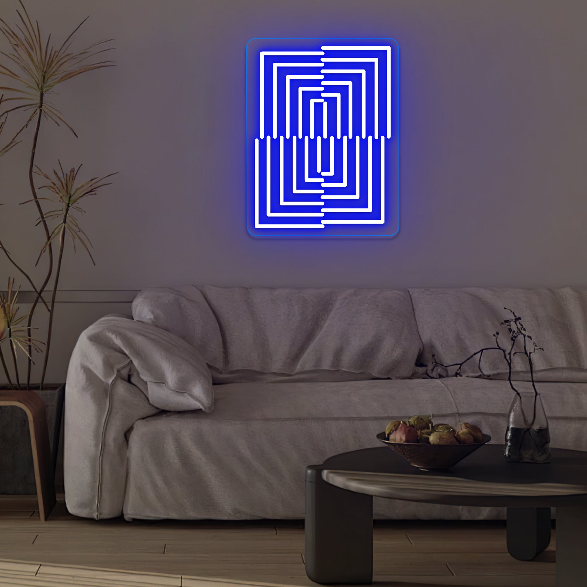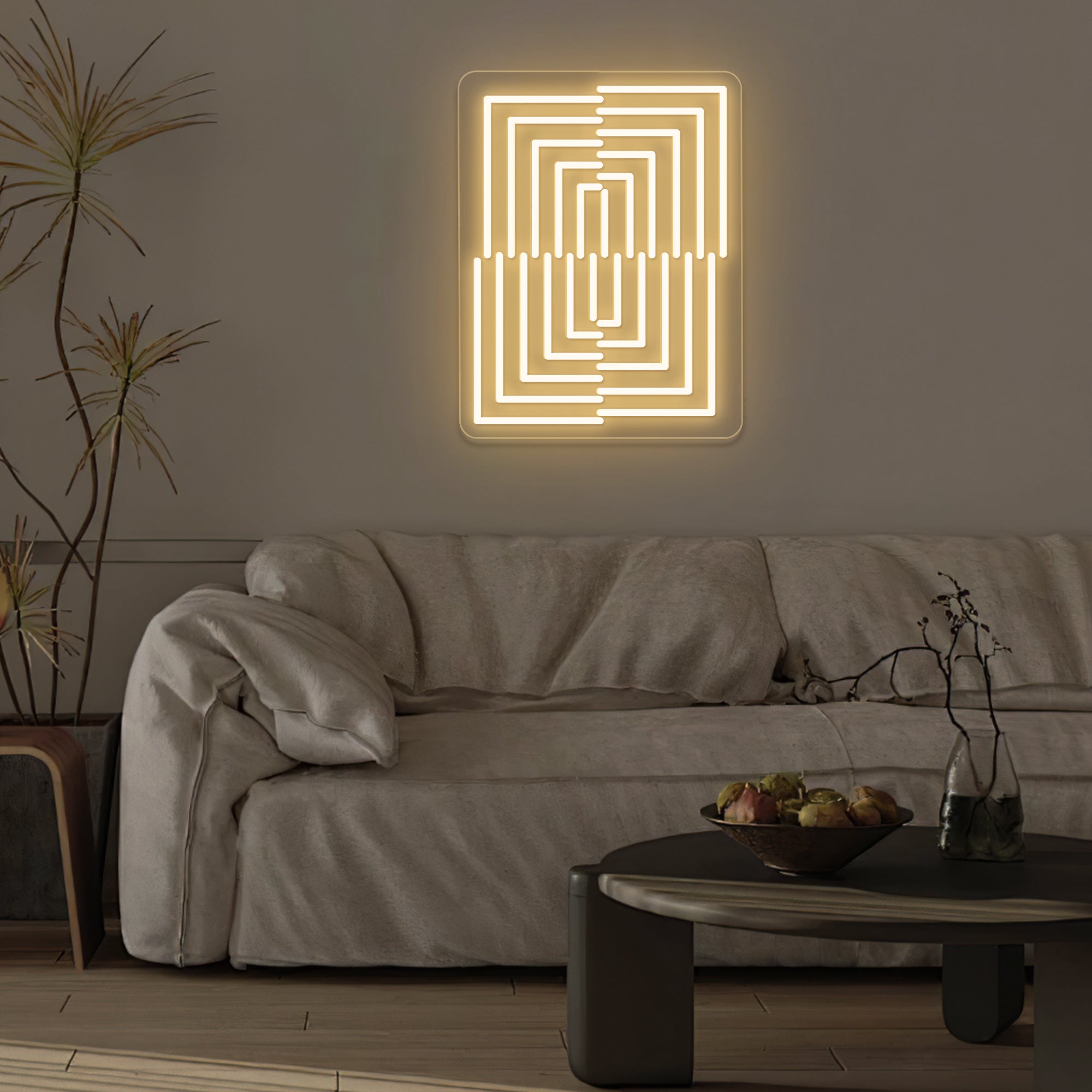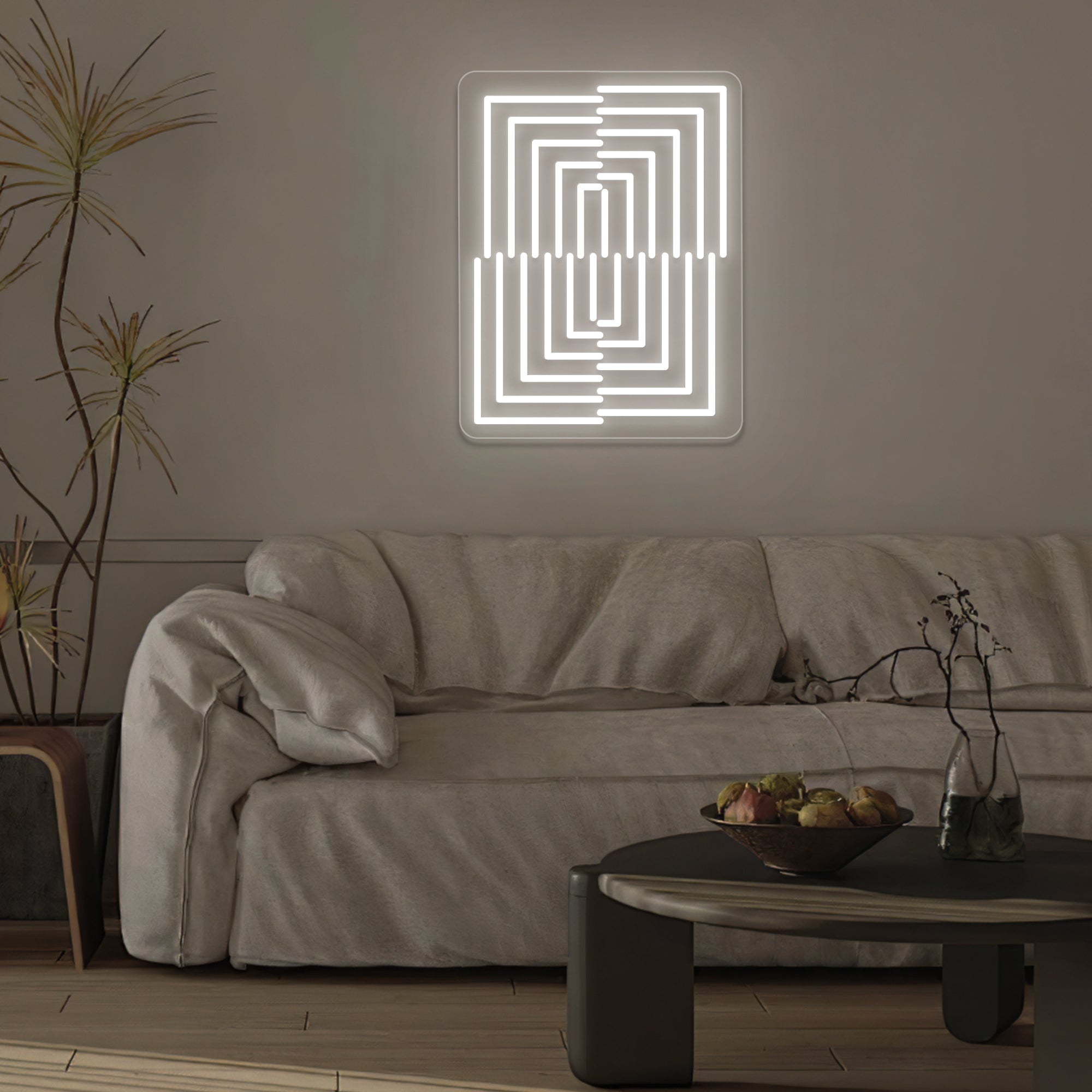 Abstract Geometric Composition: This sign transcends literal imagery, featuring a series of vertically staggered rectangular bars or lines of varying lengths and spacing. Rendered in pure, uninterrupted LED neon, the composition explores form, rhythm, and negative space. Inspired by mid-century modernism and contemporary abstract art, it transforms simple geometric elements into a luminous study of balance, proportion, and light itself—making a sophisticated statement that speaks through silence and form.