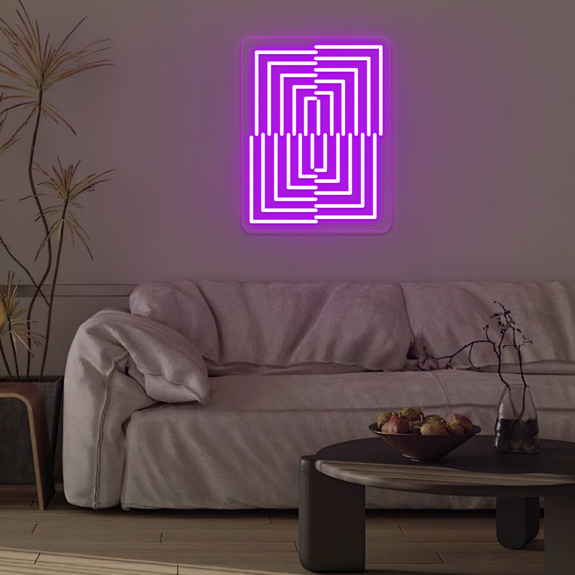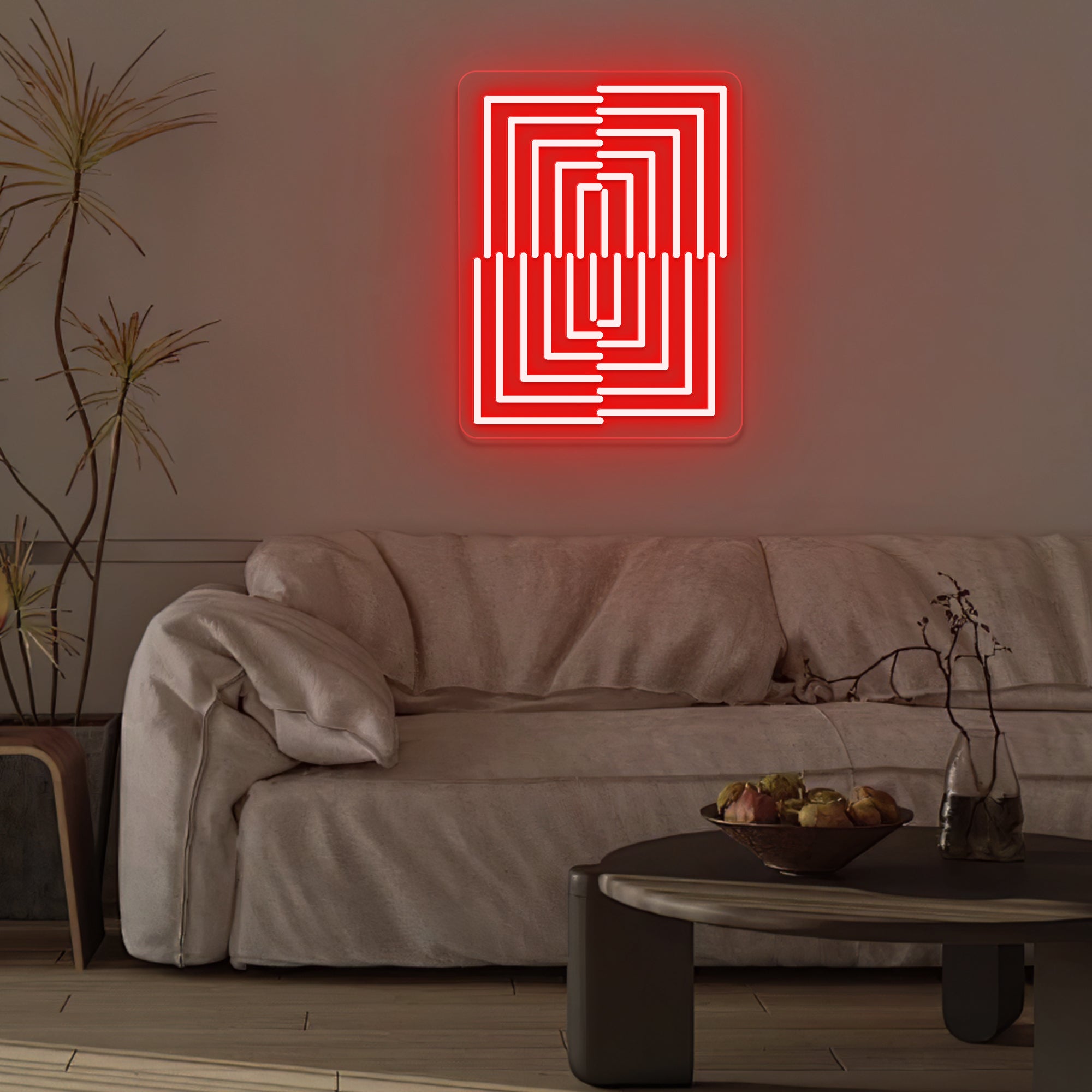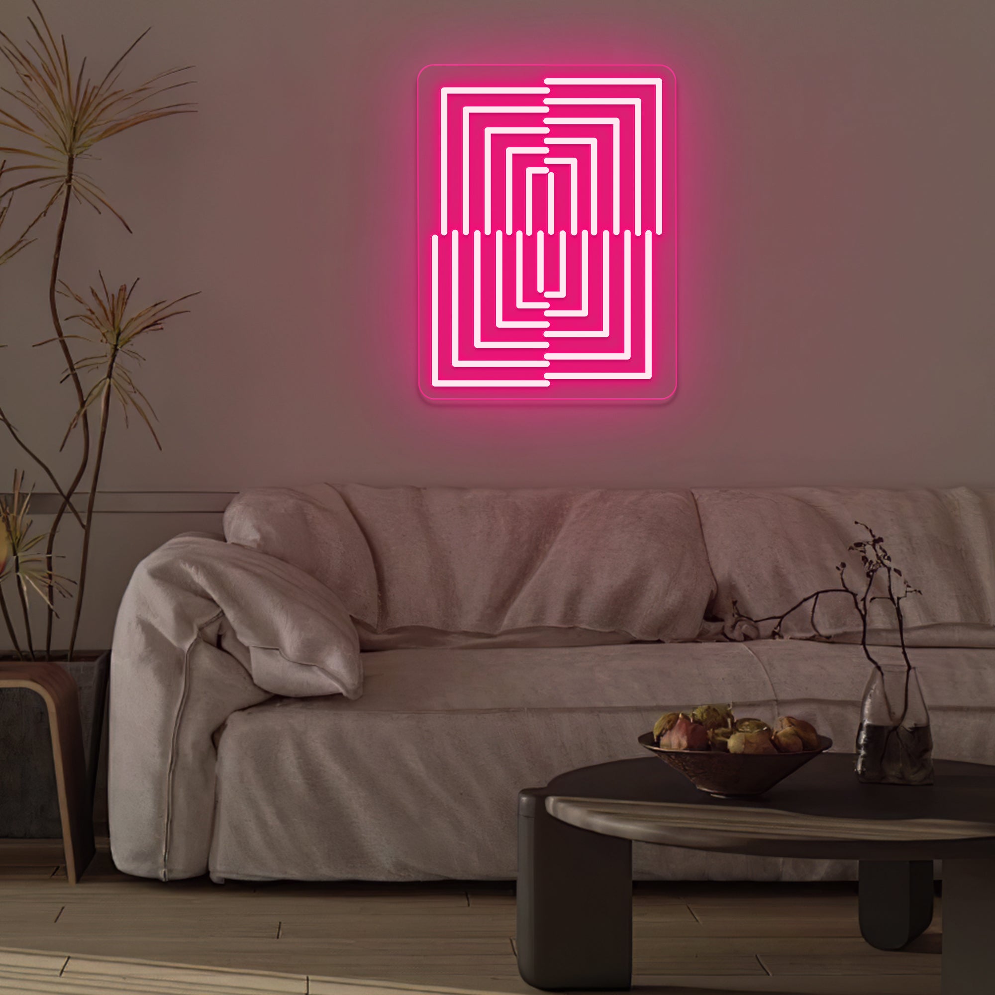 Abstract Geometric Composition: This sign transcends literal imagery, featuring a series of vertically staggered rectangular bars or lines of varying lengths and spacing. Rendered in pure, uninterrupted LED neon, the composition explores form, rhythm, and negative space. Inspired by mid-century modernism and contemporary abstract art, it transforms simple geometric elements into a luminous study of balance, proportion, and light itself—making a sophisticated statement that speaks through silence and form.