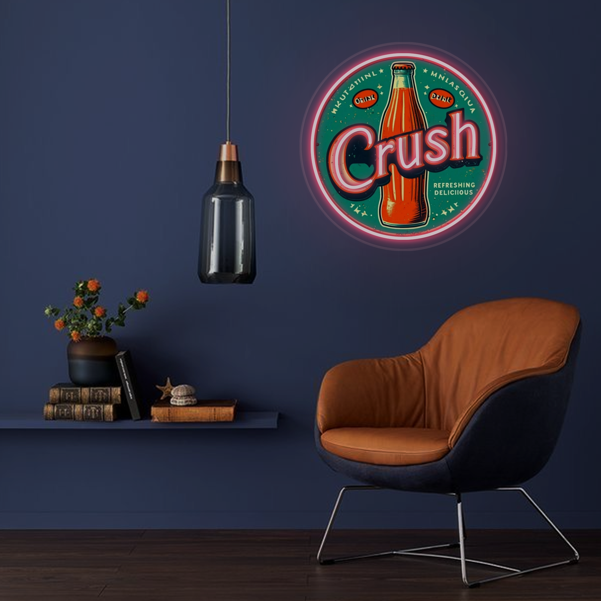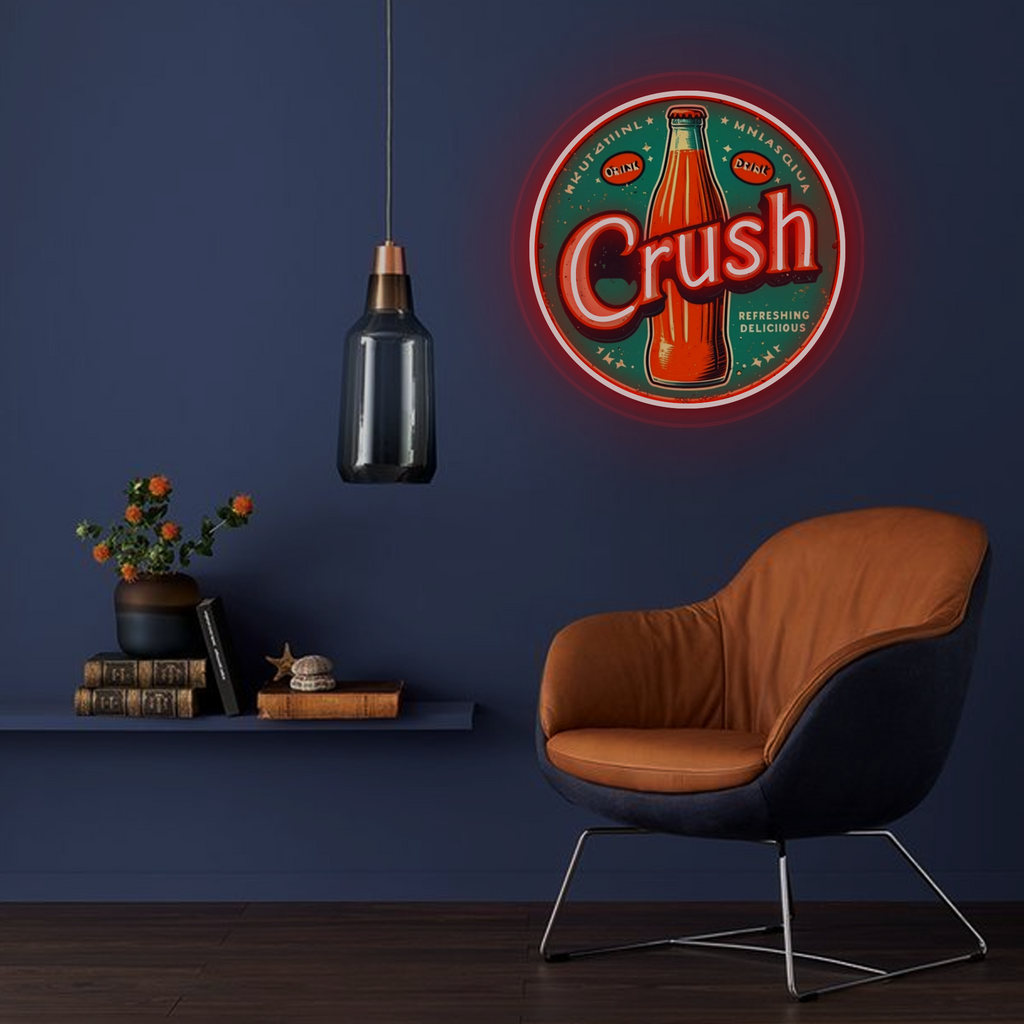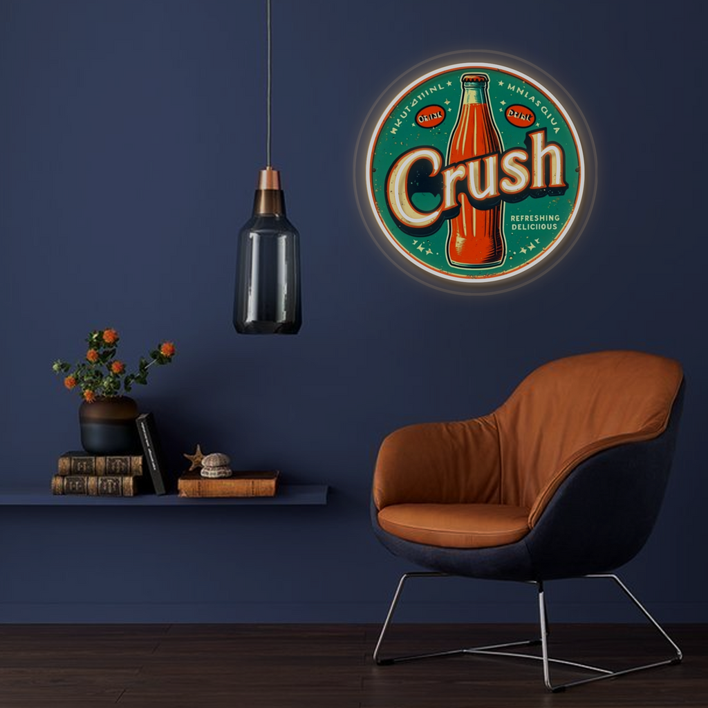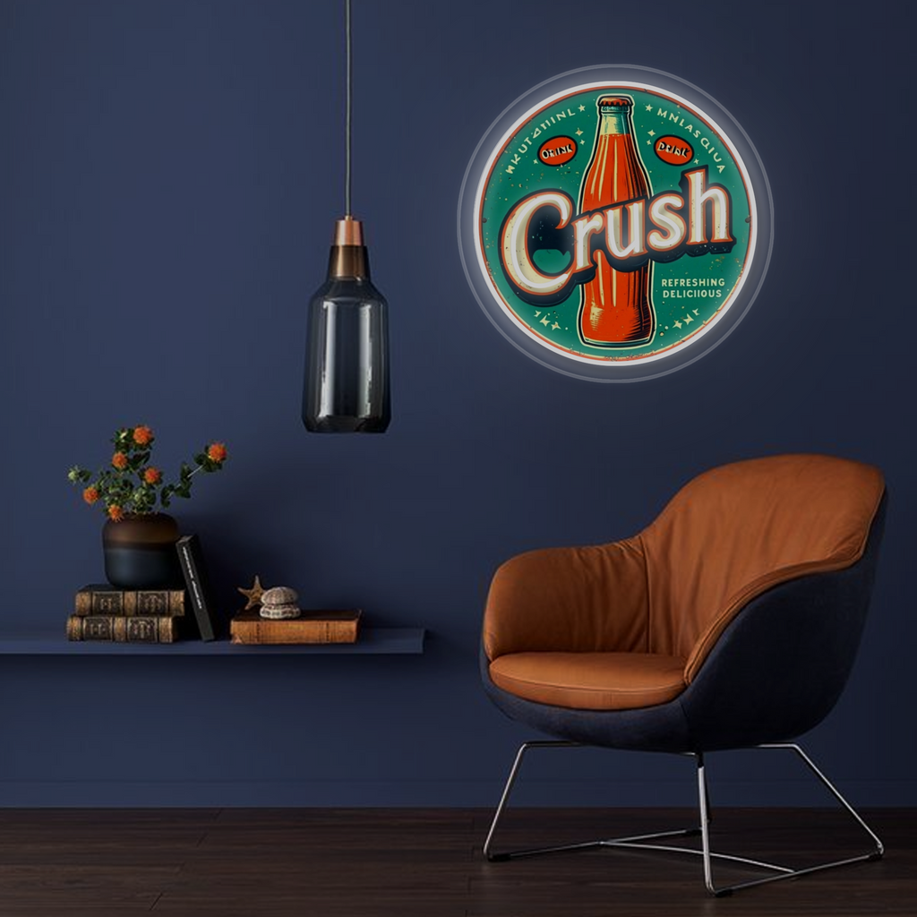 Vintage-Inspired Design: This eye-catching sign features a classic circular neon frame surrounding a vibrant, UV-printed illustration of an iconic orange Crush soda bottle. The bold “Crush” lettering and period-accurate graphics are expertly crafted to evoke a strong sense of nostalgia and mid-century Americana.
