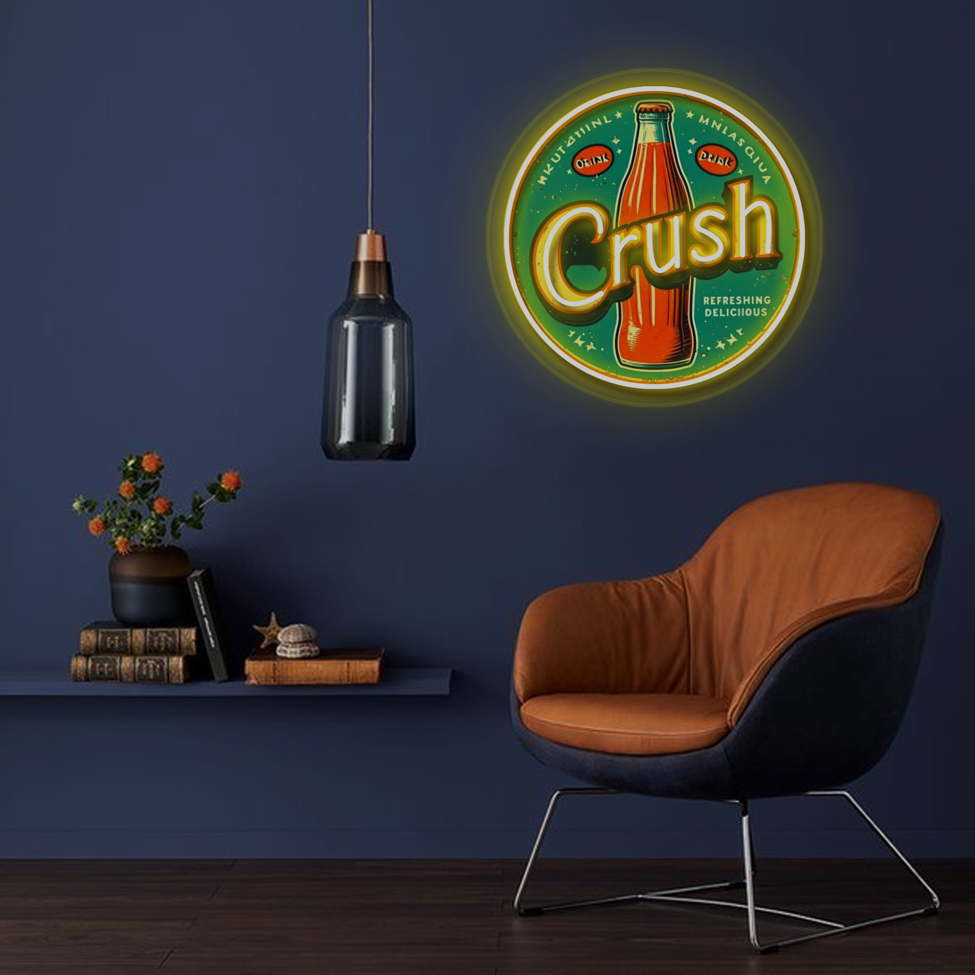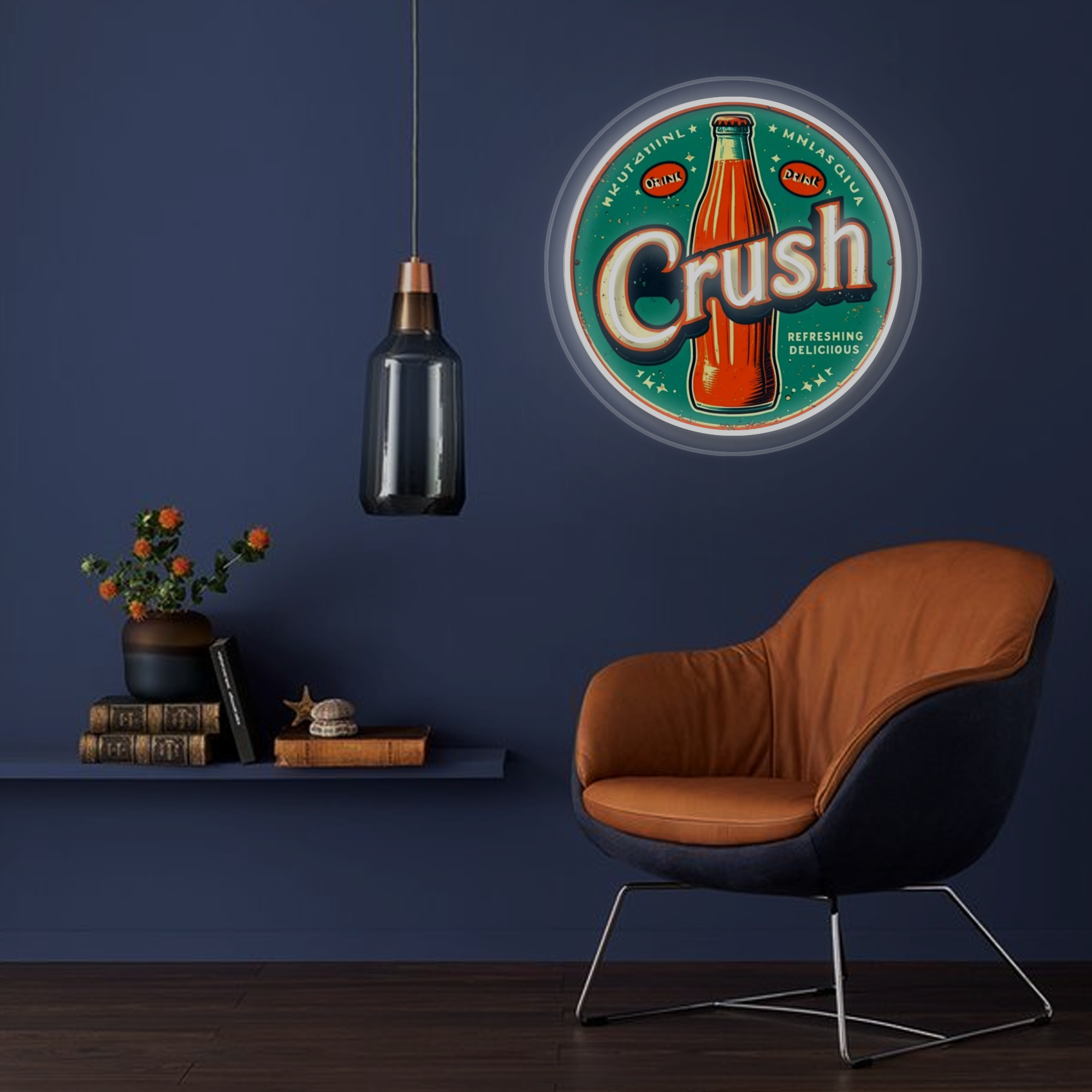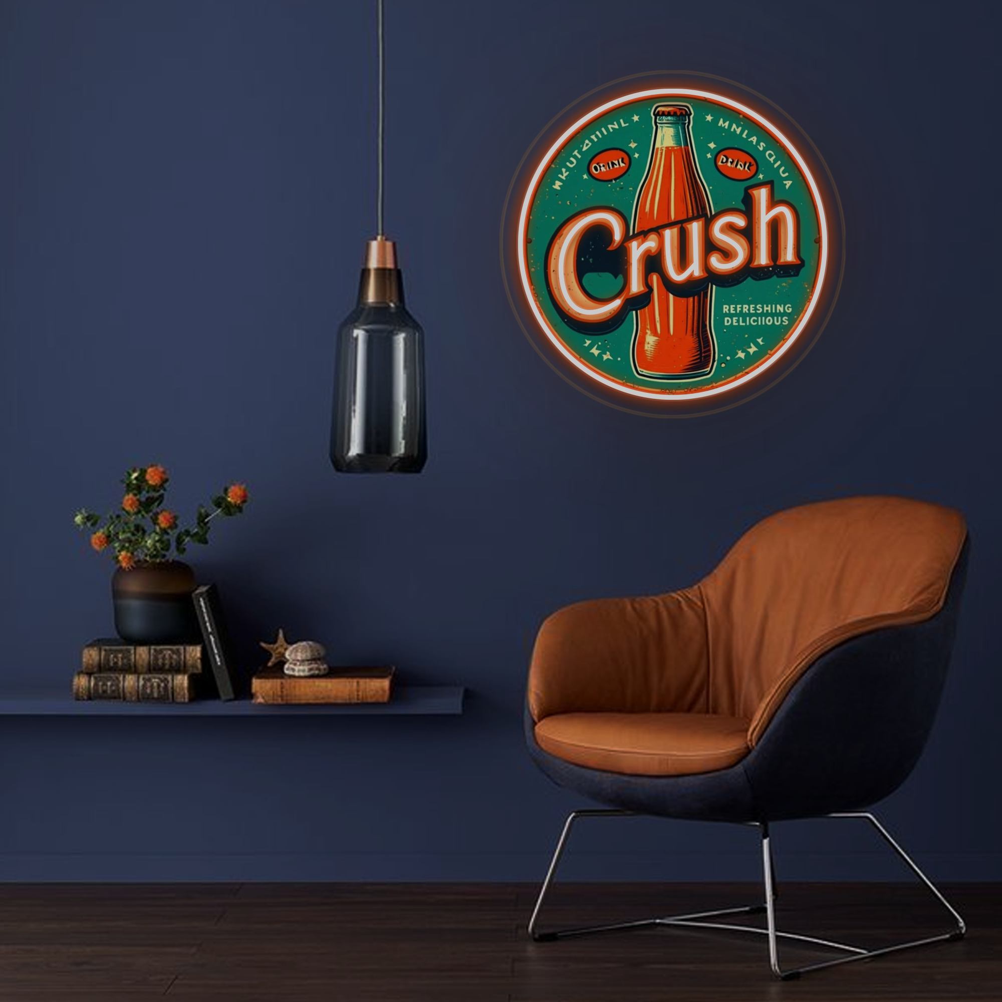 Vintage-Inspired Design: This eye-catching sign features a classic circular neon frame surrounding a vibrant, UV-printed illustration of an iconic orange Crush soda bottle. The bold “Crush” lettering and period-accurate graphics are expertly crafted to evoke a strong sense of nostalgia and mid-century Americana.