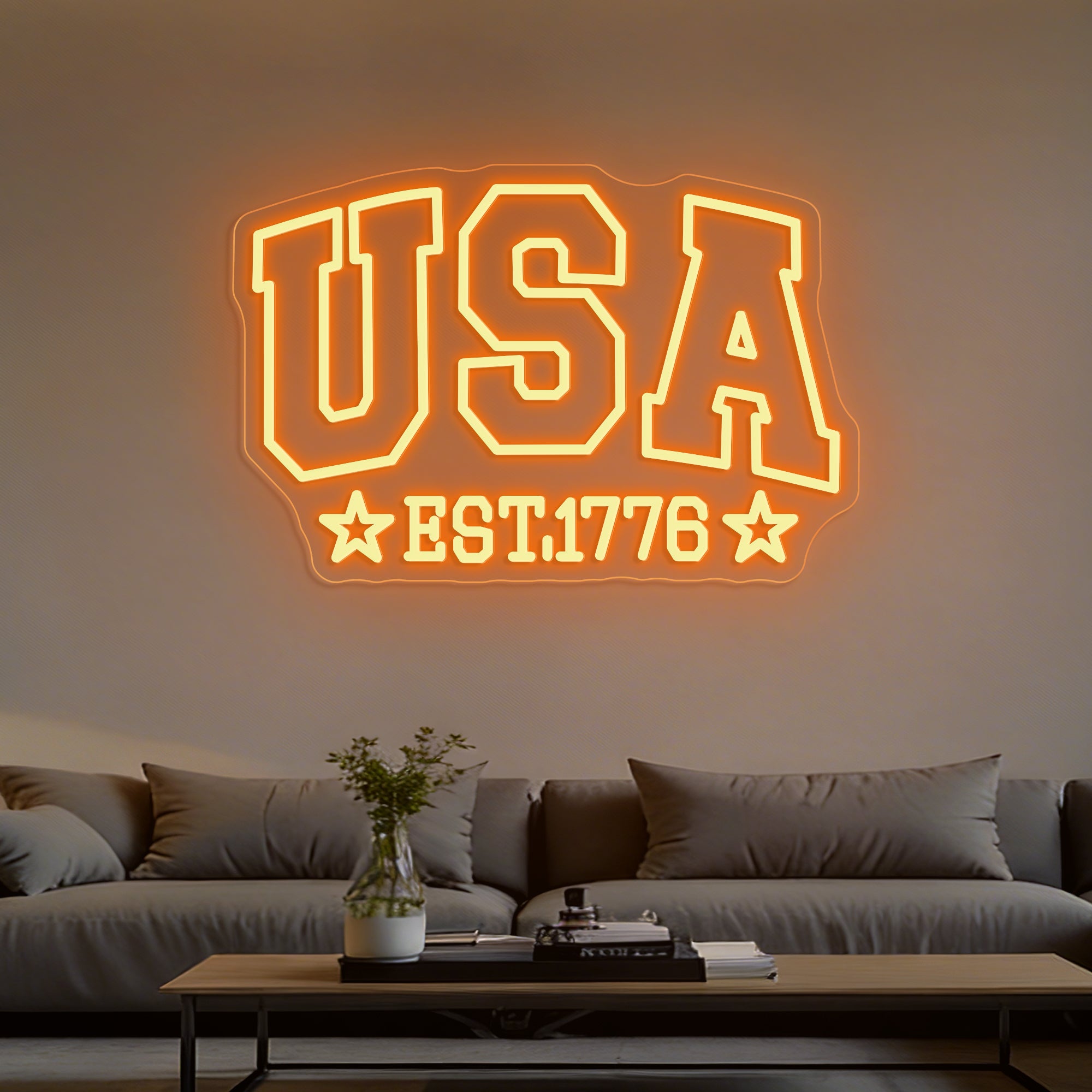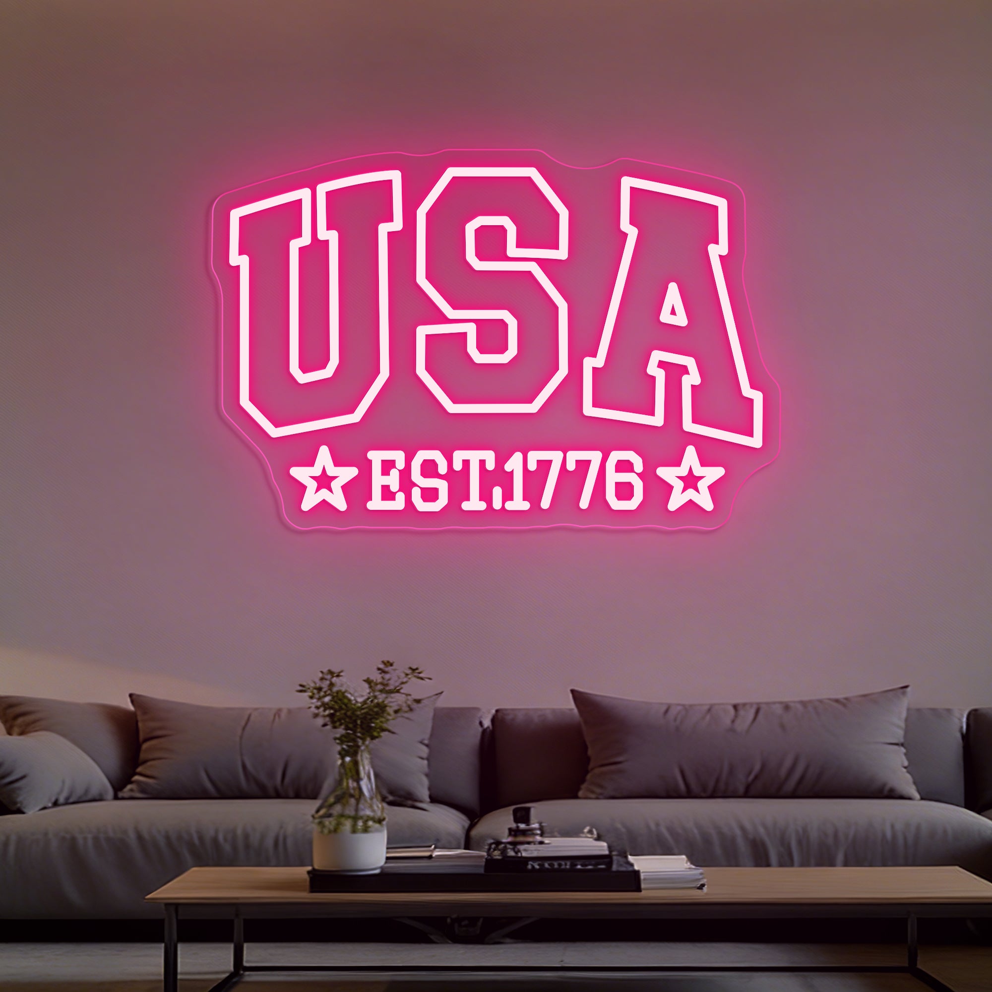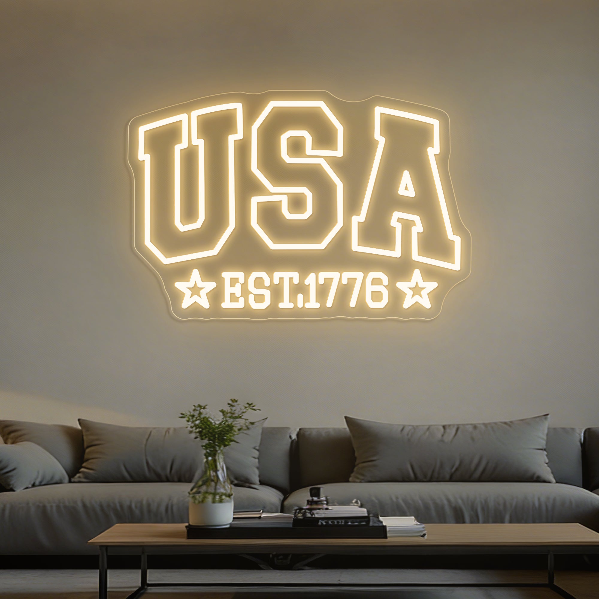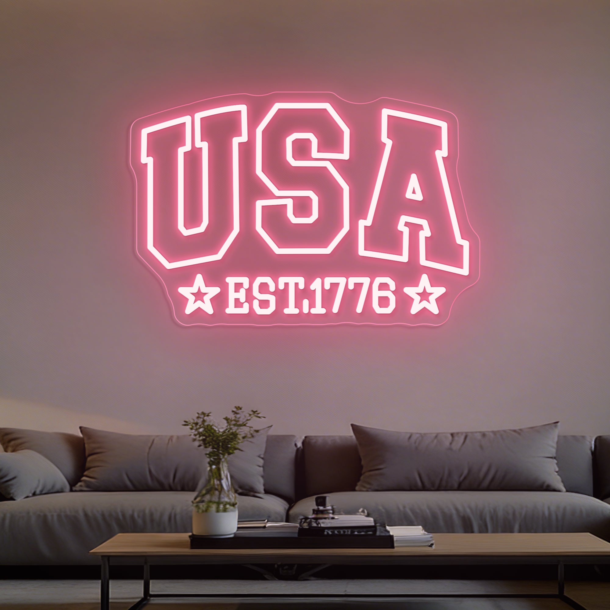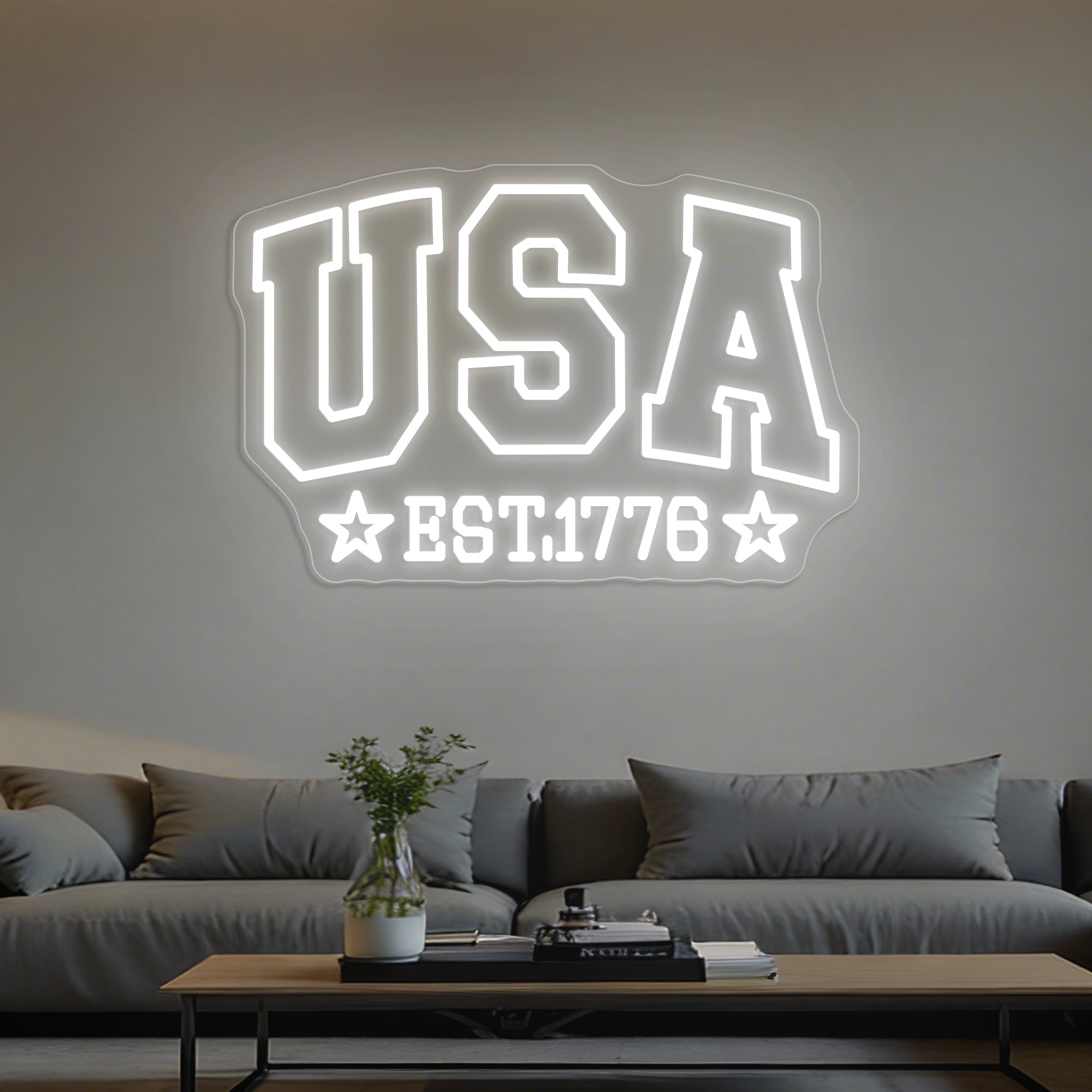 Patriotic & Historical Design: This bold sign is a striking tribute to American heritage and pride. The top features a strong, dual-line “USA” in a classic block font, representing the nation’s modern identity. Centered below is the foundational “EST 1776”, marking the historic year of independence. Flanking the date on both sides are two prominent five-pointed stars, completing a balanced and powerful composition. Expertly crafted in crisp LED neon, this design visually connects the nation’s birth to its enduring symbol—the star—creating a clean, iconic, and deeply patriotic statement.