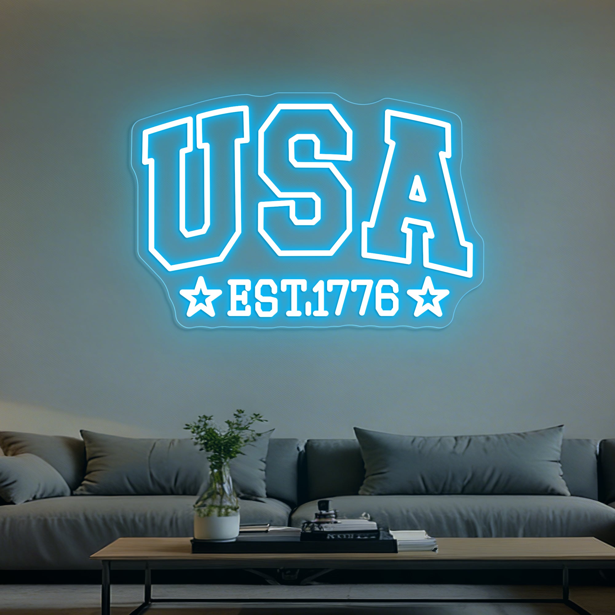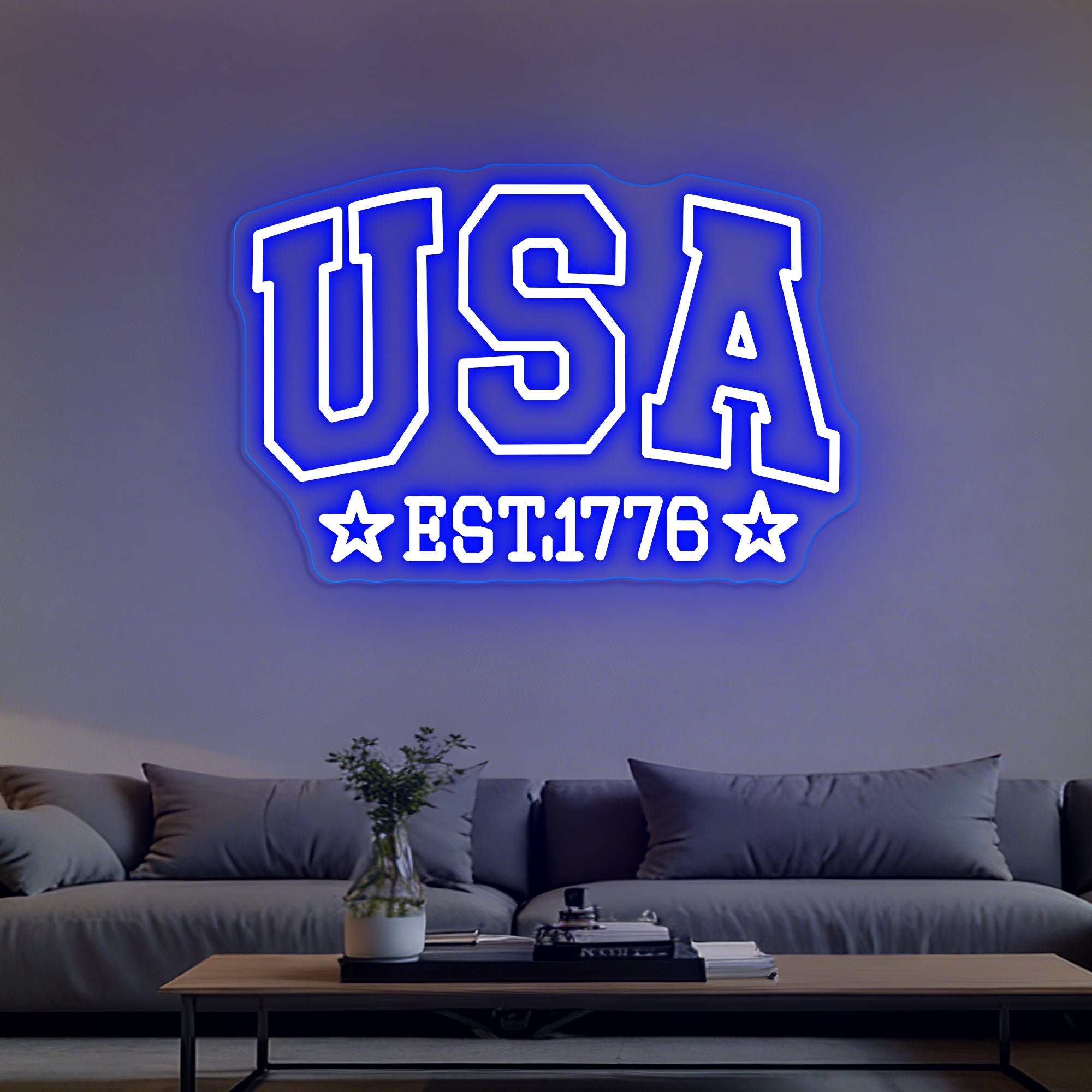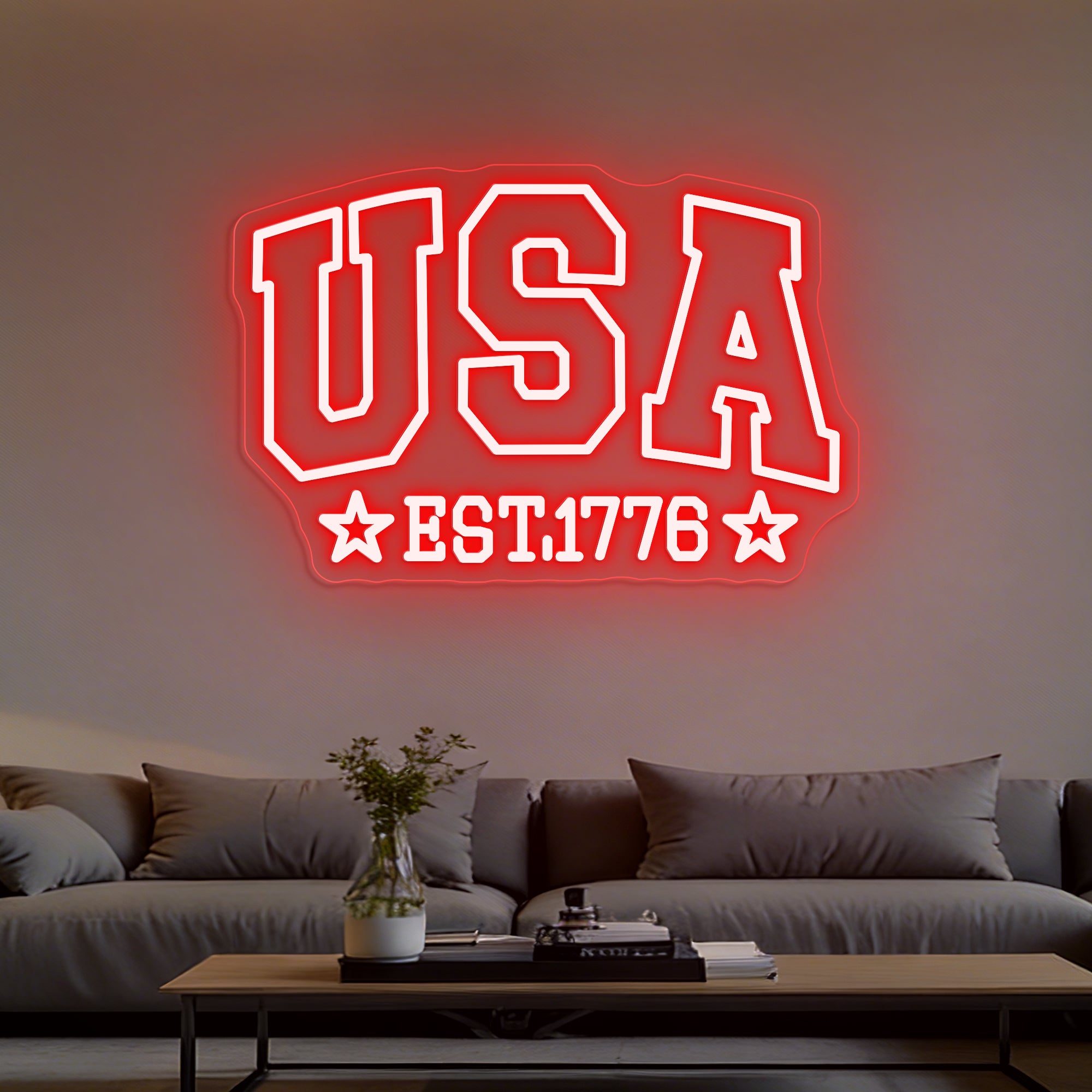 Classic Patriotic Glow: Emits a bright, proud light in the nation’s iconic colors. The design typically shines in a vibrant red for “USA” and the stars, a brilliant white for the dual outlines and “EST”, and a deep blue often used as a backplate or accent color, evoking the American flag. This bold, high-contrast illumination creates a spirited and dignified atmosphere, casting a light that feels both historic and celebratory.